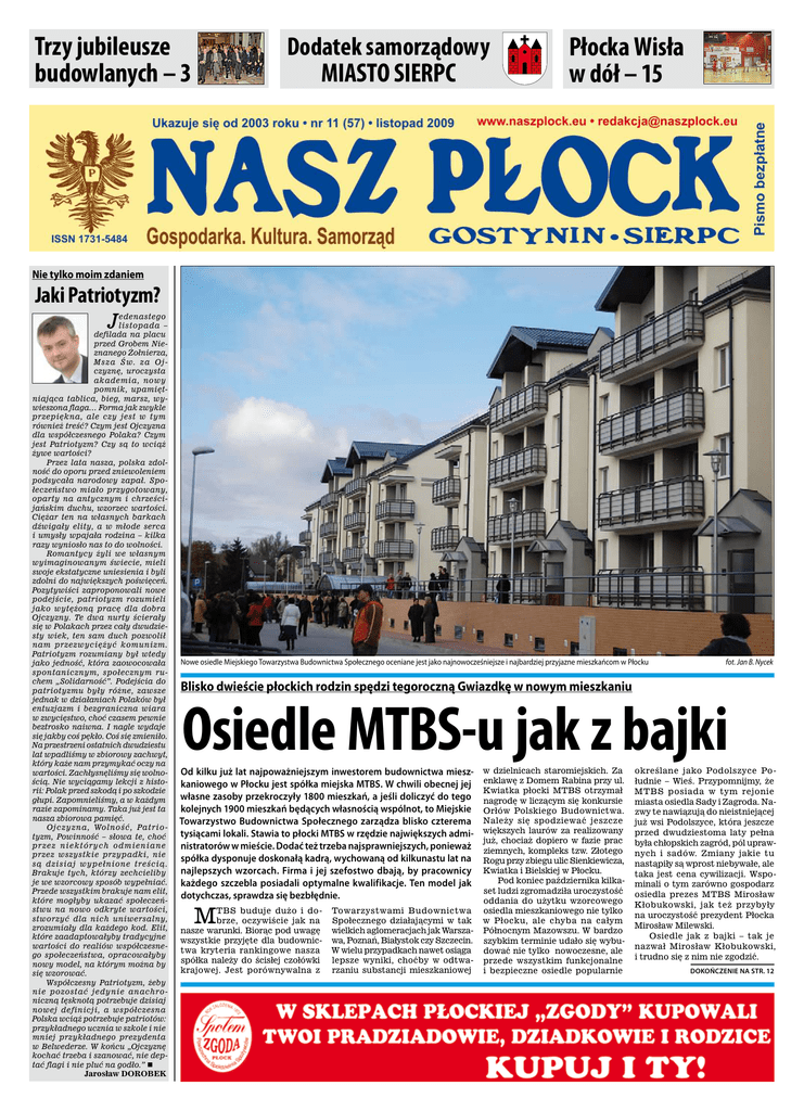 Trzy jubileusze budowlanych – 3 Dodatek samorządowy MIASTO SIERPC Płocka Wisła w dół – 15 Nie tylko moim zdaniem Jaki Patriotyzm? J edenastego listopada – defilada na placu przed Grobem Nieznanego Żołnierza, Msza Św. za Ojczyznę, uroczysta akademia, nowy pomnik, upamiętniająca tablica, bieg, marsz, wywieszona flaga… Forma jak zwykle przepiękna, ale czy jest w tym również treść? Czym jest Ojczyzna dla współczesnego Polaka? Czym jest Patriotyzm? Czy są to wciąż żywe wartości? Przez lata nasza, polska zdolność do oporu przed zniewoleniem podsycała narodowy zapał. Społeczeństwo miało przygotowany, oparty na antycznym i chrześcijańskim duchu, wzorzec wartości. Ciężar ten na własnych barkach dźwigały elity, a w młode serca i umysły wpajała rodzina – kilka razy wyniosło nas to do wolności. Romantycy żyli we własnym wyimaginowanym świecie, mieli swoje ekstatyczne uniesienia i byli zdolni do największych poświęceń. Pozytywiści zaproponowali nowe podejście, patriotyzm rozumieli jako wytężoną pracę dla dobra Ojczyzny. Te dwa nurty ścierały się w Polakach przez cały dwudziesty wiek, ten sam duch pozwolił nam przezwyciężyć komunizm. Patriotyzm rozumiany był wtedy jako jedność, która zaowocowała spontanicznym, społecznym ruchem „Solidarność”. Podejścia do patriotyzmu były różne, zawsze jednak w działaniach Polaków był entuzjazm i bezgraniczna wiara w zwycięstwo, choć czasem pewnie beztrosko naiwna. I nagle wydaje się jakby coś pękło. Coś się zmieniło. Na przestrzeni ostatnich dwudziestu lat wpadliśmy w zbiorowy zachwyt, który każe nam przymykać oczy na wartości. Zachłysnęliśmy się wolnością. Nie wyciągamy lekcji z historii: Polak przed szkodą i po szkodzie głupi. Zapomnieliśmy, a w każdym razie zapominamy. Taka już jest ta nasza zbiorowa pamięć. Ojczyzna, Wolność, Patrio tyzm, Powinność – słowa te, choć przez niektórych odmieniane przez wszystkie przypadki, nie są dzisiaj wypełnione treścią. Brakuje tych, którzy zechcieliby je we wzorcowy sposób wypełniać. Przede wszystkim brakuje nam elit, które mogłyby ukazać społeczeństwu na nowo odkryte wartości, stworzyć dla nich uniwersalny, zrozumiały dla każdego kod. Elit, które zaadaptowałyby tradycyjne wartości do realiów współczesnego społeczeństwa, opracowałyby nowy model, na którym można by się wzorować. Współczesny Patriotyzm, żeby nie pozostać jedynie anachro niczną tęsknotą potrzebuje dzisiaj nowej definicji, a współczesna Polska wciąż potrzebuje patriotów: przykładnego ucznia w szkole i nie mniej przykładnego prezydenta w Belwederze. W końcu „Ojczyznę kochać trzeba i szanować, nie deptać flagi i nie pluć na godło.” n Jarosław Dorobek Nowe osiedle Miejskiego Towarzystwa Budownictwa Społecznego oceniane jest jako najnowocześniejsze i najbardziej przyjazne mieszkańcom w Płocku fot. Jan B. Nycek Blisko dwieście płockich rodzin spędzi tegoroczną Gwiazdkę w nowym mieszkaniu Osiedle MTBS-u jak z bajki Od kilku już lat najpoważniejszym inwestorem budownictwa mieszkaniowego w Płocku jest spółka miejska MTBS. W chwili obecnej jej własne zasoby przekroczyły 1800 mieszkań, a jeśli doliczyć do tego kolejnych 1900 mieszkań będących własnością wspólnot, to Miejskie Towarzystwo Budownictwa Społecznego zarządza blisko czterema tysiącami lokali. Stawia to płocki MTBS w rzędzie największych administratorów w mieście. Dodać też trzeba najsprawniejszych, ponieważ spółka dysponuje doskonałą kadrą, wychowaną od kilkunastu lat na najlepszych wzorcach. Firma i jej szefostwo dbają, by pracownicy każdego szczebla posiadali optymalne kwalifikacje. Ten model jak dotychczas, sprawdza się bezbłędnie. M TBS buduje dużo i dobrze, oczywiście jak na nasze warunki. Biorąc pod uwagę wszystkie przyjęte dla budownictwa kryteria rankingowe nasza spółka należy do ścisłej czołówki krajowej. Jest porównywalna z Towarzystwami Budownictwa Społecznego działającymi w tak wielkich aglomeracjach jak Warszawa, Poznań, Białystok czy Szczecin. W wielu przypadkach nawet osiąga lepsze wyniki, choćby w odtwarzaniu substancji mieszkaniowej w dzielnicach staromiejskich. Za enklawę z Domem Rabina przy ul. Kwiatka płocki MTBS otrzymał nagrodę w liczącym się konkursie Orłów Polskiego Budownictwa. Należy się spodziewać jeszcze większych laurów za realizowany już, chociaż dopiero w fazie prac ziemnych, kompleks tzw. Złotego Rogu przy zbiegu ulic Sienkiewicza, Kwiatka i Bielskiej w Płocku. Pod koniec października kilkaset ludzi zgromadziła uroczystość oddania do użytku wzorcowego osiedla mieszkaniowego nie tylko w Płocku, ale chyba na całym Północnym Mazowszu. W bardzo szybkim terminie udało się wybudować nie tylko nowoczesne, ale przede wszystkim funkcjonalne i bezpieczne osiedle popularnie określane jako Podolszyce Południe – Wieś. Przypomnijmy, że MTBS posiada w tym rejonie miasta osiedla Sady i Zagroda. Nazwy te nawiązują do nieistniejącej już wsi Podolszyce, która jeszcze przed dwudziestoma laty pełna była chłopskich zagród, pól uprawnych i sadów. Zmiany jakie tu nastąpiły są wprost niebywałe, ale taka jest cena cywilizacji. Wspominali o tym zarówno gospodarz osiedla prezes MTBS Mirosław Kłobukowski, jak też przybyły na uroczystość prezydent Płocka Mirosław Milewski. Osiedle jak z bajki – tak je nazwał Mirosław Kłobukowski, i trudno się z nim nie zgodzić. dokończenie na str. 12 2 Wydarzenia listopad 2009 • nr 11(57) • Nasz Płock Przebudowa drogi w rekordowym tempie pięciu miesięcy Mała obwodnica Płocka już otwarta W piątek 13 listopada, Adam Struzik marszałek województwa mazowieckiego wziął udział w przekazaniu przebudowanej drogi wojewódzkiej nr 568, na odcinku Goślice–Ciółkowo. Podczas uroczystości obecni byli Michał Boszko, starosta płocki, Jan Mączewski, starosta 