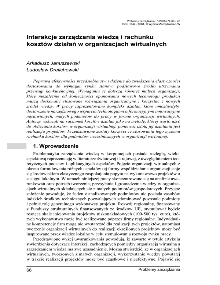Problemy zarządzania, 1/2005 (7): 66 - 78 ISSN 1644 - 9584, © Wydział Zarządzania UW Interakcje zarządzania wiedzą i rachunku kosztów działań w organizacjach wirtualnych Arkadiusz Januszewski Ludosław Drelichowski Poprawa efektywności przedsiębiorstw i dążenie do zwiększenia elastyczności dostosowania do wymagań rynku stanowi podstawowe źródło utrzymania przewagi konkurencyjnej. Wymagania te dotyczą również małych organizacji, które niezależnie od konieczności opanowania nowych technologii produkcji muszą doskonalić stosowane rozwiązania organizacyjne i korzystać z nowych źródeł wiedzy. W pracy zaprezentowano kompleks działań, które umożliwiłyby dostarczenie narzędziowego wsparcia technologiami informacyjnymi innowacyjnie nastawionych, małych podmiotów do pracy w formie organizacji wirtualnych. Autorzy wskazali na rachunek kosztów działań jako na metodę, której warto użyć do obliczania kosztów w organizacji wirtualnej, ponieważ istotą jej działania jest realizacja projektów. Przedstawione zostały korzyści ze stosowania tego systemu rachunku kosztów dla podmiotów uczestniczących w organizacji wirtualnej. 1. Wprowadzenie Problematyka zarządzania wiedzą w korporacjach posiada rozległą, wieloaspektową reprezentację w literaturze światowej i krajowej, z uwzględnieniem teoretycznych podstaw i aplikacyjnych aspektów. Pojęcie organizacji wirtualnych z okresu formułowania różnych aspektów tej formy współdziałania organizacji staje się środowiskiem elastycznego zaspokajania popytu na wykonawstwo projektów o zasięgu lokalnym. W ramach niniejszej pracy skoncentrowano się na analizie uwarunkowań oraz potrzeb tworzenia, przesyłania i gromadzenia wiedzy w organizacjach wirtualnych składających się z małych podmiotów gospodarczych. Przyjęte założenie powoduje, że żaden z analizowanych podmiotów nie posiada zasobów ludzkich środków technicznych pozwalających zdominować pozostałe podmioty i pełnić rolę generalnego wykonawcy projektu. Rozwój regionalny, finansowany z Funduszy strukturalnych finansowanych ze środków UE, stymulował będzie rosnącą skalę inicjowania projektów niskonakładowych (100-500 tys. euro), których wykonawstwo może być realizowane poprzez firmy regionalne. Indywidualne kompetencje firm mogą nie wystarczać dla realizacji tych projektów, natomiast tworzenie organizacji wirtualnych do realizacji określonych projektów może być inspirowane przez władze lokalne w celu stymulowania rozwoju rynku pracy. Przedstawione wyżej uwarunkowania powodują, iż zawarte w tytule artykułu stwierdzenia dotyczące interakcji zachodzących pomiędzy organizacją wirtualną a zarządzaniem wiedzą ma swe uzasadnienie. Można stwierdzić, że w organizacjach wirtualnych, tworzonych z małych organizacji, wykorzystanie wiedzy powstałej w trakcie realizacji projektów może być cząstkowe i nieefektywne. Pojawić się 66 Problemy zarządzania