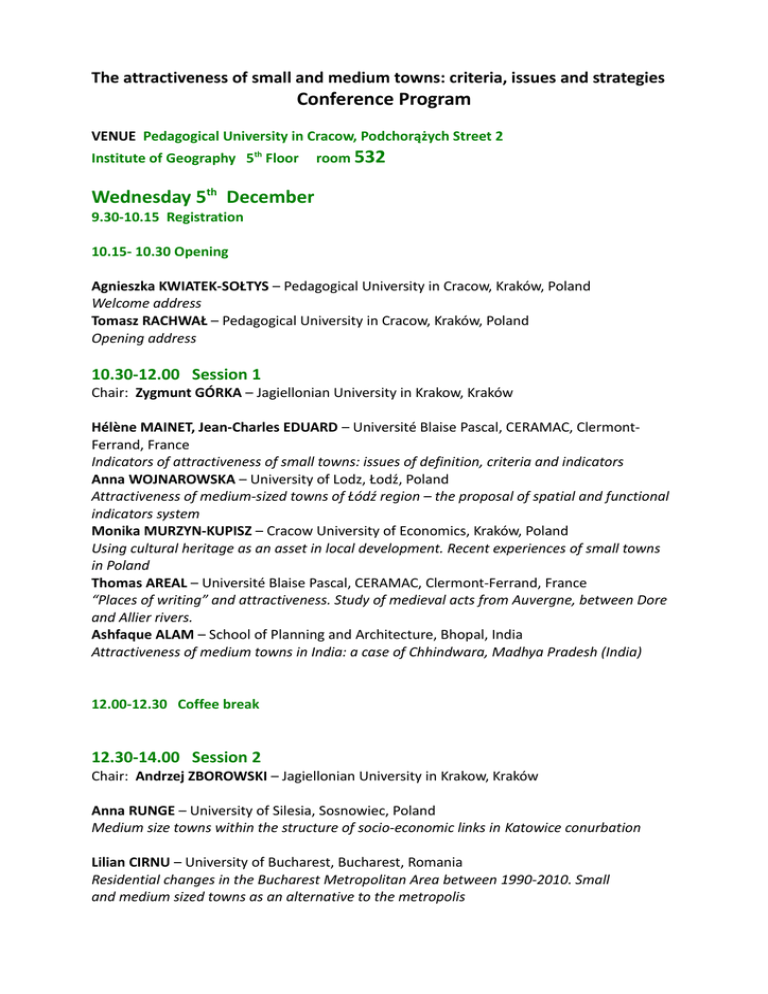 The attractiveness of small and medium towns: criteria, issues and strategies Conference Program VENUE Pedagogical University in Cracow, Podchorążych Street 2 Institute of Geography 5th Floor room 532 Wednesday 5th December 9.30-10.15 Registration 10.15- 10.30 Opening Agnieszka KWIATEK-SOŁTYS – Pedagogical University in Cracow, Kraków, Poland Welcome address Tomasz RACHWAŁ – Pedagogical University in Cracow, Kraków, Poland Opening address 10.30-12.00 Session 1 Chair: Zygmunt GÓRKA – Jagiellonian University in Krakow, Kraków Hélène MAINET, Jean-Charles EDUARD – Université Blaise Pascal, CERAMAC, ClermontFerrand, France Indicators of attractiveness of small towns: issues of definition, criteria and indicators Anna WOJNAROWSKA – University of Lodz, Łodź, Poland Attractiveness of medium-sized towns of Łódź region – the proposal of spatial and functional indicators system Monika MURZYN-KUPISZ – Cracow University of Economics, Kraków, Poland Using cultural heritage as an asset in local development. Recent experiences of small towns in Poland Thomas AREAL – Université Blaise Pascal, CERAMAC, Clermont-Ferrand, France “Places of writing” and attractiveness. Study of medieval acts from Auvergne, between Dore and Allier rivers. Ashfaque ALAM – School of Planning and Architecture, Bhopal, India Attractiveness of medium towns in India: a case of Chhindwara, Madhya Pradesh (India) 12.00-12.30 Coffee break 12.30-14.00 Session 2 Chair: Andrzej ZBOROWSKI – Jagiellonian University in Krakow, Kraków Anna RUNGE – University of Silesia, Sosnowiec, Poland Medium size towns within the structure of socio-economic links in Katowice conurbation Lilian CIRNU – University of Bucharest, Bucharest, Romania Residential changes in the Bucharest Metropolitan Area between 1990-2010. Small and medium sized towns as an alternative to the metropolis Sergey ELAGIN – Peoples' Friendship University of Russia, Moscow, Russia The cities around Moscow and expansion of the Moscow agglomeration Barbara KONECKA-SZYDŁOWSKA – Adam Mickiewicz University, Poznań, Poland Socio-economic situation of small towns of the Poznań agglomeration Ekaterina Anatolevna ANTIPOVA, Liudmila Vladimirovna FAKEYEVA – Belarusian State University, Minsk, Belarus Functional profile of small towns of Belarus 14.00-15.00 Lunch 15.00-16.30 Session 3 Chair: Mirosław WÓJTOWICZ – Pedagogical University in Cracow, Kraków Sylvain RACAUD – University of Toulouse, Toulouse, France Urbanization in east African mountains: Role of the urban system in the organisation of flows, role of the flows in the organization of the urban system (Uporoto mountains, Mbeya region, Tanzania) Mike IRAVO – Jomo Kenyatta University of Agriculture and Technology, Juja, Kenya Ephantus KIHONGE – Université Blaise Pascal, Clermont-Ferrand, France, France Secondary towns and rural interactions in Eastern Africa:SMEs in small mountainous towns and rural economic growth Milham CHAZE – Université Blaise Pascal, CERAMAC, Clermont-Ferrand, France The commercial relationships between small towns and their rural environment. A case study of the Middle East of France Barbara MACKIEWICZ, Ewa KACPRZAK – Adam Mickiewicz University, Poznań, Poland Supporting the development of a network of markets in small and medium-sized cities in Poland using the Rural Development Programme 2007-2013 (programme "My Market") 19.30 Gala Dinner Thursday 6th December 9.30-11.00 Session 4 Chair: Radosław ULISZAK – Pedagogical University in Cracow, Kraków Cristina FARCASIU – University of Angers, Angers, France Small and medium towns in the West of Romania: new dynamics and functions Tatiana KREYDENKO , Irina RODIONOVA, Uliana MIZEROVSKAYA – Peoples' Friendship University of Russia, Moscow, Russia Monogoroda in the conditions of crisis and prospect of their development in modern Russia Jarosław DZIAŁEK, Krzysztof GWOSDZ – Jagiellonian University, Krakow, Poland Economic activity zones as a tool of strengthening of attractiveness of small and medium towns in Malopolska region Sławomir DOROCKI, Marta BOGUŚ – Pedagogical University in Cracow, Kraków, Poland Jan Paweł JASTRZĘBSKI – University of Warmia and Mazury in Olsztyn, Olsztyn, Poland Biotechnology in European towns 11.00-11.30 Coffee break 11.30-13.00 Session 5 Chair: Sławomir KUREK – Pedagogical University in Cracow, Kraków Marie FERRU, Benjamin GUIMOND, Josselin TALLEC – Laboratoire CRIEF, Poitiers, France Globalization and economic trajectories of small and medium-sized cities: empirical regularities and differencies Georgiana EPURE, Daniel RICARD – Université Blaise Pascal, CERAMAC, Clermont-Ferrand, France The attractiveness of secondary cities in Central Europe. Some elements of comparison between Romania and Slovakia. The case of Braila Area and the Upper Váh River Valley Valentin NEMES, Emil Paul OLAU – University of Oradea, Oradea, Romania Formal and informal planning instruments as catalyst for urban attractiveness. Enhancing town attractiveness in Beius Land, Romania Barbara MACKIEWICZ, Ewa KACPRZAK – Adam Mickiewicz University, Poznań, Poland Turnover of undeveloped land located in the area of small towns nearby a large suburban town center Bernard CALAS – Universite Michel de Montaigne, Bordeaux, France Urbanization processes in Kenya have now gone beyond mere macrocephalia and primacy 13.00-14.00 Lunch 14.00-16.00 Session 6 Chair: Witold WILCZYŃSKI – Pedagogical University in Cracow, Kraków, Poland Elżbieta ZUZAŃSKA-ŻYŚKO, Sławomir SITEK – University of Silesia, Sosnowiec, Poland The small towns in Silesia Region in the context of commuting to work Wioletta SZYMAŃSKA – Pomeranian University in Słupsk, Słupsk, Poland Housing attractiveness of the medium-sized cities in Pomerania in light of the ecentralization theory Valerie JOUSSEAUME – Universite de Nante, Nante, France Magali TALANDIER – Universite Joseph Fourier de Grenoble,