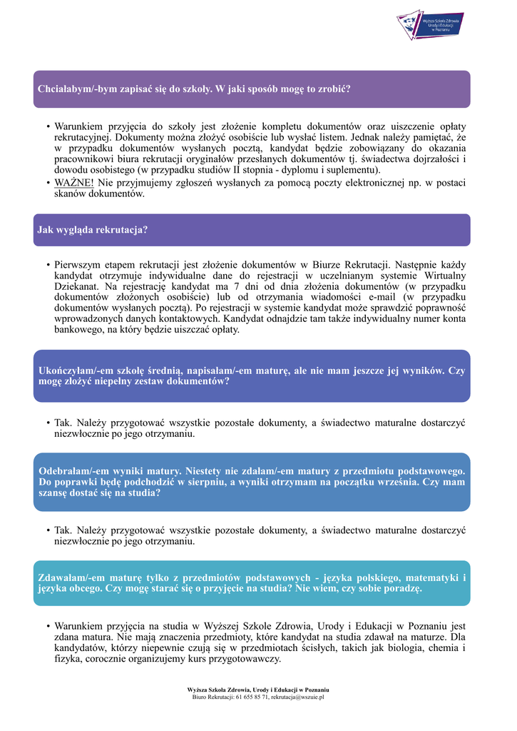 Chciałabym/-bym zapisać się do szkoły. W jaki sposób mogę to zrobić? • Warunkiem przyjęcia do szkoły jest złożenie kompletu dokumentów oraz uiszczenie opłaty rekrutacyjnej. Dokumenty można złożyć osobiście lub wysłać listem. Jednak należy pamiętać, że w przypadku dokumentów wysłanych pocztą, kandydat będzie zobowiązany do okazania pracownikowi biura rekrutacji oryginałów przesłanych dokumentów tj. świadectwa dojrzałości i dowodu osobistego (w przypadku studiów II stopnia - dyplomu i suplementu). • WAŻNE! Nie przyjmujemy zgłoszeń wysłanych za pomocą poczty elektronicznej np. w postaci skanów dokumentów. Jak wygląda rekrutacja? • Pierwszym etapem rekrutacji jest złożenie dokumentów w Biurze Rekrutacji. Następnie każdy kandydat otrzymuje indywidualne dane do rejestracji w uczelnianym systemie Wirtualny Dziekanat. Na rejestrację kandydat ma 7 dni od dnia złożenia dokumentów (w przypadku dokumentów złożonych osobiście) lub od otrzymania wiadomości e-mail (w przypadku dokumentów wysłanych pocztą). Po rejestracji w systemie kandydat może sprawdzić poprawność wprowadzonych danych kontaktowych. Kandydat odnajdzie tam także indywidualny numer konta bankowego, na który będzie uiszczać opłaty. Ukończyłam/-em szkołę średnią, napisałam/-em maturę, ale nie mam jeszcze jej wyników. Czy mogę złożyć niepełny zestaw dokumentów? • Tak. Należy przygotować wszystkie pozostałe dokumenty, a świadectwo maturalne dostarczyć niezwłocznie po jego otrzymaniu. Odebrałam/-em wyniki matury. Niestety nie zdałam/-em matury z przedmiotu podstawowego. Do poprawki będę podchodzić w sierpniu, a wyniki otrzymam na początku września. Czy mam szansę dostać się na studia? • Tak. Należy przygotować wszystkie pozostałe dokumenty, a świadectwo maturalne dostarczyć niezwłocznie po jego otrzymaniu. Zdawałam/-em maturę tylko z przedmiotów podstawowych - języka polskiego, matematyki i języka obcego. Czy mogę starać się o przyjęcie na studia? Nie wiem, czy sobie poradzę. • Warunkiem przyjęcia na studia w Wyższej Szkole Zdrowia, Urody i Edukacji w Poznaniu jest zdana matura. Nie mają znaczenia przedmioty, które kandydat na studia zdawał na maturze. Dla kandydatów, którzy niepewnie czują się w przedmiotach ścisłych, takich jak biologia, chemia i fizyka, corocznie organizujemy kurs przygotowawczy. Wyższa Szkoła Zdrowia, Urody i Edukacji w Poznaniu Biuro Rekrutacji: 61 655 85 71, [email protected] W celu otrzymania legitymacji studenckiej należy wyrobić również 1 zdjęcie w formacie elektronicznym. Co to jest zdjęcie elektroniczne, jak je umieścić w systemie i w jakim czasie? Czym różni się ono od zdjęcia w formacie tradycyjnym, które należy dostarczyć wraz z pozostałymi dokumentami rekrutacyjnymi? • Zdjęcie w formacie elektronicznym to nic innego jak zdjęcie zapisane na nośniku danych (np. płyta CD, pendrive). Zdjęcie takie można wykonać praktycznie u każdego fotografa. • Na potrzeby rekrutacji w WSZUiE wymagane jest zdjęcie o wymiarach 236 x 295 pikseli, 300 dpi. Musi ono spełniać wymagania obowiązujące przy wydawaniu dokumentów osobistych. • Zdjęcie będzie potrzebne do wytworzenia elektronicznej legitymacji studenckiej. Każdy kandydat po złożeniu dokumentów otrzymuje indywidualne dane do rejestracji w uczelnianym systemie dziekanatowym, do którego, po utworzeniu swojego konta, powinien wgrać zdjęć w formacie elektronicznym. Dlatego zdjęcia na płycie nie należy dostarczać wraz z pozostałymi dokumentami. • Zdjęcie należy wgrać przechodząc do zakładki moje dane – edycja – fotografia. • Zdjęcie w formacie elektronicznym należy wgrać najpóźniej do 31 sierpnia. W przypadku wgrania zdjęcia po wyznaczonym terminie, legitymacja może być wyrobiona z opóźnieniem. • Natomiast zdjęcie w formacie tradycyjnym, które należy złożyć wraz z pozostałymi dokumentami rekrutacyjnymi potrzebne jest do teczki akt osobowych. Zgodnie z rozporządzeniem ministra nauki i szkolnictwa wyższego każdy kandydat musi dostarczyć taką fotografię. Czym jest wyprawka? Co wchodzi w jej skład? • Wyprawka to strój oraz narzędzia dla studentów kosmetologii studiów licencjackich wymagane na zajęciach praktycznych. Ważne jest, aby dokładnie i zgodnie z prawdą wypełnić formularz, na którym zaznaczane są rozmiary odzieży. Na podstawie nich zostanie uszyty strój (spodnie i fartuszek). Wyprawka jest własnością studenta. Wymiary w tabeli na formularzu można dowolnie zaznaczać z różnych rozmiarów, np. obwód biustu – B, obwód talii – C, obwód bioder – B. Jestem kandydatką na studia licencjackie z kosmetologii. W związku z tym muszę opłacić kwotę 200 zł za wyprawkę i opłatę rekrutacyjna w wysokości 80 zł. Jak mam dokonać wpłaty? • Opłatę należy wnieść na indywidualne konto bankowe, którego numer można znaleźć na koncie w systemie Wirtualny Dziekanat. Dane do rejestracji w systemie kandydaci otrzymują po złożeniu dokumentów. Kiedy dowiem się, czy zostałam/ - em przyjęty na studia? • Warunkiem przyjęcia do Wyższej Szkoły Zdrowia, Urody i Edukacji w Poznaniu jest złożenie kompletu dokumentów rekrutacyjnych oraz uiszczenie opłaty rekrutacyjnej. W momencie spełnienia obu warunków kandydat ma zagwarantowane miejsce na studiach. WSZUiE nie publikuje list rankingowych. Czy absolwenci studiów wyższych na kierunku innym, niż kosmetologia, mogą podjąć naukę na studiach II stopnia w Wyższej Szkole Zdrowia, Urody i Edukacji? • Tak. Studia II stopnia na kierunku kosmetologia mogą podjąć absolwenci dowolnego kierunku, co umożliwi im zdobycie nowego zawodu. Warunkiem jest uzupełnienie różnić programowych. Szczegółowych informacji na ten temat udziela Dział Rekrutacji (61 655 85 71, [email protected]). Wyższa Szkoła Zdrowia, Urody i Edukacji w Poznaniu Biuro Rekrutacji: 61 655 85 71