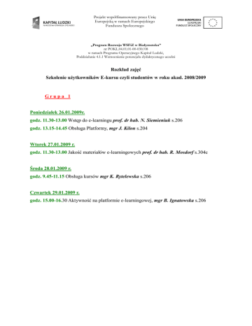Projekt współfinansowany przez Unię Europejską w ramach Europejskiego Funduszu Społecznego „Program Rozwoju WSFiZ w Białymstoku” nr POKL.04.01.01-00-030/08 w ramach Programu Operacyjnego Kapitał Ludzki, Poddziałanie 4.1.1 Wzmocnienie potencjału dydaktycznego uczelni Rozkład zajęć Szkolenie użytkowników E-kursu czyli studentów w roku akad. 2008/2009 Grupa 1 Poniedziałek 26.01.2009r. godz. 11.30-13.00 Wstęp do e-learningu prof. dr hab. N. Siemieniuk s.206 godz. 13.15-14.45 Obsługa Platformy, mgr J. Kilon s.204 Wtorek 27.01.2009 r. godz. 11.30-13.00 Jakość materiałów e-learningowych prof. dr hab. R. Mosdorf s.304c Środa 28.01.2009 r. godz. 9.45-11.15 Obsługa kursów mgr K. Rytelewska s.206 Czwartek 29.01.2009 r. godz. 15.00-16.30 Aktywność na platformie e-learningowej, mgr B. Ignatowska s.206 Projekt współfinansowany przez Unię Europejską w ramach Europejskiego Funduszu Społecznego „Program Rozwoju WSFiZ w Białymstoku” nr POKL.04.01.01-00-030/08 w ramach Programu Operacyjnego Kapitał Ludzki, Poddziałanie 4.1.1 Wzmocnienie potencjału dydaktycznego uczelni Rozkład zajęć Szkolenie użytkowników E-kursu czyli studentów w roku akad. 2008/2009 Grupa 2 Poniedziałek 26.01.2009 r. godz. 8.00-9.30 Wstęp do e-learningu prof. dr hab. N. Siemieniuk s.206 godz. 11.30-13.00 Obsługa Platformy, mgr J. Kilon s.204 Wtorek 27.01.2009 r. godz. 13.15-14.45 Jakość materiałów e-learningowych prof. dr hab. R. Mosdorf s.304c Środa 28.01.2009 r. godz. 16.30-18.00 Aktywność na platformie e-learningowej, mgr B. Ignatowska s.206 Czwartek 29.01.2009 r. godz. 9.45-11.15 Obsługa kursów mgr K. Rytelewska s.206 Projekt współfinansowany przez Unię Europejską w ramach Europejskiego Funduszu Społecznego „Program Rozwoju WSFiZ w Białymstoku” nr POKL.04.01.01-00-030/08 w ramach Programu Operacyjnego Kapitał Ludzki, Poddziałanie 4.1.1 Wzmocnienie potencjału dydaktycznego uczelni Rozkład zajęć Szkolenie użytkowników E-kursu czyli studentów w roku akad. 2008/2009 Grupa 3 Poniedziałek 26.01.2009 r. godz. 9.45-11.15 Wstęp do e-learningu prof. dr hab. N. Siemieniuk s.206 Wtorek 27.01.2009 r. godz. 8.00-9.30 Obsługa Platformy, mgr J. Kilon s.204 godz. 15.00-16.30 Jakość materiałów e-learningowych prof. dr hab. R. Mosdorf s.304c Środa 28.01.2009 r. godz. 8.00-9.30 Obsługa kursów mgr K. Rytelewska s.206 godz. 15.00-16.30 Aktywność na platformie e-learningowej, mgr B. Ignatowska s.206 Projekt współfinansowany przez Unię Europejską w ramach Europejskiego Funduszu Społecznego „Program Rozwoju WSFiZ w Białymstoku” nr POKL.04.01.01-00-030/08 w ramach Programu Operacyjnego Kapitał Ludzki, Poddziałanie 4.1.1 Wzmocnienie potencjału dydaktycznego uczelni Rozkład zajęć Szkolenie użytkowników E-kursu czyli studentów w roku akad. 2008/2009 Grupa 4 Poniedziałek 26.01.2009 r. godz. 13.15-14.45 Wstęp do e-learningu prof. dr hab. N. Siemieniuk s.206 Wtorek 27.01.2009 r. godz. 8.00-9.30 Jakość materiałów e-learningowych prof. dr hab. R. Mosdorf s.304c godz. 9.45-11.15 Obsługa Platformy, mgr J. Kilon s.204 Środa 28.01.2009 r. godz. 11.30-13.00 Obsługa kursów mgr K. Rytelewska s.206 Czwartek 29.01.2009 r. godz. 16.30-18.00 Aktywność na platformie e-learningowej, mgr B. Ignatowska s.206 Projekt współfinansowany przez Unię Europejską w ramach Europejskiego Funduszu Społecznego „Program Rozwoju WSFiZ w Białymstoku” nr POKL.04.01.01-00-030/08 w ramach Programu Operacyjnego Kapitał Ludzki, Poddziałanie 4.1.1 Wzmocnienie potencjału dydaktycznego uczelni Rozkład zajęć Szkolenie użytkowników E-kursu czyli studentów w roku akad. 2008/2009 Grupa 5 Wtorek 27.01.2009 r. godz. 9.45-11.15 Jakość materiałów e-learningowych prof. dr hab. R. Mosdorf s.304c Środa 28.01.2009 r. godz. 13.15-14.45 Obsługa Platformy, mgr J. Kilon s.204 Czwartek 29.01.2009 r. godz. 8.00-9.30 Wstęp do e-learningu prof. dr hab. N. Siemieniuk s.204 godz. 11.30-13.00 Obsługa kursów mgr K. Rytelewska s.206 godz. 18.00-19.30 Aktywność na platformie e-learningowej, mgr B. Ignatowska s.206