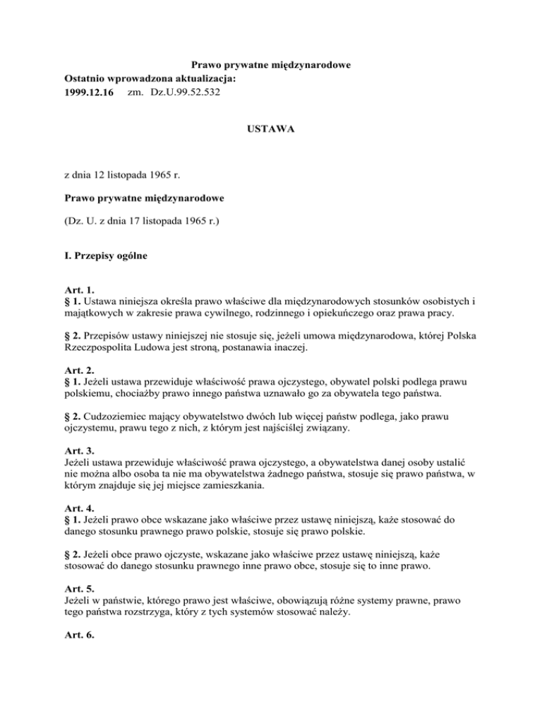 Prawo prywatne międzynarodowe Ostatnio wprowadzona aktualizacja: 1999.12.16 zm. Dz.U.99.52.532 USTAWA z dnia 12 listopada 1965 r. Prawo prywatne międzynarodowe (Dz. U. z dnia 17 listopada 1965 r.) I. Przepisy ogólne Art. 1. § 1. Ustawa niniejsza określa prawo właściwe dla międzynarodowych stosunków osobistych i majątkowych w zakresie prawa cywilnego, rodzinnego i opiekuńczego oraz prawa pracy. § 2. Przepisów ustawy niniejszej nie stosuje się, jeŜeli umowa międzynarodowa, której Polska Rzeczpospolita Ludowa jest stroną, postanawia inaczej. Art. 2. § 1. JeŜeli ustawa przewiduje właściwość prawa ojczystego, obywatel polski podlega prawu polskiemu, chociaŜby prawo innego państwa uznawało go za obywatela tego państwa. § 2. Cudzoziemiec mający obywatelstwo dwóch lub więcej państw podlega, jako prawu ojczystemu, prawu tego z nich, z którym jest najściślej związany. Art. 3. JeŜeli ustawa przewiduje właściwość prawa ojczystego, a obywatelstwa danej osoby ustalić nie moŜna albo osoba ta nie ma obywatelstwa Ŝadnego państwa, stosuje się prawo państwa, w którym znajduje się jej miejsce zamieszkania. Art. 4. § 1. JeŜeli prawo obce wskazane jako właściwe przez ustawę niniejszą, kaŜe stosować do danego stosunku prawnego prawo polskie, stosuje się prawo polskie. § 2. JeŜeli obce prawo ojczyste, wskazane jako właściwe przez ustawę niniejszą, kaŜe stosować do danego stosunku prawnego inne prawo obce, stosuje się to inne prawo. Art. 5. JeŜeli w państwie, którego prawo jest właściwe, obowiązują róŜne systemy prawne, prawo tego państwa rozstrzyga, który z tych systemów stosować naleŜy. Art. 6. Prawa obcego stosować nie moŜna, jeŜeli jego stosowanie miałoby skutki sprzeczne z podstawowymi zasadami porządku prawnego Polskiej Rzeczypospolitej Ludowej. Art. 7. JeŜeli nie moŜna ustalić okoliczności, od których zaleŜy właściwość określonego prawa obcego, albo jeŜeli nie moŜna stwierdzić treści właściwego prawa obcego, stosuje się prawo polskie. Art. 8. Cudzoziemcy mogą mieć w Polsce prawa i obowiązki na równi z obywatelami polskimi, chyba Ŝe ustawa stanowi inaczej. II. Osoby. Art. 9. § 1. Zdolność prawna i zdolność do czynności prawnych osoby fizycznej podlega jej prawu ojczystemu. § 2. Zdolność osoby prawnej podlega prawu państwa, w którym osoba ta ma siedzibę. § 3. JednakŜe, gdy osoba prawna lub fizyczna dokonywa czynności prawnej w zakresie swego przedsiębiorstwa, jej zdolność podlega prawu państwa, w którym znajduje się siedziba tego przedsiębiorstwa. Art. 10. JeŜeli cudzoziemiec niezdolny według swego prawa ojczystego dokonał w Polsce czynności prawnej mającej wywrzeć skutek w Polsce, zdolność cudzoziemca podlega w tym zakresie prawu polskiemu, o ile wymaga tego ochrona osób działających w dobrej wierze. Przepisu tego nie stosuje się do czynności prawnych z zakresu prawa rodzinnego i opiekuńczego oraz prawa spadkowego. Art. 11. § 1. Do uznania osoby zaginionej za zmarłą stosuje się jej prawo ojczyste. To samo dotyczy stwierdzenia zgonu. § 2. JeŜeli jednak w sprawie o uznanie cudzoziemca za zmarłego lub o stwierdzenie jego zgonu orzeka sąd polski, stosuje się prawo polskie. III. Forma czynności prawnej. Art. 12. Forma czynności prawnej podlega prawu właściwemu dla tej czynności. Wystarcza jednak zachowanie formy przewidzianej przez prawo państwa, w którym czynność zostaje dokonana. IV. Przedawnienie roszczeń. Art. 13. Przedawnienie roszczenia podlega prawu właściwemu dla tego roszczenia. V. MałŜeństwo. Art. 14. O moŜności zawarcia małŜeństwa rozstrzyga w stosunku do kaŜdej ze stron jej prawo ojczyste. Art. 15. § 1. Forma zawarcia małŜeństwa podlega prawu państwa, w którym jest ono zawierane. § 2. JednakŜe, gdy małŜeństwo jest zawierane poza granicami Polski, wystarcza zachowanie formy wymaganej przez prawa ojczyste obojga małŜonków. Art. 16. Do uniewaŜnienia małŜeństwa stosuje się prawo określone w art. 14 i 15. Art. 17. § 1. Stosunki osobiste i majątkowe między małŜonkami podlegają ich kaŜdoczesnemu wspólnemu prawu ojczystemu. KaŜdoczesne wspólne prawo ojczyste stron rozstrzyga takŜe o dopuszczalności zawarcia, zmiany lub rozwiązania majątkowej umowy małŜeńskiej. § 2. Stosunki majątkowe wynikające z majątkowej umowy małŜeńskiej podlegają wspólnemu prawu ojczystemu stron z chwili jej zawarcia. § 3. W braku wspólnego prawa ojczystego małŜonków prawem właściwym jest prawo państwa, w którym oboje małŜonkowie mają miejsce zamieszkania, a gdy małŜonkowie nie mają miejsca zamieszkania w tym samym państwie, właściwe jest prawo polskie. Art. 18. Dla rozwodu lub separacji właściwe jest wspólne prawo ojczyste małŜonków z chwili wystąpienia z Ŝądaniem rozwodu lub separacji. W braku wspólnego prawa ojczystego małŜonków właściwe jest prawo państwa, w którym oboje małŜonkowie mają miejsce zamieszkania, a gdy małŜonkowie nie mają miejsca zamieszkania w tym samym państwie, właściwe jest prawo polskie. (1) VI. Pokrewieństwo. Art. 19. § 1. Stosunki prawne między rodzicami a dzieckiem podlegają prawu ojczystemu dziecka. § 2. Ustalenie i zaprzeczenie ojcostwa lub macierzyństwa podlega prawu ojczystemu dziecka z chwili jego urodzenia. JednakŜe uznanie dziecka podlega prawu państwa, którego dziecko jest obywatelem w chwili uznania. Uznanie dziecka poczętego, lecz jeszcze nie urodzonego, podlega prawu ojczystemu matki. Art. 20. Roszczenia alimentacyjne między krewnymi lub powinowatymi podlegają prawu ojczystemu osoby uprawnionej do alimentacji. Art. 21. Roszczenia matki przeciwko ojcu dziecka nie pochodzącego z małŜeństwa, związane z poczęciem i urodzeniem się dziecka, podlegają prawu ojczystemu matki. Art. 22. § 1. Przysposobienie podlega prawu ojczystemu przysposabiającego. § 2. (2) JednakŜe przysposobienie nie moŜe nastąpić bez zachowania prze