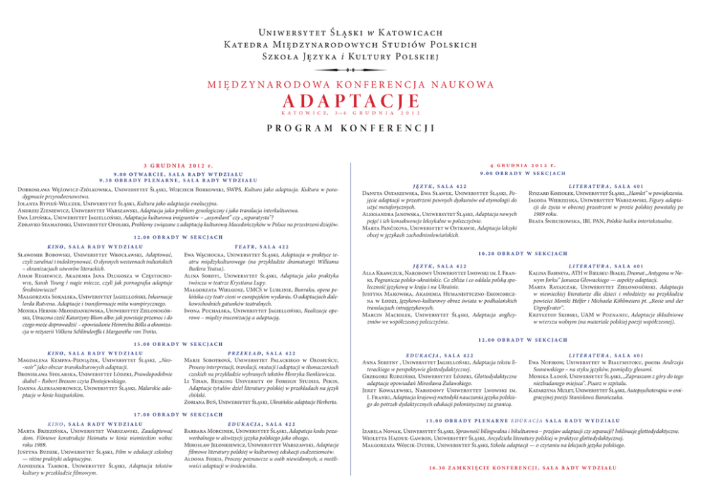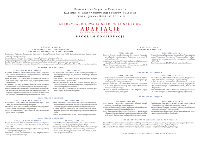 Un iwersy tet Śl ąski w K atowicac h K atedra Międzyna rod owych Stu diów Pol skic h Szko ł a Języka i Ku ltu ry Pol ski e j M I Ę D Z Y N A R O D O WA K O N F E R E N C J A N A U K O WA A D A P TA C J E K A T O W I C E, 3—4 G R U D N I A 2 0 1 2 P r o g r a m k o n f e r e n cj i 3 g ru d n ia 2 0 1 2 r. 4 g ru d n i a 2 0 1 2 r. 9 . 0 0 O t wa r c i e , s a l a R a d y W y d z i a ł u 9.30 Obr ady plenarne, sal a R ady Wydziału 9.00 Obr ady w sekcjach Dobrosława Wężowicz-Ziółkowska, Uniwersytet Śląski, Wojciech Borkowski, SWPS, Kultura jako adaptacja. Kultura w paradygmacie przyrodoznawstwa. Jolanta Rypień-Wilczek, Uniwersytet Śląski, Kultura jako adaptacja ewolucyjna. Andrzej Zieniewicz, Uniwersytet Warszawski, Adaptacja jako problem genologiczny i jako translacja interkulturowa. Ewa Lipińska, Uniwersytet Jagielloński, Adaptacja kulturowa imigrantów – „asymilant” czy „separatysta”? Zdravko Stamatoski, Uniwersytet Opolski, Problemy związane z adaptacją kulturową Macedończyków w Polsce na przestrzeni dziejów. 12.00 Obr ady w sekcjach Kino, sal a Rady Wydziału T e at r , s a l a 4 2 2 Sławomir Bobowski, Uniwersytet Wrocławski, Adaptować, czyli zarabiać i indoktrynować. O słynnych westernach indiańskich – ekranizacjach utworów literackich. Adam Regiewicz, Akademia Jana Długosza w Częstochowie, Sarah Young i nagie miecze, czyli jak pornografia adaptuje Średniowiecze? Małgorzata Sokalska, Uniwersytet Jagielloński, Inkarnacje lorda Rutvena. Adaptacje i transformacje mitu wampirycznego. Monika Hernik-Młodziankowska, Uniwersytet Zielonogórski, Utracona cześć Katarzyny Blum albo: jak powstaje przemoc i do czego może doprowadzić – opowiadanie Heinricha Bölla a ekranizacja w reżyserii Völkera Schlöndorffa i Margarethe von Trotta. Ewa Wąchocka, Uniwersytet Śląski, Adaptacja w praktyce teatru międzykulturowego (na przykładzie dramaturgii Williama Butlera Yeatsa). Alina Sordyl, Uniwersytet Śląski, Adaptacja jako praktyka twórcza w teatrze Krystiana Lupy. Małgorzata Wielgosz, UMCS w Lublinie, Bunraku, opera pekińska czy teatr cieni w europejskim wydaniu. O adaptacjach dalekowschodnich gatunków teatralnych. Iwona Puchalska, Uniwersytet Jagielloński, Realizacje operowe – między inscenizacją a adaptacją. Język, sala 422 Danuta Ostaszewska, Ewa Sławek, Uniwersytet Śląski, Pojęcie adaptacji w przestrzeni pewnych dyskursów od etymologii do użyć metaforycznych. Aleksandra Janowska, Uniwersytet Śląski, Adaptacja nowych pojęć i ich konsekwencje leksykalne w polszczyźnie. Marta Pančikova, Uniwersytet w Ostrawie, Adaptacja leksyki obcej w językach zachodniosłowiańskich. Magdalena Kempna-Pieniążek, Uniwersytet Śląski, „Neo-noir” jako obszar transkulturowych adaptacji. Bronisława Stolarska, Uniwersytet Łódzki, Prawdopodobnie diabeł – Robert Bresson czyta Dostojewskiego. Joanna Aleksandrowicz, Uniwersytet Śląski, Malarskie adaptacje w kinie hiszpańskim. Język, sala 422 Ałła Krawczuk, Narodowy Uniwersytet Lwowski im. I. Franki, Pogranicza polsko-ukraińskie. Co zbliża i co oddala polską społeczność językową w kraju i na Ukrainie. Justyna Makowska, Akademia Humanistyczno-Ekonomiczna w Łodzi, Językowo-kulturowy obraz świata w podhalańskich translacjach intrajęzykowych. Marcin Maciołek, Uniwersytet Śląski, Adaptacja anglicyzmów we współczesnej polszczyźnie. Marta Brzezińska, Uniwersytet Warszawski, Zaadaptować dom. Filmowe konstrukcje Heimatu w kinie niemieckim wobec roku 1989. Justyna Budzik, Uniwersytet Śląski, Film w edukacji szkolnej — różne praktyki adaptacyjne. Agnieszka Tambor, Uniwersytet Śląski, Adaptacja tekstów kultury w przekładzie filmowym. L i t e r at u r a , s a l a 4 0 1 Kalina Bahneva, ATH w Bielsku-Białej, Dramat „Antygona w Nowym Jorku” Janusza Głowackiego — aspekty adaptacji. Marta Ratajczak, Uniwersytet Zielonogórski, Adaptacja w niemieckiej literaturze dla dzieci i młodzieży na przykładzie powieści Moniki Helfer i Michaela Köhlmeiera pt. „Rosie und der Urgroßvater”. Krzysztof Skibski, UAM w Poznaniu, Adaptacje składniowe w wierszu wolnym (na materiale polskiej poezji współczesnej). 12.00 Obr ady w sekcjach Przekład, sala 422 Marie Sobotková, Uniwersytet Palackiego w Ołomuńcu, Procesy interpretacji, translacji, mutacji i adaptacji w tłumaczeniach czeskich na przykładzie wybranych tekstów Henryka Sienkiewicza. Li Yinan, Beijging University of Foreign Studies, Pekin, Adaptacje tytułów dzieł literatury polskiej w przekładach na język chiński. Zoriana Buń, Uniwersytet Śląski, Ukraińskie adaptacje Herberta. 17.00 Obr ady w sekcjach K ino , s a l a R a d y W y d z i a ł u Ryszard Koziołek, Uniwersytet Śląski, „Hamlet” w powiększeniu. Jagoda Wierzejska, Uniwersytet Warszawski, Figury adaptacji do życia w obecnej przestrzeni w prozie polskiej powstałej po 1989 roku. Beata Śniecikowska, IBL PAN, Polskie haiku intertekstualne. 10.20 Obr ady w sekcjach 15.00 Obr ady w sekcjach Kino, sal a Rady Wydziału L i t e r at u r a , s a l a 4 0 1 Edukacja, sal a 422 Barbara Morcinek, Uniwersytet Śląski, Adapatcja kodu pozawerbalnego w akwizycji języka polskiego jako obcego. Mirosław Jelonkiewicz, Uniwersytet Warszawski, Adaptacje filmowe literatury polskiej w kulturowej edukacji cudzoziemców. Aldona Fojkis, Procesy poznawcze u osób niewidomych, a możliwości adaptacji w środowisku. Edukacja, sal a 422 Anna Seretny , Uniwersytet Jagielloński, Adaptacja tekstu literackiego w perspektywie glottodydaktycznej. Grzegorz Rudziński, Uniwersytet Łódzki, Glottodydaktyczne adaptacje opowiadań Mirosława Żuławskiego. Jerzy Kowalewski, Narodowy Uniwersytet Lwowski im. I. Franki, Adaptacja krajowej metodyki nauczania języka polskiego do potrzeb dydaktycznych edukacji polonistycznej za granicą. L i t e r at u r a , s a l a 4 0 1 Ewa Nofikow, Uniwersytet w Białymstoku, poems Andrzeja Sosnowskiego – na styku jęz