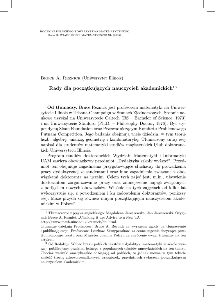 ROCZNIKI POLSKIEGO TOWARZYSTWA MATEMATYCZNEGO Seria II: WIADOMOŚCI MATEMATYCZNE XL (2004) Bruce A. Reznick (Uniwersytet Illinois) Rady dla początkujących nauczycieli akademickich1,2 Od tłumaczy. Bruce Reznick jest profesorem matematyki na Uniwersytecie Illinois w Urbana-Champaign w Stanach Zjednoczonych. Stopnie naukowe uzyskał na Uniwersytecie Caltech (BS – Bachelor of Science, 1973) i na Uniwersytecie Stanford (Ph.D. – Philosophy Doctor, 1976). Był stypendystą Sloan Foundation oraz Przewodniczącym Komitetu Problemowego Putnam Competition. Jego badania obejmują wiele dziedzin, w tym teorię liczb, algebrę, analizę, geometrię i kombinatorykę. Tłumaczony tutaj esej napisał dla studentów matematyki studiów magisterskich i/lub doktoranckich Uniwersytetu Illinois. Program studiów doktoranckich Wydziału Matematyki i Informatyki UAM zawiera obowiązkowy przedmiot „Dydaktyka szkoły wyższej”. Przedmiot ten obejmuje zagadnienia przygotowujące słuchaczy do prowadzenia pracy dydaktycznej ze studentami oraz inne zagadnienia związane z obowiązkami doktoranta na uczelni. Celem tych zajęć jest, m.in., ułatwienie doktorantom zorganizowanie pracy oraz zmniejszenie napięć związanych z podjęciem nowych obowiązków. Właśnie na tych zajęciach od kilku lat wykorzystuje się, z powodzeniem i ku zadowoleniu doktorantów, poniższy esej. Może przyda się również innym początkującym nauczycielom akademickim w Polsce? 1 Tłumaczenie z języka angielskiego: Magdalena Jaroszewska, Jan Jaroszewski. Oryginał: Bruce A. Reznick „Chalking it up: Advice to a New TA”, http://www.math.uiuc.edu/∼reznick/ciu.html. Tłumacze dziękują Profesorowi Bruce A. Reznick za wyrażenie zgody na tłumaczenie i publikację eseju, Profesorowi Leszkowi Skrzypczakowi za cenne sugestie dotyczące przetłumaczonego tekstu oraz Magister Joannie Polcyn za zwrócenie uwagi tłumaczy na ten artykuł. 2 Od Redakcji. Wobec braku polskich tekstów z dydaktyki matematyki w szkole wyższej, publikujemy przekład jednego z popularnych tekstów amerykańskich na ten temat. Chociaż warunki amerykańskie odbiegają od polskich, to jednak można w tym tekście znaleźć trochę zdroworozsądkowych wskazówek, przydatnych zwłaszcza początkującym nauczycielom akademickim. 230 B. A. R e z n i c k Tajemnicą nauczania jest szacunek dla ucznia. Ralph Waldo Emerson Wprowadzenie. Stanięcie po raz pierwszy twarzą w twarz z grupą studentów jest doświadczeniem wstrząsającym. Pomyśl tylko! Oto trzydziestu ludzi, którzy zapłacili spore pieniądze za edukację na dobrym uniwersytecie, i wszystkich ich powierzono tobie. Twoje zajęcia stanowią trzy procent ich zajęć w uczelni, a ty nie prowadziłeś zajęć nigdy wcześniej. Co możesz zrobić? Zacznij. Zmaż tablicę, podaj swoje imię i nazwisko, napisz je wyraźnie na tablicy, podaj swój adres służbowy i numer telefonu, nazwę przedmiotu wraz z jego kodem, pokaż książkę oraz opisz program, podaj godziny urzędowania i zamierzony sposób oceniania. Kiedy kończysz odczytywać listę obecności, już jesteś nauczycielem. Gratulacje! Jestem profesorem matematyki, a nie profesorem nauk edukacyjnych i nie studiowałem pedagogiki w sposób zorganizowany. Tekst ten jest praktycznym, opartym na doświadczeniu esejem na temat nauczania. P a m i ę t a j, ż e t w o i s t u d e n c i s ą t a c y s a m i j a k t y. Zapewne przez większość swojego dotychczasowego życia byłeś wpierw uczniem, a potem studentem, a więc wiesz więcej o nauczaniu, niż przypuszczasz. Przypomnij sobie, czego nie lubiłeś jako student i nie rób tego jako nauczyciel. Po pierwszym semestrze nauczania przywrócisz w sobie szacunek dla twoich starych nauczycieli! P a m i ę t a j t a k ż e, ż e t w o i s t u d e n c i w c a l e n i e s ą d o k ł a d n i e t a c y s a m i j a k t y. Ty jesteś wystarczająco zainteresowany matematyką, by starać się uzyskać kolejne stopnie naukowe; twoi pierwsi studenci są zadowoleni, uczęszczając na znakomite zajęcia w szkole wyższej. Moja matka, przed rozpoczęciem moich pierwszych zajęć dydaktycznych ze studentami, powiedziała mi: „Bądź życzliwy dla studentów. Matematyka jest znacznie łatwiejsza dla ciebie niż dla nich”. T w o i s t u d e n c i n i e s ą g ł u p i m i l u d ź m i. Bądź dla nich cierpliwy, spróbuj sobie przypomnieć, jak się czułeś na zajęciach ze swojego najmniej lubianego, obowiązkowego przedmiotu i pamiętaj, że wielu twoich studentów będzie się tak czuło, niezależnie od tego jak dobrze będziesz ich uczyć. Niektórzy studenci będą oczekiwać kolejnych zajęć z matematyki tak, jak oczekują wizyty u dentysty. Ś w i a t s i ę n i e k o ń c z y n a z a j ę c i a c h z m a t e m a t y k i. Pomyłki będą się zdarzać. Nikt nie jest doskonały, zwłaszcza za pierwszym razem. (Pierwszy raz prowadzisz te zajęcia i zapewne studenci po raz pierwszy na nie uczęszczają.) Jako student/słuchacz studiów magisterskich/doktoranckich możesz poświęcić tylko ograniczoną ilość czasu i energii na pełnienie roli nauczyciela, a więc musisz mądrze korzystać z zasobów, którymi dysponujesz. Wiedzy nie można dać – musi być wzięta. Studenci również przeznaczają na twój Rady dla początkujących nauczycieli akademickich 231 przedmiot pewną ilość czasu i energii. Twoim zadaniem jest ukierunkowanie ich wysiłków na realizację konstruktywnych celów oraz skłonienie ich, jeśli to konieczne, do wykonania pracy, która musi być wykonana. Sprawny praktyk edukacyjnego judo może spowodować, że grupa studencka sama będzie się uczyć. N i e j e s t e ś s a m. Nie potrzebujesz Lematu Zorna, by stwierdzić, że każdy nauczyciel był kiedyś pierwszy raz nauczycielem. Kiedy masz wątpliwości, poradź się bardziej doświadczonego kolegi. Niemal każda sytuacja, którą można sobie wyobrazić, już się kiedyś zdarzyła. Poprawa może nastąpić po niemal ka