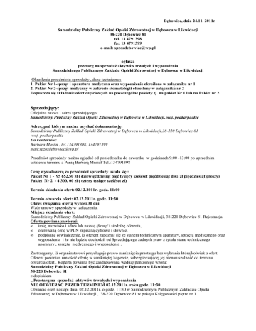Dębowiec, dnia 24.11. 2011r Samodzielny Publiczny Zakład Opieki Zdrowotnej w Dębowcu w Likwidacji 38-220 Dębowiec 81 tel. 13 4791398 fax 13 4791399 e-mail: [email protected] ogłasza przetarg na sprzedaż aktywów trwałych i wyposażenia Samodzielnego Publicznego Zakładu Opieki Zdrowotnej w Dębowcu w Likwidacji Określenie przedmiotu sprzedaży , dane techniczne: 1. Pakiet Nr 1-sprzęt i aparatura medyczna oraz wyposażenie określone w załączniku nr 1 2. Pakiet Nr 2-sprzęt medyczny w zakresie stomatologii określony w załączniku nr 2 Dopuszcza się składanie ofert częściowych na poszczególne pakiety tj. na pakiet Nr 1 lub na Pakiet nr 2. Sprzedający: Oficjalna nazwa i adres sprzedającego: Samodzielny Publiczny Zakład Opieki Zdrowotnej w Dębowcu w Likwidacji, woj. podkarpackie Adres, pod którym można uzyskać dokumentację: Samodzielny Publiczny Zakład Opieki Zdrowotnej w Dębowcu w Likwidacji,38-220 Dębowiec 81 woj. podkarpackie Do kontaktów: Barbara Musiał , tel.134791398, 134791399 mail:[email protected] Przedmiot sprzedaży można oglądać od poniedziałku do czwartku w godzinach 9:00 -13:00 po uprzednim ustaleniu terminu z Panią Barbarą Musiał Tel.:134791398 Cenę wywoławczą za przedmiot sprzedaży ustala się : Pakiet Nr 1 - 95 652,50 zł ( dziewięćdziesiąt pięć tysięcy sześćset pięćdziesiąt dwa zł pięćdziesiąt groszy) Pakiet Nr 2 - 4 300, 00 zł ( cztery tysiące sześćset zł) Termin składania ofert: 02.12.2011r. godz. 11:00 Termin otwarcia ofert: 02.12.2011r. godz. 11:30 Okres związania ofertą wynosi 30 dni Wzór umowy sprzedaży w załączeniu. Miejsce składania ofert: Samodzielny Publiczny Zakład Opieki Zdrowotnej w Dębowcu w Likwidacji, 38-220 Dębowiec 81 Rejestracja. Oferta powinna zawierać: • imię, nazwisko i adres lub nazwę /firmę/ i siedzibę oferenta, oferowaną cenę w PLN zapisaną cyfrowo i słownie, • • podpisane oświadczenie, iż oferent zapoznał się ze stanem technicznym aparatury, sprzętu medycznego oraz wyposażenia i że nie będzie dochodził od Sprzedającego żadnych praw z tytułu stanu technicznego aparatury , sprzętu medycznego i wyposażenia . Zastrzegamy, iż organizatorowi przysługuje prawo zamknięcia przetargu bez wybrania którejkolwiek z ofert. Oferent powinien umieścić ofertę w zamkniętej kopercie, zabezpieczającej jej nienaruszalność do terminu otwarcia ofert . Koperta powinna być zaadresowana według poniższego wzoru: Samodzielny Publiczny Zakład Opieki Zdrowotnej w Dębowcu w Likwidacji 38-220 Dębowiec 81 z dopiskiem „ Przetarg na sprzedaż aktywów trwałych i wyposażenia NIE OTWIERAĆ PRZED TERMINEM 02.12.2011r. roku godz. 11:30 Otwarcie ofert nastąpi dnia 02.12.2011r. o godz. 11:30 w Samodzielnym Publicznym Zakładzie Opieki Zdrowotnej w Dębowcu w Likwidacji , 38-220 Dębowiec 81 w pokoju Księgowości piętro nr 1. Pakiet Nr 1 Załącznik Nr 1 Wykaz aktywów trwałych i wyposażenia Samodzielnego Publicznego Zakładu Opieki Zdrowotnej w Dębowcu w Likwidacji Lp 1 2 3 4 5 6 7 8 9 10 11 12 13 14 15 16 17 18 19 20 21 22 23 24 25 26 27 28 29 30 31 32 33 34 35 36 37 38 39 40 41 42 43 44 45 46 47 48 Nazwa Drukarka OKI MICROLINE 3321 Komputer Komputer z monitorem Zestaw komputerowy Zestaw komputerowy Zestaw komputerowy Komputer Veriton Monitor LCD Philips Monitor LCD 19 LG Chłodziarka Ardo MP 16SA Drukarka laser Samsung CLP-310/SEE Centrala telefoniczna IP Prima 2 Kserokopiarka Panasonic DP-1520P Kserokopiarka Toshiba Szafy kartotekowe Zestaw mebli Meble biurowe(biurko naroż) Segment meblowy Segment meblowy(szuflady) Waga WPT 60/150 OW Lampa sollux Detektor tętna płodu BTL FC100 Waga WPT 60/150 OW Lampa operacyjno-zabiegowa przejezdna Urządzenie wielofun. Brother DCP-8060 Komplet mebli Chłodziarka Ardo Zestaw meblowy Komplet mebli Komplet mebli Komplet mebli Biurko Biurko Biurko Biurko narożne Biurko medyczne Szafka-jamnik Krzesła Krzesła Fotel gabinetowy obrotowy Fotel biurowy obrotowy Krzesło obrotowe Krzesło obrotowe Krzesło obrotowe Fotel obrotowy Żaluzje Czajnik bezprzewodowy Zelmer Kosz na śmieci Ilość 1 2 1 1 1 1 1 1 2 1 1 1 1 1 1 1 1 1 1 2 1 1 1 1 1 1 1 1 1 1 1 4 8 1 1 1 2 14 42 2 2 5 1 1 1 11 4 8 Rok zakupu 2001 2003 2006 2008 2008 2008 2011 2005 2008 2009 2009 2011 2005 2007 2008 2004 2004 2005 2005 2007 2007 2007 2008 2009 2009 2003 2004 1999 1999 2004 1999/2000 2001 1999 1999 2002 2011 2011 2007 2001 1999 2009 2004/2005 2004/2009 Uwagi Lp 49 50 51 52 53 54 55 56 57 58 59 60 61 62 63 64 65 66 67 68 69 70 71 72 73 74 75 76 77 78 79 80 81 82 83 84 85 86 87 88 89 90 91 92 93 94 95 96 97 98 99 100 101 102 103 104 105 106 107 108 Nazwa Lustro Lustro Półka biała Półka wisząca Pojemnik na mydło Pojemnik na mydło Pojemnik na ręczniki Pojemnik na ręczniki Pojemnik na papier Wieszak na ręczniki Szafa Szafa z nadstawką Szafa dwudrzwiowa Szafka wąska zegarem Wieszak stojący Wieszak stojący-cactus Szafka pod zlew Terma elektryczna Terma elektryczna Ogrzewacz wody Terma elektryczna Podgrzewacz wody przepływ. Lampa bakteriobójcza Lampa bakteriobójcza Kozetka lekarska Kozetka lekarska Kozetka lekarska Kozetka lekarska Kozetka lekarska Kozetka do fizykoterapii Stolik kwadratowy mały Stół Stolik biały Stolik do badania niemowląt Stolik do badania niemowląt Stolik do badania niemowląt Stolik zabiegowy Stolik zabiegowy Parawan Parawan Biurko medyczne Szafki medyczne Wieszak do kroplówek Ława Fotel Tablice informacyjne Gaśnica stojąca Kosz na bieliznę Waga niemowlęca elektroniczna Waga niemowlęca WPT 6/15 Grzejnik elektryczny Grzejnik Wentylator Wentylator Wentylator Lampa Lampa biurowa Waga ze wzrostomierzem UPS APC BACK Lodówka Ilość 1 5 1 1 1 11 1 10 7 1 2 1 1 1 7 1 3 1 3 2 1 1 3 1 2 1 1 1 1 1 1 1 1 1 1 1 2 1 4 1 1 2 1 1 2 9 3 1 1 1 1 1 1 1 1 1 2 1 1 1 Rok zakupu 2005 2005 1999 1999 2005 2005 2000 2007 2009 2005 2000 2004 2005 2004 2006 2004 2011 2010 2005 2007 2002 2011 1999 2008 2006 2006 2011 2000 Uwagi Lp 109 110 11