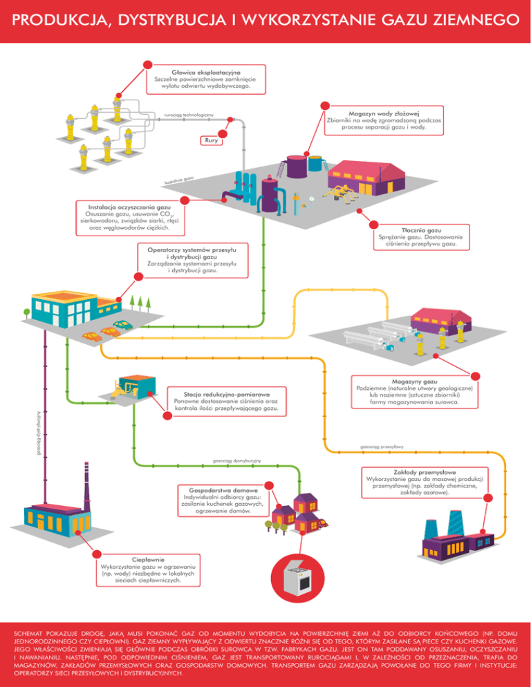 1 PRODUKCJA, DYSTRYBUCJA I WYKORZYSTANIE GAZU ZIEMNEGO Głowica eksploatacyjna Szczelne powierzchniowe zamknięcie wylotu odwiertu wydobywczego. rurociąg technologiczny Magazyn wody złożowej Zbiorniki na wodę zgromadzoną podczas procesu separacji gazu i wody. Rury zu ia ga kopaln Instalacja oczyszczania gazu Osuszanie gazu, usuwanie CO2, siarkowodoru, związków siarki, rtęci oraz węglowodorów ciężkich. gazociąg dystrybucyjny Operatorzy systemów przesyłu i dystrybucji gazu Zarządzanie systemami przesyłu i dystrybucji gazu. Stacja redukcyjno-pomiarowa Ponowne dostosowanie ciśnienia oraz kontrola ilości przepływającego gazu. Tłocznia gazu Sprężanie gazu. Dostosowanie ciśnienia przepływu gazu. Magazyny gazu Podziemne (naturalne utwory geologiczne) lub naziemne (sztuczne zbiorniki) formy magazynowania surowca. gazociąg przesyłowy gazociąg dystrybucyjny Gospodarstwa domowe Indywidualni odbiorcy gazu: zasilanie kuchenek gazowych, ogrzewanie domów. Zakłady przemysłowe Wykorzystanie gazu do masowej produkcji przemysłowej (np. zakłady chemiczne, zakłady azotowe). Ciepłownie Wykorzystanie gazu w ogrzewaniu (np. wody) niezbędne w lokalnych sieciach ciepłowniczych. SCHEMAT POKAZUJE DROGĘ, JAKĄ MUSI POKONAĆ GAZ OD MOMENTU WYDOBYCIA NA POWIERZCHNIĘ ZIEMI AŻ DO ODBIORCY KOŃCOWEGO (NP. DOMU JEDNORODZINNEGO CZY CIEPŁOWNI). GAZ ZIEMNY WYPŁYWAJĄCY Z ODWIERTU ZNACZNIE RÓŻNI SIĘ OD TEGO, KTÓRYM ZASILANE SĄ PIECE CZY KUCHENKI GAZOWE. JEGO WŁAŚCIWOŚCI ZMIENIAJĄ SIĘ GŁÓWNIE PODCZAS OBRÓBKI SUROWCA W TZW. FABRYKACH GAZU. JEST ON TAM PODDAWANY OSUSZANIU, OCZYSZCZANIU I NAWANIANIU. NASTĘPNIE, POD ODPOWIEDNIM CIŚNIENIEM, GAZ JEST TRANSPORTOWANY RUROCIĄGAMI I, W ZALEŻNOŚCI OD PRZEZNACZENIA, TRAFIA DO MAGAZYNÓW, ZAKŁADÓW PRZEMYSŁOWYCH ORAZ GOSPODARSTW DOMOWYCH. TRANSPORTEM GAZU ZARZĄDZAJĄ POWOŁANE DO TEGO FIRMY I INSTYTUCJE: OPERATORZY SIECI PRZESYŁOWYCH I DYSTRYBUCYJNYCH.