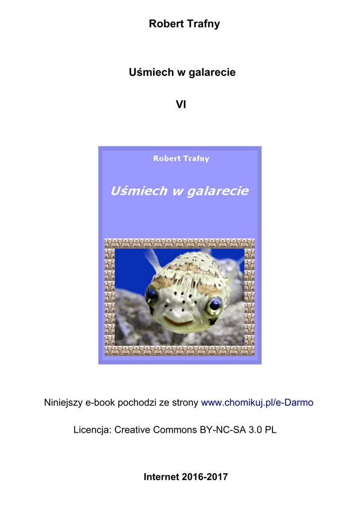 Robert Trafny Uśmiech w galarecie VI Niniejszy e-book pochodzi ze strony www.chomikuj.pl/e-Darmo Licencja: Creative Commons BY-NC-SA 3.0 PL Internet 2016-2017 I Apel do poetów bez hamulca Po konfrontacjach poetyckich w Prudniku. Dzieci Kaliope! Panteizm druku wykrwawił się w czasach C.K., a wy co? Ciągle w nadziei na powrót niemożliwego. Komuno wróć!- chciałoby się zawołać. * Poeci! Bierzcie przykład ze starożytnych. Czemu ich myśli są ponadczasowe? Krótkie, ale treściwe? Ponieważ mieli dużo czasu na zastanawianie siękażde bowiem słowo musieli wykuwać w kamieniu; wam też to radzę. Autoironia Grzywiaste ściany rąk, ud, pleców aż do ziemi... Tors- zwykła rzecz, palce i łydki- owszem też! * Oczy ze strachem patrzą na otwierający się Sezam: na języku chyba nie?! Oczywiście! * Wieczorową porą w lustrze straszyć zaczyna jegomość. --Grzywacz? Nie. To tylko ja. Toto-lotto Jedna wyżej, jedna niżej, jak nie z boku, to po skosie, trafić czysto nikt nie może. Jak już trafi to nie wyśle, bo zapomniał, bo nie myślał... Czy teraz warto? Oczywiście! Jutro puści już na pewno. A gdy przyjdzie losowanie: Jedna wyżej, jedna niżej, jak nie z boku, to po skosie... Babcia à la judasz Buzia rozciągnięta wypukłościami szklanej kuli niepodobna wcale do twarzy rozpromieniła moje oko. Oto kurz pomiędzy szybkami przyprawił babcię o zarost. Rozpalony do czerwoności nos to się kurczy, to nadyma; głowa chwieje się, wciąż ucieka z kadru... buzia niepodobna do twarzy puka do mych drzwi. Epitafium W hołdzie truizmowi Umarł nieborak. Umarł nagle. A jeszcze 15 minut przed śmiercią żył, tańczył i śpiewał. Gdyby żył nie pochowaliby go, nie zamknęli w trumnie. Umarł. Umarł nieborak. Umarł i już nie żyje. Poessia macaroniae Lelum polelum Fistum pofistum Być pesymistum. Chochołum muzykum Odollama chłopczykum. Hocus pocus Tontus talontus: Ogrodum Armidum Vszyscy vidum. Fugas chrustas Homunkulas! Litterae non erubescunt. Homo homini Panta rheiA ja hej! Sługa jakich wielu W pokornej pozie sługi idzie za swym panem, dobroczyńcą i w odezwaniach wysoce łagodnych spełnia jego życzenia: „Tak proszę pana”, „W tej chwili najjaśniejszy panie...” I w chwilach wolnych od posługi którymś kątem się wymyka, korytarzem, czy schodami, byle drzwiami, salonami... Nikt nie widzi? Nikt nie słyszy? W barek się zagłębia, w mocodawcy kapciach i szlafroku, mój amoku!, mój amoku! * Dzwonek bije: pan już idzie. Wzywa sługę hen z oddali, by mu kapcie i cygaro po kąpieli przygotowano. Z uniżeniem godnym pana zaraz też się pojawia, by mu służyć jak najlepiej: „Tak proszę pana”, „W tej chwili najjaśniejszy panie...” A gdy wieczór przyjdzie, noc nastanie, pan na spoczynek się udaje i odprawia sługę w końcu, mój zającu!, mój zającu! Krętą drogą komnat licznych uwolniony się przedziera, byle cicho, byle szybko służyć pani jak najdłużej, a gdy dotrze już zziajany, światło gasi momentalnie i szepcze cicho, jak najciszej: „Tak proszę pani”, „W tej chwili...” *** W pewnym mieście, w pewnym domu za zrządzeniem losu spotkało się w szybie kominowym trzech jegomościów. Pierwszy, jak smoła czarne miał ubranie i zszedł najniżej, gdzie najlepsze grzanie. Drugi w czerwone ubrał się pielesze a za sobą pełny worek wlecze. Trzeci pstrokate wybrał łachy i pusty worek nieco kubłaty. Gdy ten pierwszy już się ogrzał drugi sprawił, że tak został. Cały zaczopował się grubasek, z góry tobołek nos mu gniecie: nie ma rady- trzeba tamtemu usiąść na grzbiecie. -Ktoś ty?!- pierwszy się wystraszył, gdy mu tamten okrakiem wtargnąć raczył- Czy to zjawa, czy to zmora? Hej! To mój komin, moja rola! Dokąd bracie w taką porę? Dziś są glorie, dziś są święta, czy twoja pamięć nie pamięta? -Ależ owszem, jak najbardziejmówi drugi coraz hardziejDziś są glorie, dziś są święta tam na dole śpią dziecięta. Ja tu do nich, jak na skrzydłach moc prezentów im przywiozłem. Ja Mikołaj, święte ręce hende hoch- do góry ręce! A ktoś ty?! Mówże zaraz, bo cię zdmuchnę pistoletem na gaz. -Ja kominiarz, pan tego miejsca. Mam użyć swego lejca? Nie strasz tak więcej tylko złaź ze mnie czym prędzej. Wtem trzeci z góry naparł, zablokował tych co niżej i grzecznie prosi: „Ciszej panowie, ciszej”. A ten to kto?!- Wzburzył się pierwszy całkiem już zgnieciony- Czy pan wie, kim jest mąż mojej żony? Ależ kochanieńki, mało ważne, nie drzyj się pan tylko, nic więcej. Jak się zbudzą interesu dziś nie będzie. Widzisz ten worek? On jest pusty. Jam złodziejskie jest nasienie, kradnę, grabię cudze mienie. -Worka widzieć nie widzę, ten nade mną mi zasłania. Panie! Łap pan tego drania! Łap złodzieja i grabieżcę, nic straconego jeszcze! Ale tego już nie było. Razem z prezentami się ulotnił. Grubas wciąż napierał cielskiem, na lekkim ogniu kominiarza podduszał worek z prezentami puścić musiał. Nie miał siły dłużej walczyć uwięziony w wąskiej klitce; chciał uwolnić się spod jarzma, bo świt w komin już dawno zajrzał. Będzie wstyd, będzie hańba, wiara w Mikołaja jest zachwiana, jak dzieci prezenty sprawdzą z rana! Co łóżeczko wisi skarpeta, a w skarpecie węgielek się żarzy. Czasem dzieciom tak się zdarzy: zamiast Mikołaja mają św. Kominiarza! *** Na jadowitej węża drodze podróżnik stanął mocno zaspany. Ledwo wąż ślepia podniósł do góry patrzy: patrzeć już nie może. Coś mu ciężko się zrobiło, w głowie ciemno i ponuro i jakby bardziej się rozpłaszczył. Deszczu nie ma, woda lecidziwi się gad zdeptanyjakieś szambko lub bidecik, bo smrodzik dobrze znany. Żebym tylko mógł ukąsićmyśli zrozpaczone zwierzędziabnąć lekko nade wszystko, ale jak tu walczyć w takim gnoju, kiedy przydeptano głowu moju. Innej broni nie posiadam, bronić się nie mogę, może zacznę ćwiczyć jogę? I tak ćwiczy