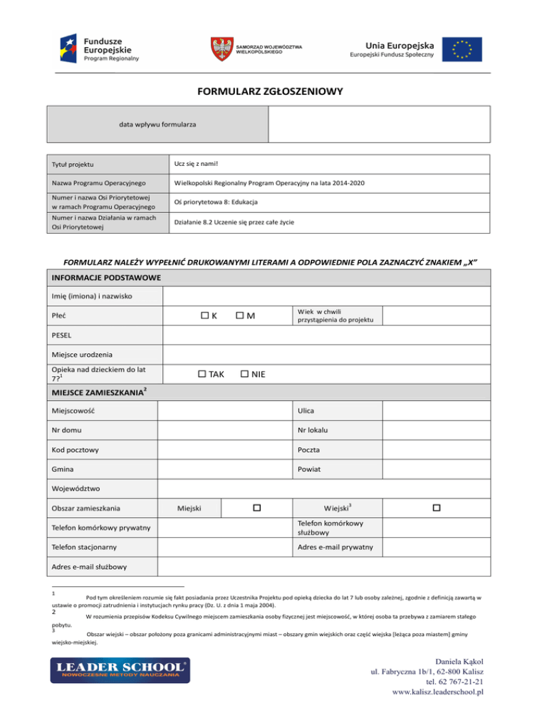 FORMULARZ ZGŁOSZENIOWY data wpływu formularza Tytuł projektu Ucz się z nami! Nazwa Programu Operacyjnego Wielkopolski Regionalny Program Operacyjny na lata 2014-2020 Numer i nazwa Osi Priorytetowej w ramach Programu Operacyjnego Oś priorytetowa 8: Edukacja Numer i nazwa Działania w ramach Osi Priorytetowej Działanie 8.2 Uczenie się przez całe życie FORMULARZ NALEŻY WYPEŁNIĆ DRUKOWANYMI LITERAMI A ODPOWIEDNIE POLA ZAZNACZYĆ ZNAKIEM „X” INFORMACJE PODSTAWOWE Imię (imiona) i nazwisko K Płeć M Wiek w chwili przystąpienia do projektu PESEL Miejsce urodzenia Opieka nad dzieckiem do lat 1 7? MIEJSCE ZAMIESZKANIA TAK NIE 2 Miejscowość Ulica Nr domu Nr lokalu Kod pocztowy Poczta Gmina Powiat Województwo Obszar zamieszkania Miejski Wiejski 3 Telefon komórkowy prywatny Telefon komórkowy służbowy Telefon stacjonarny Adres e-mail prywatny Adres e-mail służbowy 1 Pod tym określeniem rozumie się fakt posiadania przez Uczestnika Projektu pod opieką dziecka do lat 7 lub osoby zależnej, zgodnie z definicją zawartą w ustawie o promocji zatrudnienia i instytucjach rynku pracy (Dz. U. z dnia 1 maja 2004). 2 W rozumienia przepisów Kodeksu Cywilnego miejscem zamieszkania osoby fizycznej jest miejscowość, w której osoba ta przebywa z zamiarem stałego pobytu. 3 Obszar wiejski – obszar położony poza granicami administracyjnymi miast – obszary gmin wiejskich oraz część wiejska [leżąca poza miastem] gminy wiejsko-miejskiej. Daniela Kąkol ul. Fabryczna 1b/1, 62-800 Kalisz tel. 62 767-21-21 www.kalisz.leaderschool.pl ADRES DO KORESPONDENCJI (inny niż zamieszkania) Miejscowość Ulica Nr domu Nr lokalu Kod pocztowy Poczta Województwo Powiat WYKSZTAŁCENIE brak (brak formalnego wykształcenia) podstawowe (kształcenie ukończone na poziomie szkoły podstawowej) gimnazjalne (kształcenie ukończone na poziomie szkoły gimnazjalnej) zasadnicze zawodowe (kształcenie ukończone na poziomie szkoły zawodowej) średnie (kształcenie ukończone na poziomie szkoły średniej) Wyższe (kształcenie ukończone na poziomie szkoły wyższej) STATUS NA RYNKU PRACY W CHWILI PRZYSTĄPIENIA DO PROJEKTU osoba bezrobotna (osoba pozostająca bez pracy, gotowa do podjęcia pracy i aktywnie poszukująca zatrudnienia lub osoby zarejestrowane jako bezrobotne zgodnie z krajowymi definicjami, nawet jeżeli nie spełniają one wszystkich trzech kryteriów) osoba długotrwale bezrobotna (w przypadku osób poniżej 25 roku życia – są osoby bezrobotne nieprzerwanie przez okres ponad 6 miesięcy, a w przypadku osób powyżej 25 roku życia – nieprzerwanie przez okres ponad 12 miesięcy) osoba bierna zawodowo (osoba pozostająca bez zatrudnienia, ale nie zaliczająca się do osób Osoba bierna zawodowo ucząca się lub kształcąca się Rolnik samozatrudniony/a zatrudniony/a w administracji publicznej zatrudniony/a w dużym przedsiębiorstwie zatrudniony/a w średnim przedsiębiorstwie (zatrudnia mniej niż 250 pracowników, a jego roczny zatrudniony/a w małym przedsiębiorstwie (zatrudnia mniej niż 50 pracowników, a jego roczny zatrudniony/a w mikro przedsiębiorstwie (zatrudnia mniej niż 10 pracowników, a jego roczny zatrudniony/a w organizacji pozarządowej bezrobotnych) obrót nie przekracza 50 mln euro) obrót nie przekracza 10 mln euro) obrót nie przekracza 2 mln euro) Czy zamierza Pan/Pani starać się o zwrot kosztów dojazdu? (dotyczy osób niepracujących oraz osób niepracujących i zamieszkujących poza aglomeracją miejską) TAK NIE Daniela Kąkol ul. Fabryczna 1b/1, 62-800 Kalisz tel. 62 767-21-21 www.kalisz.leaderschool.pl Czy zamierza Pan/Pani starać się o zwrot kosztów opieki nad dzieckiem? (dotyczy matek, które przebywają na urlopie wychowawczym i/lub nie pracują za względu na opiekę nad dzieckiem do lat 7) TAK NIE Orzeczenie o stopniu niepełnosprawności TAK NIE w stopniu: (jeśli dotyczy) lekkim umiarkowanym znacznym SZKOLENIA język angielski język niemiecki Plakaty, ulotki strona www Prasa Radio Facebook Znajomi Deklaruje chęć wzięcia udziału w szkoleniu: (Proszę wybrać jeden z interesujących Pana/Panią kursów) DEKLAROWANA ZNAJOMOŚĆ WYBRANEGO JĘZYKA: NIGDY NIE UCZYŁAM/NIE UCZYŁEM SIĘ UCZYŁAM/UCZYŁEM SIĘ WCZEŚNIEJ INNE Źródła informacji o projekcie: Otrzymałem informacje w szkole Inne (jakie) …………………………………………………………………. (miejscowość i data) ……………………………..………………………………………………………………… (czytelny podpis osoby składającej dokumenty) Daniela Kąkol ul. Fabryczna 1b/1, 62-800 Kalisz tel. 62 767-21-21 www.kalisz.leaderschool.pl
