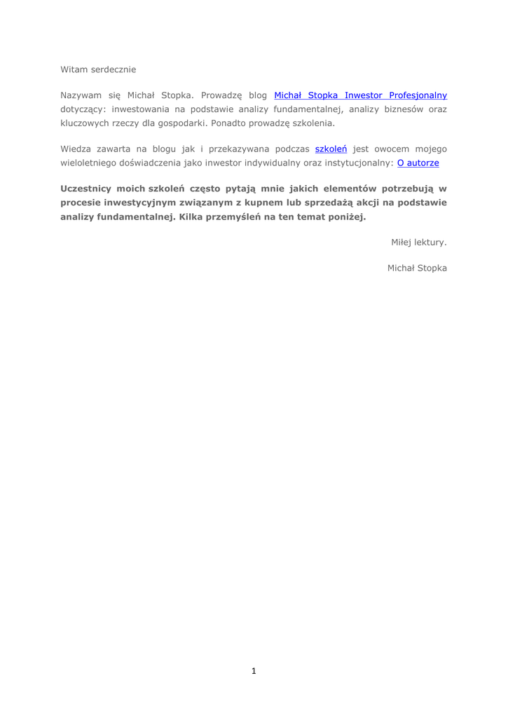 Witam serdecznie Nazywam się Michał Stopka. Prowadzę blog Michał Stopka Inwestor Profesjonalny dotyczący: inwestowania na podstawie analizy fundamentalnej, analizy biznesów oraz kluczowych rzeczy dla gospodarki. Ponadto prowadzę szkolenia. Wiedza zawarta na blogu jak i przekazywana podczas szkoleń jest owocem mojego wieloletniego doświadczenia jako inwestor indywidualny oraz instytucjonalny: O autorze Uczestnicy moich szkoleń często pytają mnie jakich elementów potrzebują w procesie inwestycyjnym związanym z kupnem lub sprzedażą akcji na podstawie analizy fundamentalnej. Kilka przemyśleń na ten temat poniżej. Miłej lektury. Michał Stopka 1 Spis treści Wstęp .................................................................................................................................................... 3 A. Wiedza: ........................................................................................................................................... 5 B. Wyniki finansowe spółek giełdowych................................................................................... 6 C. Rekomendacje biur maklerskich ........................................................................................... 8 D. Wiadomości: gospodarka i spółki giełdowe .................................................................... 10 2 Wstęp Zanim odpowiem na tytułowe pytanie tego ebooka warto zwrócić uwagę na trzy rzeczy: 1. Inwestowanie na giełdzie zawsze oznacza, że gdy jedna strona zarabia to druga traci. Na przykład jeżeli kupimy akcje po kursie 10 zł a kurs wzrośnie do 50 zł, ten kto nam je sprzedał po 10 zł stracił 40 zł. Jeżeli z kolei kurs spadnie do 1 zł to my straciliśmy a druga strona zarobiła 9 zł. Podobnie ma się sytuacja w IPO (wejście firmy na giełdę): Jeżeli właściciel sprzedaje nam akcje za 100 mln zł, które potem warte są 500 mln zł, my zarobiliśmy, on stracił 400 mln zł. Jeżeli z kolei wartość firmy spadła do 10 mln zł my straciliśmy a właściciel ma na koncie 100 mln zł. 2. Bardzo ważną rzeczą jest uświadomienie sobie, jak ogromne znaczenie mają koszty związane z prowizjami, spreadem oraz podatkami. Można o tym przeczytać tutaj: Poznaj biznes: Inwestowanie na giełdzie: Jak stracić 9,8 % w czasie gdy kurs spółki rośnie o 12 % … . Na przykład na polskiej giełdzie same prowizje płacone przez inwestorów w skali roku wynoszą kilka mld zł. 3. Biura maklerskie zarabiają głównie na emisjach akcji. Podczas hossy firmy dokonujące emisji akcji płacą kilka procent wartości emisji za jej przygotowanie i uplasowanie. Same prowizje od handlu akcjami zazwyczaj wystarczają tylko do pokrycia bieżących kosztów funkcjonowania biura maklerskiego. Spostrzeżenie to warto uwzględnić przy ocenie rekomendacji wydawanych przez „sell side„. Tak więc jak widać po powyższych trzech spostrzeżeniach inwestowanie na giełdzie jest wyzwaniem, dlatego też trzeba wiedzieć gdzie i jak można zbudować przewagę konkurencyjną nad innymi uczestnikami rynku. Pisałem o tym tutaj: “Inwestowanie na giełdzie: poznaj biznes?” Poznaj biznes: Inwestowanie na giełdzie… Zasada nr 1: Nigdy nie trać pieniędzy; Zasada nr 2: Nigdy nie zapominaj o zasadzie nr 1; Warren Buffet Można powiedzieć, że podobnie jak w biznesie, sensowne inwestowanie na giełdzie wiąże się ze sporymi ”barierami wejścia”: trzeba mieć wiedzę na temat analizy sprawozdań finansowych, analizy firmy i makro oraz metod wyceny. A do tego potrzebne jest jeszcze doświadczenie jak wiedzę teoretyczną stosować w praktyce. Tam gdzie jednak są wysokie bariery wejścia, są też odpowiednio wysokie zyski. 3 Poniżej lista rzeczy pomocnych w poszukiwaniu okazji inwestycyjnych na giełdzie: A. Wiedza 1. Teoretyczna dotycząca analizy makro, spółek i metod wyceny. 2. Praktyczna dotycząca inwestowania B. Wyniki finansowe spółek giełdowych 1. Co warto wiedzieć o wynikach finansowych spółek? 2. Gdzie można znaleźć historyczne wyniki finansowe wielu spółek giełdowych? 3. Prognozy wyników finansowych: spółki giełdowe 4. Prognozy wyników finansowych: rekomendacje biur maklerskich C. Rekomendacje biur maklerskich 1. Na czym zarabiają biura maklerskie? 2. Skuteczność rekomendacji brokerów 3. Jaki z tego wniosek? 4. Gdzie znaleźć rekomendacje biur maklerskich? D. Wiadomości: gospodarka i spółki giełdowe 1. Gospodarka 2. Spółki giełdowe 4 A. Wiedza: Teoretyczna dotycząca analizy makro, spółek i metod wyceny. 1. Moje darmowe ebooki 2. Prezentacje 3. Polecane książki Praktyczna dotycząca inwestowania: 1. Polecam Archiwum mojego serwisu, gdzie opisałem bardzo wiele zależności i spostrzeżeń dotyczących gospodarki oraz biznesu (kilkaset wpisów od 2007 roku). Znaczną część tych spostrzeżeń zauważyłem pracując zawodowo jako analityk akcji a później jako odpowiedzialny za wyniki inwestycyjne części portfela akcyjnego w ING OFE. 2. Zdobywanie praktycznego inwestycyjnych metodą doświadczenia „prób na podstawie i błędów”. Niestety własnych jest decyzji to jeden z najlepszych sposobów zdobycia praktycznego doświadczenia. Piszę niestety, bo wiąże się to z odpowiednią liczbą błędnych decyzji inwestycyjnych za co zazwyczaj każdy inwestor musi zapłacić stratą części kapitału. 3. Część praktycznej wiedzy dotyczącej inwestowania można ”kupić” przychodząc na moje praktyczne szkolenie z inwestowania. Moje szkolenie pomaga zrozumieć i nauczyć się wielu bardzo ważnych i praktycznych rzeczy związanych z inwestowaniem. Oczywiście moje szkolenie nie zastąpi zdrowego rozsądku, własnej ciężkiej pracy oraz kontroli własnej psychiki i emocji. Tak jak mówił „Mały Gracz” inwestowanie to walka pomiędzy chciwością, nadzieją i strachem. Zawsze tak było, jest i będzie. Pisałem o tym tutaj: Ciekawa książka „Wspomnienia gracza giełdowego” Edwina Lefevre