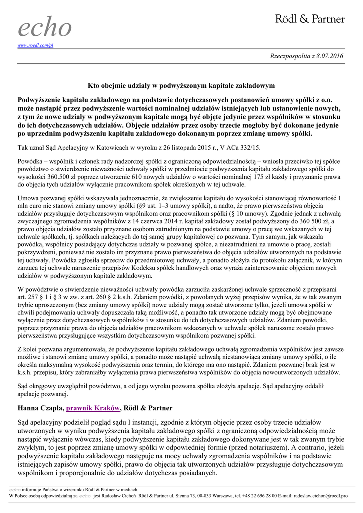 echo www.roedl.com/pl Rzeczpospolita z 8.07.2016 Kto obejmie udziały w podwyższonym kapitale zakładowym Podwyższenie kapitału zakładowego na podstawie dotychczasowych postanowień umowy spółki z o.o. może nastąpić przez podwyższenie wartości nominalnej udziałów istniejących lub ustanowienie nowych, z tym że nowe udziały w podwyższonym kapitale mogą być objęte jedynie przez wspólników w stosunku do ich dotychczasowych udziałów. Objęcie udziałów przez osoby trzecie mogłoby być dokonane jedynie po uprzednim podwyższeniu kapitału zakładowego dokonanym poprzez zmianę umowy spółki. Tak uznał Sąd Apelacyjny w Katowicach w wyroku z 26 listopada 2015 r., V ACa 332/15. Powódka – wspólnik i członek rady nadzorczej spółki z ograniczoną odpowiedzialnością – wniosła przeciwko tej spółce powództwo o stwierdzenie nieważności uchwały spółki w przedmiocie podwyższenia kapitału zakładowego spółki do wysokości 360.500 zł poprzez utworzenie 610 nowych udziałów o wartości nominalnej 175 zł każdy i przyznanie prawa do objęcia tych udziałów wyłącznie pracownikom spółek określonych w tej uchwale. Umowa pozwanej spółki wskazywała jednoznacznie, że zwiększenie kapitału do wysokości stanowiącej równowartość 1 mln euro nie stanowi zmiany umowy spółki (§9 ust. 1–3 umowy spółki), a nadto, że prawo pierwszeństwa objęcia udziałów przysługuje dotychczasowym wspólnikom oraz pracownikom spółki (§ 10 umowy). Zgodnie jednak z uchwałą zwyczajnego zgromadzenia wspólników z 14 czerwca 2014 r. kapitał zakładowy został podwyższony do 360 500 zł, a prawo objęcia udziałów zostało przyznane osobom zatrudnionym na podstawie umowy o pracę we wskazanych w tej uchwale spółkach, tj. spółkach należących do tej samej grupy kapitałowej co pozwana. Tym samym, jak wskazała powódka, wspólnicy posiadający dotychczas udziały w pozwanej spółce, a niezatrudnieni na umowie o pracę, zostali pokrzywdzeni, ponieważ nie zostało im przyznane prawo pierwszeństwa do objęcia udziałów utworzonych na podstawie tej uchwały. Powódka zgłosiła sprzeciw do przedmiotowej uchwały, a ponadto złożyła do protokołu załącznik, w którym zarzuca tej uchwale naruszenie przepisów Kodeksu spółek handlowych oraz wyraża zainteresowanie objęciem nowych udziałów w podwyższonym kapitale zakładowym. W powództwie o stwierdzenie nieważności uchwały powódka zarzuciła zaskarżonej uchwale sprzeczność z przepisami art. 257 § 1 i § 3 w zw. z art. 260 § 2 k.s.h. Zdaniem powódki, z powołanych wyżej przepisów wynika, że w tak zwanym trybie uproszczonym (bez zmiany umowy spółki) nowe udziały mogą zostać utworzone tylko, jeżeli umowa spółki w chwili podejmowania uchwały dopuszczała taką możliwość, a ponadto tak utworzone udziały mogą być obejmowane wyłącznie przez dotychczasowych wspólników i w stosunku do ich dotychczasowych udziałów. Zdaniem powódki, poprzez przyznanie prawa do objęcia udziałów pracownikom wskazanych w uchwale spółek naruszone zostało prawo pierwszeństwa przysługujące wszystkim dotychczasowym wspólnikom pozwanej spółki. Z kolei pozwana argumentowała, że podwyższenie kapitału zakładowego uchwałą zgromadzenia wspólników jest zawsze możliwe i stanowi zmianę umowy spółki, a ponadto może nastąpić uchwałą niestanowiącą zmiany umowy spółki, o ile określa maksymalną wysokość podwyższenia oraz termin, do którego ma ono nastąpić. Zdaniem pozwanej brak jest w k.s.h. przepisu, który zabraniałby wyłączenia prawa pierwszeństwa wspólników do objęcia nowoutworzonych udziałów. Sąd okręgowy uwzględnił powództwo, a od jego wyroku pozwana spółka złożyła apelację. Sąd apelacyjny oddalił apelację pozwanej. Hanna Czapla, prawnik Kraków, Rödl & Partner Sąd apelacyjny podzielił pogląd sądu I instancji, zgodnie z którym objęcie przez osoby trzecie udziałów utworzonych w wyniku podwyższenia kapitału zakładowego spółki z ograniczoną odpowiedzialnością może nastąpić wyłącznie wówczas, kiedy podwyższenie kapitału zakładowego dokonywane jest w tak zwanym trybie zwykłym, to jest poprzez zmianę umowy spółki w odpowiedniej formie (przed notariuszem). A contrario, jeżeli podwyższenie kapitału zakładowego następuje na mocy uchwały zgromadzenia wspólników i na podstawie istniejących zapisów umowy spółki, prawo do objęcia tak utworzonych udziałów przysługuje dotychczasowym wspólnikom i proporcjonalnie do udziałów dotychczas posiadanych. echo informuje Państwa o wizerunku Rödl & Partner w mediach. W Polsce osobą odpowiedzialną za echo jest Radosław Cichoń Rödl & Partner ul. Sienna 73, 00-833 Warszawa, tel. +48 22 696 28 00 E-mail: [email protected] Trudno nie zgodzić się ze stanowiskiem sądów obu instancji. Jeżeli wspólnicy w umowie spółki przewidują możliwość podwyższenia kapitału zakładowego na mocy uchwały zgromadzenia wspólników do danej wysokości i w danym okresie czasu, czynią to co do zasady w celu zapewnienia pokrycia zapotrzebowania spółki na kapitał obrotowy w miarę jej rozwoju w początkowym okresie jej działania przy uniknięciu dodatkowych kosztów i formalności związanych ze zmianą umowy spółki. Ponadto nie jest kwestią budzącą kontrowersje fakt, że możliwość podwyższenia kapitału zakładowego w opisanym wyżej, uproszczonym trybie, ustalonym między wspólnikami w umowie spółki, rodzi po stronie wspólników uprawnienie do skorzystania z pierwszeństwa objęcia tak utworzonych udziałów. Przyznawanie utworzonych poprzez podwyższenie kapitału zakładowego udziałów podmiotom trzecim, niebędącym dotychczas wspólnikami spółki z ograniczoną odpowiedzialnością, w sytuacji kiedy dotychczasowi wspólnicy wyrażają chęć objęcia tych udziałów, jest działaniem zmierzającym do zachwiania struktury właścicielskiej w spółce 