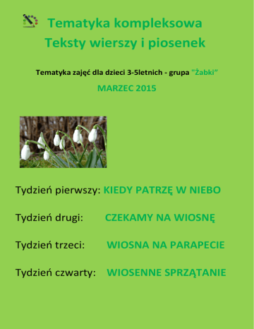 Tematyka kompleksowa Teksty wierszy i piosenek Tematyka zajęć dla dzieci 3-5letnich - grupa "Żabki” MARZEC 2015 Tydzień pierwszy: KIEDY PATRZĘ W NIEBO Tydzień drugi: CZEKAMY NA WIOSNĘ Tydzień trzeci: WIOSNA NA PARAPECIE Tydzień czwarty: WIOSENNE SPRZĄTANIE UCZYMY SIĘ WIERSZY: ASTRONAUTA Astronauta mknie w rakiecie Szukać życia we wszechświecie, Bada gwiazdy i planety i odkrywa ich planety. Mija nocka długa, szary widać cień. Słońce do nas mruga, będzie nowy dzień. UCZYMY SIĘ PIOSENKI: "Wiosna tuż, tuż" 1. Już ozimina szumieć zaczyna, że nie powróci mróz. Ref. I po tym można od razu poznać, że wiosna jest tuż,tuż. x 2 2. Śpiewa skowronek dźwięczy jak dzwonek, że gniazdo ma wśród zbóż. Ref. I po tym można od razu poznać, że wiosna jest tuż,tuż. x 2 3. Krążą nad domem boćki znajome, goście zza siedmiu mórz. Ref. I po tym można od razu poznać, że wiosna jest tuż,tuż. x 2 UCZYMY SIĘ PIOSENKI: PRZYLECIAŁY WIOSNĄ PTAKI 1.Słońce mocno nam przygrzewa Trawa już zielona Idzie wiosna, a z nią ptaki Przyleciały do nas Ref: I ćwierkają, i gęgają nowe gniazda zakładają I świergocą, i klekocą znów jesteśmy tu. 2.Szare gęsi i jaskółki Hen z dalekich krajów Kraski, dudki i kukułki Na wiosnę wracają. Ref: I ćwierkają, i gęgają nowe gniazda zakładają I świergocą, i klekocą znów jesteśmy tu. 3.Kolorowe stroszą piórka Na wiosny spotkanie Gdzieś wysoko na kominie Bocian ma mieszkanie. Ref: I ćwierkają, i gęgają nowe gniazda zakładają I świergocą, i klekocą znów jesteśmy tu.