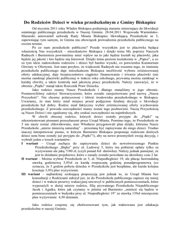 Do Rodziców Dzieci w wieku przedszkolnym z Gminy Biskupiec Od stycznia 2011 roku Władze Biskupca podejmują starania zmierzające do likwidacji ostatniego publicznego przedszkola w Naszej Gminie. 28.04.2011 Wojewoda WarmińskoMazurski unieważnił uchwałę Rady Miasta Biskupiec likwidującą Przedszkole nr 5, zapewniając tym samym, że Gmina ma obowiązek prowadzenia przedszkola publicznego na swoim terenie. Po co nam przedszkole publiczne? Przede wszystkim jest to placówka będąca własnością Nas wszystkich – mieszkańców Biskupca i dzięki temu My poprzez Naszych Radnych i Burmistrza powinniśmy mieć wpływ na to jaki będzie kształt tej placówki, jaka będzie jej jakość i kto będzie nią kierował. Dzięki temu poziom kształcenia w „Piątce”, a co za tym idzie zadowolenie rodziców i dzieci był bardzo wysoki, co potwierdza Kuratorium Oświaty w Olsztynie. Jest nam przykro, że większość Radnych nie rozumie tego, że istnienie przedszkola publicznego daje mieszkańcom Biskupca możliwość wyboru zróżnicowanej oferty edukacyjnej, daje bezpieczeństwo ciągłości finansowania i trwania placówki (nie można zamknąć placówki publicznej w trakcie roku szkolnego, prywatną można zamknąć w każdej chwili), a także kontrolę nad jakością pracy przedszkola. Należy zauważyć, że w obronie „Piątki” stanął także Rzecznik Praw Dziecka. Jako rodzice znamy Nasze Przedszkole i dlatego stanęliśmy w jego obronie. Postanowiliśmy założyć Stowarzyszenie, które zostało zarejestrowane pod nazwą „Nasza Przyszłość”. Nie chcemy polaryzować i kłócić środowiska przedszkolnego w Biskupca. Uważamy, że stan który miał miejsce przed podjęciem feralnej decyzji o likwidacji przedszkola był dobry. Rodzic miał faktyczny wybór zróżnicowanej oferty wychowania przedszkolnego. Z powodu oszczędności mamy zostać tego pozbawieni. Naszą Przyszłością są Nasze Dzieci i nie zgadzamy się, aby szukać oszczędności na najmłodszych. W chwili obecnej rodzice, których dzieci zostały przyjęte do „Piątki” są zdezorientowani pismami przesyłanymi przez Urząd Miasta. Pomimo tego, że Przedszkole nr 5 nie może zostać zlikwidowane, nasi Włodarze przygotowali plan dzięki, któremu Nasze Przedszkole „umrze śmiercią naturalną” – przestaną być zapisywane do niego dzieci. Trudno inaczej interpretować pismo, w którym Burmistrz Biskupca proponuje rodzicom (których dzieci nota bene zostały już przyjęte do „Piątki”!), aby na nowo przemyśleli swoją decyzję, i wybrali jeden z trzech wariantów: I wariant – Urząd zachęca do zapisywania dzieci do nowotworzonego Punktu Przedszkolnego „Bajka” przy ul. Ludowej 5, który ma pobierać opłaty tylko za wyżywienie ale jaką ?180 zł, (czyli ponad 8zł dniówka). Należy jednak pamiętać, że jest to działanie projektowe, które z zasady zostało powołane na określony czas 2 lat II wariant – Można wybrać Przedszkole nr 5, al. Niepodległości 19, ale płacąc horrendalną stawką godzinową 3,95zł za każdą rozpoczętą godzinę ponadprogramową (co oznacza, że 5 godzin pobytu dziecka w Przedszkolu jest bezpłatne, ale każda kolejna kosztuje 3,95) plus wyżywienie III wariant – najbardziej szokującą propozycją jest jednak to, że Urząd Miasta bez konsultacji z Rodzicami założył już, że do Przedszkola publicznego zapisze się mniej dzieci i w trakcie przerwy wakacyjnej utworzył w publicznych pomieszczeniach, które wyposażyli w dużej mierze rodzice, filię prywatnego Przedszkola Niepublicznego Jacek i Agatka, które jak czytamy w piśmie od Burmistrz „mieścić się będzie w pomieszczeniach w budynku przy al. Niepodległości 19” ze stawką 139zł miesięcznie plus wyżywienie 4,50 dziennie. Jako rodzice czujemy się zbulwersowani tym, jak traktowana jest edukacja przedszkolna w naszej Gminie. Zwracamy się do wszystkich rodziców, którzy otrzymali pisma z „nową ofertą edukacji przedszkolnej”, z prośbą o cierpliwość i rozwagę w podejmowaniu decyzji o wyborze Przedszkola. Pragniemy Państwa zarosić na spotkanie, które odbędzie się w najbliższy czwartek (11.08.2011) o godzinie 17.00 na terenie Przedszkola nr 5 (al. Niepodległości 19), Porozmawiajmy o przyszłości naszych dzieci! Obecna sytuacja, w której znaleźli się rodzice dzieci w wieku przedszkolnym nie jest jasna, co w znaczący sposób utrudnia podjęcie decyzji. Wszyscy zadajemy sobie pytania: 1. Jak Radni uzasadniają decyzję o podjęciu uchwały o podwyżce opłaty za pobyt dziecka w placówce publicznej ze stawki ok. 1,60 zł za godzinę do stawki 3,95zł za godzinę? Należy zauważyć, że jest to jedna z najwyższych stawek przyjętych przez samorządy w Polsce. Wszystkie publiczne przedszkola w największych miastach Polski z Warszawą, Gdańskiem, Wrocławiem włącznie- są tańsze. Mniej zapłacą także rodzice w Olsztynie, czy okolicznych gminach (np. pozostawiając dziecko na cały dzień w Przedszkolu publicznym w Mrągowie rodzice zapłacą 120zł miesięcznie, a w Dobrym Mieście 105zł. Rodzic z „bogatego” Biskupca zapłaci 400zł, nie wliczając w to kosztów posiłków, czy zajęć dodatkowych). 2. Jak to jest możliwe, że rodzice w jednej publicznej placówce prowadzonej przez Gminę (nowotworzona „Bajka” przy ul Ludowej) mają płacić tylko za posiłki, a rodzice w innej placówce przedszkolnej także prowadzonej przez Gminę zapłacą prawie trzykrotnie więcej niż za opiekę w przedszkolu prywatnym? 3. Jak to jest możliwe, że w Przedszkolu nr 5, które w maju zamknęło listy rekrutacyjne, przyjmując maksymalną liczbę dzieci, zapewniając tym samym pełne obłożenie Przedszkola tworzy się filię przedszkola prywatnego? Gmina tym samym nie stara się zdobyć jak największej ilości dzieci do własnego przedszkola, tylko uprawia antymarketing, niejako bojkotując swoją własną placówkę. Ważną informacją jest to, że decy