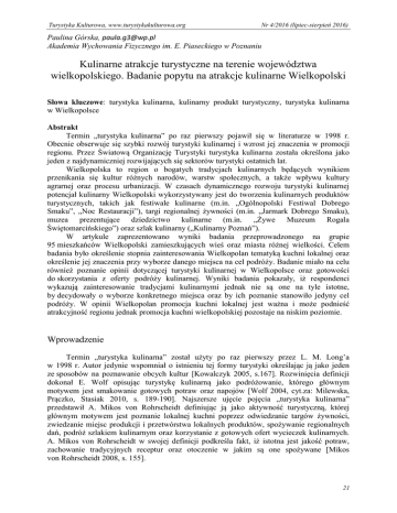 Turystyka Kulturowa, www.turystykakulturowa.org Nr 4/2016 (lipiec-sierpień 2016) Paulina Górska, [email protected] Akademia Wychowania Fizycznego im. E. Piaseckiego w Poznaniu Kulinarne atrakcje turystyczne na terenie województwa wielkopolskiego. Badanie popytu na atrakcje kulinarne Wielkopolski Słowa kluczowe: turystyka kulinarna, kulinarny produkt turystyczny, turystyka kulinarna w Wielkopolsce Abstrakt Termin „turystyka kulinarna” po raz pierwszy pojawił się w literaturze w 1998 r. Obecnie obserwuje się szybki rozwój turystyki kulinarnej i wzrost jej znaczenia w promocji regionu. Przez Światową Organizację Turystyki turystyka kulinarna została określona jako jeden z najdynamiczniej rozwijających się sektorów turystyki ostatnich lat. Wielkopolska to region o bogatych tradycjach kulinarnych będących wynikiem przenikania się kultur różnych narodów, warstw społecznych, a także wpływu kultury agrarnej oraz procesu urbanizacji. W czasach dynamicznego rozwoju turystyki kulinarnej potencjał kulinarny Wielkopolski wykorzystywany jest do tworzenia kulinarnych produktów turystycznych, takich jak festiwale kulinarne (m.in. „Ogólnopolski Festiwal Dobrego Smaku”, „Noc Restauracji”), targi regionalnej żywności (m.in. „Jarmark Dobrego Smaku), muzea prezentujące dziedzictwo kulinarne (m.in. „Żywe Muzeum Rogala Świętomarcińskiego”) oraz szlak kulinarny („Kulinarny Poznań”). W artykule zaprezentowano wyniki badania przeprowadzonego na grupie 95 mieszkańców Wielkopolski zamieszkujących wieś oraz miasta różnej wielkości. Celem badania było określenie stopnia zainteresowania Wielkopolan tematyką kuchni lokalnej oraz określenie jej znaczenia przy wyborze danego miejsca na cel podróży. Badanie miało na celu również poznanie opinii dotyczącej turystyki kulinarnej w Wielkopolsce oraz gotowości do skorzystania z oferty podróży kulinarnej. Wyniki badania pokazały, iż respondenci wykazują zainteresowanie tradycjami kulinarnymi jednak nie są one na tyle istotne, by decydowały o wyborze konkretnego miejsca oraz by ich poznanie stanowiło jedyny cel podróży. W opinii Wielkopolan promocja kuchni lokalnej jest ważna i może podnieść atrakcyjność regionu jednak promocja kuchni wielkopolskiej pozostaje na niskim poziomie. Wprowadzenie Termin „turystyka kulinarna” został użyty po raz pierwszy przez L. M. Long’a w 1998 r. Autor jedynie wspomniał o istnieniu tej formy turystyki określając ją jako jeden ze sposobów na poznawanie obcych kultur [Kowalczyk 2005, s.167]. Rozwinięcia definicji dokonał E. Wolf opisując turystykę kulinarną jako podróżowanie, którego głównym motywem jest smakowanie gotowych potraw oraz napojów [Wolf 2004, cyt.za: Milewska, Prączko, Stasiak 2010, s. 189-190]. Najszersze ujęcie pojęcia „turystyka kulinarna” przedstawił A. Mikos von Rohrscheidt definiując ją jako aktywność turystyczną, której głównym motywem jest poznanie lokalnej kuchni poprzez odwiedzanie targów żywności, zwiedzanie miejsc produkcji i przetwórstwa lokalnych produktów, spożywanie regionalnych dań, podróż szlakiem kulinarnym oraz korzystanie z gotowych ofert wycieczek kulinarnych. A. Mikos von Rohrscheidt w swojej definicji podkreśla fakt, iż istotna jest jakość potraw, zachowanie tradycyjnych receptur oraz otoczenie w jakim są one spożywane [Mikos von Rohrscheidt 2008, s. 155]. 21 Turystyka Kulturowa, www.turystykakulturowa.org Nr 4/2016 (lipiec-sierpień 2016) Gastronomia stała się kluczowym elementem przybliżającym turyście kulturę i styl życia panujący w danym miejscu. [World Tourism Organization 2012, s. 5]. Konsekwencją tego są zmiany w motywacjach do podjęcia podróży oraz modelu podróżowania. Dla współczesnego turysty coraz mniej atrakcyjny staje się sam fakt wyjazdu poza miejsce zamieszkania oraz biernego wypoczynku. Znaczenia nabierają wartości poznawcze, doświadczanie, niezapomniane przeżycia oraz autentyczność wrażeń. Turystyka kulinarna jest odpowiedzią na oczekiwania współczesnego turysty, ponieważ stanowi alternatywę dla turystyki masowej dając możliwość doświadczania kultury, tradycji oraz stylu życia panującego w danym miejscu poprzez poznawanie produktów regionalnych oraz aktywne uczestnictwo w wydarzeniach związanych z kuchnią lokalną [Matusiak 2009, s. 313-318]. Istotną rolę w zwiększaniu zainteresowania tematyką kuchni lokalnych, a tym samym propagowaniu podróży kulinarnych odgrywają mass media. Od końca XX w. w telewizji pojawia się coraz więcej programów kulinarnych, które można podzielić na trzy zasadnicze grupy uwzględniające ich specyfikę: „gotowanie na ekranie”, programy kulinarnopodróżnicze oraz reality show w kuchni. Obecnie praktycznie każda stacja telewizyjna emituje programy kulinarne, a wiele z nich decyduje się na stworzenie osobnych kanałów tematycznych poświęconych wyłącznie kulinariom. Przykładem może być kanał „Kuchnia+”, który powstał w 2011 r. i zajmuje się emisją programów kulinarnych przez całą dobę docierając do 3,9 mln polskich domów. Kanałem o podobnej tematyce jest polskojęzyczny „Polsta Food Network” emitowany od 2012 r. [Stasiak 2015, s. 130]. Z punktu widzenia turystyki kulinarnej oraz promocji regionu największe znaczenie mają programy prezentujące tradycje kulinarne z uwzględnieniem tła przyrodniczo-kulturowego. W polskiej telewizji przykładami tego typu programów są, m.in. „Makłowicz w podróży”, „Okrasa łamie przepisy”, „Smakuj świat z Pascalem”. Aspekt kulinarny wykorzystywany jest do promocji regionów nawet na telewizyjnych kanałach sportowych. EUROSPORT emituje krótkie spoty przedstawiające walory sportowe danego miejsca podkreślając przy tym ich wyjątkowy charakter poprzez ukazanie tradycyjnej kuchni,. Przykładem może być spot reklamujący włoskie Dolomity, który oprócz prezentacji walorów narciarskich te