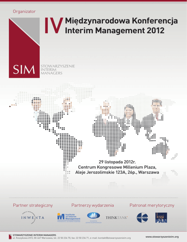 Organizator IV Międzynarodowa Konferencja Interim Management 2012 29 listopada 2012r. Centrum Kongresowe Millenium Plaza, Aleje Jerozolimskie 123A, 26p., Warszawa Partner strategiczny Partnerzy wydarzenia Patronat merytoryczny STOWARZYSZENIE INTERIM MANAGERS ul. Koszykowa 69/3, 00-667 Warszawa, tel. 22 50 234 70, fax: 22 50 234 71, e-mail: [email protected] www.stowarzyszenieim.org Program konferencji - planowane prelekcje: 8.30 - 9.30 9.30 - 10.45 Rejestracja i poranna sesja networkingowa prowadzona przez Członków SIM. Projekty typu start-up i międzynarodowy interim management. Case study projektu IM. - Thomas Thejlade, Interim Manager 10.45 - 11.30 Standardy Interim Managementu - rynek brytyjski vs. rynek polski. - Hillary Husbands, Prezes Institute of Interim Management (UK) - Roman Wendt, Interim Manager, Prezes Stowarzyszenia Interim Managers (SIM) 11.00 - 11.15 Przerwa kawowa. 11.15 - 11.30 „Interim management - nowość w zarządzaniu wiekiem i firmą” - projekt dofinansowany ze środków EFS szansą rozwoju IM w Polsce. – Monika Buchajska-Wróbel, Wice Prezes Stowarzyszenia Interim Managers (SIM) 11.30 - 12.30 Największy dylemat interim managera – pieniądze, czy relacje? Wymiana doświadczeń polskich i zagranicznych interim managerów. - David Taylor, Interim Manager z Wielkiej Brytanii 12.00 - 13.00 Dyskusja sponsorowana z udziałem firm doradztwa personalnego. 13.00 - 13.45 Lunch. 13.45 - 14.30 Case study projektu interimowego. Rozwój organizacyjny w dużej firmie. Przełomowe kroki w transformacji. Rola interim managera. - Grzegorz Sobiecki, Interim Manager - Jan Slob, Klient dla którego realizowany był projekt 14.30 - 15.30 Interim manager - nie potrzebny od zaraz? Stereotypy i wyzwania przy zatrudnianiu IM - dyskusja panelowa. - Monika Nachyła Wydarzenie towarzyszące - Warsztat IM - 30.11.2012r. Tematyka warsztatu: Postawienie właściwej diagnozy pacjenta - największa umiejętność interim managera - diagnoza i rozpoznanie sytuacji problemowej Metodyka pracy i Narzędzia IM Wzory umów IM Kalkulacja projektów IM Prowadzący: David Taylor, Interim Manager z Wielkiej Brytanii Roman Wendt, Interim Manager, Prezes SIM Limitowana liczba miejsc: 20. STOWARZYSZENIE INTERIM MANAGERS ul. Koszykowa 69/3, 00-667 Warszawa, tel. 22 50 234 70, fax: 22 50 234 71, e-mail: [email protected] www.stowarzyszenieim.org W konferencji wezmą udział: Thomas Thejlade Posiada ponad 20 letnie doświadczenie w sektorze Farmaceutycznym i Finansowym. W 2008 pracował jako Interim CEO dla SIPA (jednej z największych spółek w branży finansowej i nieruchomości w Szwajcarii) w Lozannie, w ramach 12 miesięcznego projektu. Współpracuje z najlepszych firmami sektora Farmaceutycznego, jak Sanofi-Synthelabo, GSK, Pfizer, Ferring, MSD i wiele innych jako Doradca Biznesowy i Project Manager. Szkolił przedstawicieli handlowych oraz menedżerów produktowych w ponad 7 krajach, w przeciągu ostatnich 10 lat. W trakcie swojej kariery zawodowej, pracował jako CEO dla 3 średnich przedsiębiorstw Pharma, rozwijał największą komercyjną platformę internetową dla lekarzy w Skandynawii i Europie Wschodniej, a także był głównym architektem i deweloperem pierwszego systemu Windows CRM / ETM w Europie, z ponad 10 tyś. użytkowników w okresie szczytowym. Jest Członkiem Zarządu w ponad 5 spółkach na terenie Europy oraz aktywnym Interim Managerem współpracującym z kilkoma korporacjami na całym świecie. Specjalizuje się w projektach typu start-up, rozwojem aplikacji i planów biznesowych. Od ponad 15 lat jednym z jego obszarów specjalizacji jest także integracja gospodarcza pomiędzy Wschodem i Zachodem. David Taylor Brytyjski Top Manager z 40-letnim doświadczeniem w zarządzaniu na rynkach międzynarodowych m.in. w Europie, Afryce i na Bliskim Wschodzie. Od ponad 20 lat Interim Manager, realizujący projekty zarówno w sektorze produkcyjnym, jak i usługowym, specjalizujący się szczególnie w zakresie turnaround managementu. W latach 1996-2009 koordynator krajowy i doradca finansowy działający w ramach programu EBOR, odpowiedzialny za zarządzanie ponad 40 różnymi projektami doradczymi finansowanymi przez ONZ i UE w Europie Środkowej i Wschodniej (Polska, Litwa, Rumunia) oraz na Bałkanach (Serbia i Kosowo). W latach 1970-90 współzałożyciel i Partner Zarządzający jednego z największych w Zachodniej Anglii niezależnych biur biegłych rewidentów. Jan Slob Niezwykle doświadczony holenderski Menedżer z wieloletnią praktyką w wielu międzynarodowych organizacjach. W latach 90-tych związany był z Elit Polska, w latach 1996-2000 piastował stanowisko prezesa zarządu firmy Nutricia Polska. Przez następne lata był Dyrektorem Regionalnym na Europę Wschodnią w Numico. Następnie pełnił funkcję Wiceprezesa ds. żywienia klinicznego na rynki wschodzące w zarządzie tej korporacji w Holandii. W latach 2003-2011 - Prezes Zarządu Akrikhin Polpharmy w Rosji. Wielokrotnie miał okazję współpracować z Interim Managerami realizującymi zaawansowane projekty w podlegających mu organizacjach. Monika Nachyła Top Manager z wieloletnim bogatym doświadczeniem w sektorze finansów. Karierę zawodową rozpoczynała jako audytor w firmach Artur Andersen w Warszawie i Salustro Reydel w Paryżu. W latach 1995-2000 pracowała jako Dyrektor Finansowy w firmie Sanofi-Synthelabo, wnosząc znaczący wkład w jej rozwój jako jednego z głównych graczy na polskim rynku farmaceutycznym. W ostatnich 12 latach działała w sektorze private equity. W funduszu Innova Capital jako Vice President Portfolio & Fund Operations zajmowała się budową wartości w spółkach portfelowych funduszu. Następnie w funduszu Enterprise Investors jako partner d/s Investor Relations odpowiadała za gromadzenie nowych funduszy i relacje z inwestorami. W ramach działalności dla Polskiego Stowarzyszenia Inwestorów Kapitałowych pełniła funkcję przewodniczącej Komitetu Corporate Govern