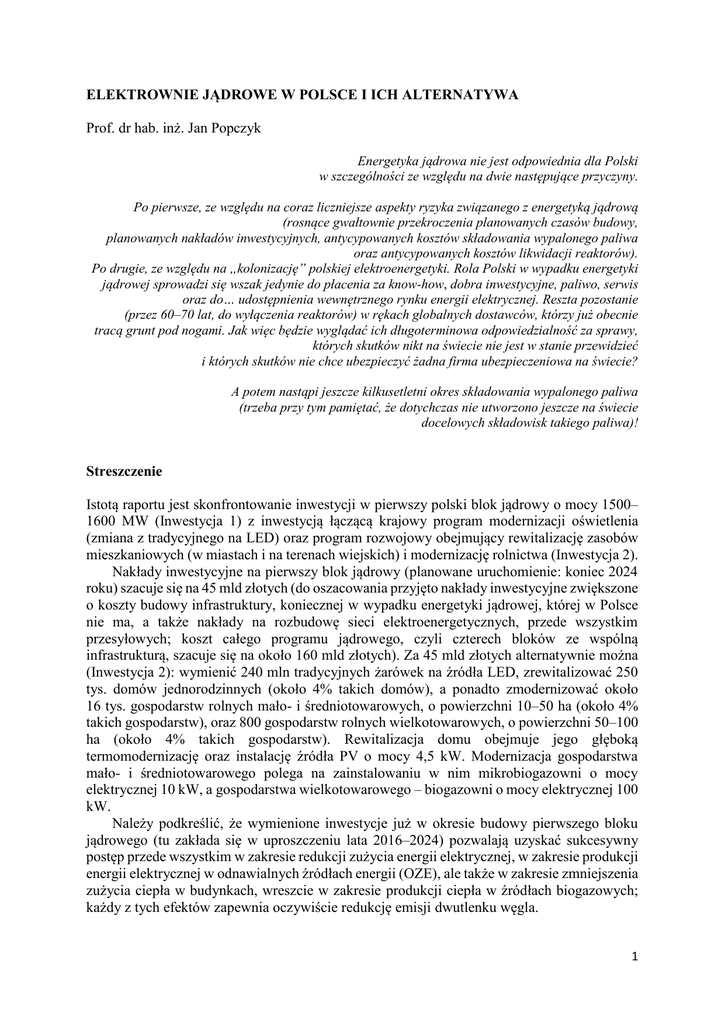 ELEKTROWNIE JĄDROWE W POLSCE I ICH ALTERNATYWA Prof. dr hab. inż. Jan Popczyk Energetyka jądrowa nie jest odpowiednia dla Polski w szczególności ze względu na dwie następujące przyczyny. Po pierwsze, ze względu na coraz liczniejsze aspekty ryzyka związanego z energetyką jądrową (rosnące gwałtownie przekroczenia planowanych czasów budowy, planowanych nakładów inwestycyjnych, antycypowanych kosztów składowania wypalonego paliwa oraz antycypowanych kosztów likwidacji reaktorów). Po drugie, ze względu na „kolonizację” polskiej elektroenergetyki. Rola Polski w wypadku energetyki jądrowej sprowadzi się wszak jedynie do płacenia za know-how, dobra inwestycyjne, paliwo, serwis oraz do… udostępnienia wewnętrznego rynku energii elektrycznej. Reszta pozostanie (przez 60–70 lat, do wyłączenia reaktorów) w rękach globalnych dostawców, którzy już obecnie tracą grunt pod nogami. Jak więc będzie wyglądać ich długoterminowa odpowiedzialność za sprawy, których skutków nikt na świecie nie jest w stanie przewidzieć i których skutków nie chce ubezpieczyć żadna firma ubezpieczeniowa na świecie? A potem nastąpi jeszcze kilkusetletni okres składowania wypalonego paliwa (trzeba przy tym pamiętać, że dotychczas nie utworzono jeszcze na świecie docelowych składowisk takiego paliwa)! Streszczenie Istotą raportu jest skonfrontowanie inwestycji w pierwszy polski blok jądrowy o mocy 1500– 1600 MW (Inwestycja 1) z inwestycją łączącą krajowy program modernizacji oświetlenia (zmiana z tradycyjnego na LED) oraz program rozwojowy obejmujący rewitalizację zasobów mieszkaniowych (w miastach i na terenach wiejskich) i modernizację rolnictwa (Inwestycja 2). Nakłady inwestycyjne na pierwszy blok jądrowy (planowane uruchomienie: koniec 2024 roku) szacuje się na 45 mld złotych (do oszacowania przyjęto nakłady inwestycyjne zwiększone o koszty budowy infrastruktury, koniecznej w wypadku energetyki jądrowej, której w Polsce nie ma, a także nakłady na rozbudowę sieci elektroenergetycznych, przede wszystkim przesyłowych; koszt całego programu jądrowego, czyli czterech bloków ze wspólną infrastrukturą, szacuje się na około 160 mld złotych). Za 45 mld złotych alternatywnie można (Inwestycja 2): wymienić 240 mln tradycyjnych żarówek na źródła LED, zrewitalizować 250 tys. domów jednorodzinnych (około 4% takich domów), a ponadto zmodernizować około 16 tys. gospodarstw rolnych mało- i średniotowarowych, o powierzchni 10–50 ha (około 4% takich gospodarstw), oraz 800 gospodarstw rolnych wielkotowarowych, o powierzchni 50–100 ha (około 4% takich gospodarstw). Rewitalizacja domu obejmuje jego głęboką termomodernizację oraz instalację źródła PV o mocy 4,5 kW. Modernizacja gospodarstwa mało- i średniotowarowego polega na zainstalowaniu w nim mikrobiogazowni o mocy elektrycznej 10 kW, a gospodarstwa wielkotowarowego – biogazowni o mocy elektrycznej 100 kW. Należy podkreślić, że wymienione inwestycje już w okresie budowy pierwszego bloku jądrowego (tu zakłada się w uproszczeniu lata 2016–2024) pozwalają uzyskać sukcesywny postęp przede wszystkim w zakresie redukcji zużycia energii elektrycznej, w zakresie produkcji energii elektrycznej w odnawialnych źródłach energii (OZE), ale także w zakresie zmniejszenia zużycia ciepła w budynkach, wreszcie w zakresie produkcji ciepła w źródłach biogazowych; każdy z tych efektów zapewnia oczywiście redukcję emisji dwutlenku węgla. 1 Alternatywna Inwestycja 2 zapewnia, po jej całkowitej realizacji, łączny roczny efekt na rynku energii elektrycznej równy ponad 18 TWh (15 TWh dotyczy redukcji zużycia w obszarze oświetlenia, 3 TWh – produkcji w budynkowych źródłach fotowoltaicznych (PV) zintegrowanych z domami jednorodzinnymi oraz w mikrobiogazowniach i biogazowniach w gospodarstwach rolnych). Jest to efekt ponad 1,5 raza większy niż efekt z Inwestycji 1 (roczna produkcja bloku jądrowego wynosi 11 TWh). Inwestycja 2 zapewnia ponadto bardzo istotny dodatkowy efekt rzeczowy na rynku ciepła; łączny efekt roczny wynosi na tym rynku 5,4 TWh (3,5 TWh dotyczy redukcji zużycia ciepła na cele grzewcze w domach jednorodzinnych, 1,9 TWh – produkcji ciepła w mikrobiogazowniach i biogazowniach w gospodarstwach rolnych). Efekty Inwestycji 2 na rynku energii elektrycznej i rynku ciepła przekładają się bardzo korzystnie na redukcję emisji dwutlenku węgla. Inwestycja 2 zapewnia mianowicie roczne zmniejszenie emisji CO2 wynoszące około 18 mln ton, podczas gdy blok jądrowy – niecałe 10 mln ton. Prosty okres zwrotu kapitału z Inwestycji 2 (około 3,5 roku) jest o rząd mniejszy niż z Inwestycji 1 (jeśli za okres zwrotu dla bloku jądrowego przyjąć – w ślad za okresem gwarantowanych cen w brytyjskim kontrakcie różnicowym dla elektrowni Hinkley Point C – 35 lat). O tym niezwykle krótkim okresie decyduje (powszechna) modernizacja oświetlenia. Należy podkreślić, że potencjał tego efektu (modernizacji oświetlenia) dotyczy tylko pierwszego bloku jądrowego (potencjał wyczerpuje się całkowicie wraz z wymianą 240 mln tradycyjnych żarówek na oświetlenie LED). Mimo to podejście zaprezentowane w ekspertyzie, polegające na oszacowaniu efektów inwestycji alternatywnej w stosunku tylko do pierwszego bloku jądrowego (a nie w stosunku do całego programu jądrowego) ma charakter strategiczny. Decydują o tym następujące przyczyny: 1. 2. 3. 4. Alternatywna Inwestycja 2, o bardzo krótkim okresie zwrotu nakładów, ma praktycznie ryzyko zerowe w porównaniu z wielkim ryzykiem długoterminowym pierwszego bloku jądrowego. Poza tym Inwestycja 2 jest finansowana przez prosumentów, co oznacza, że finansowanie ma charakter bardzo rozproszony i tworzy fundament pod trwały wzrost efektywności energetycznej (prosumenci, pobudzeni do działania, już nigdy nie dadzą sobie odebrać szansy na partycypację prosumencką i niezale
