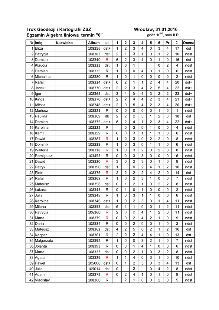 Wroc ław, 31.01.2016 I rok Geodezji i Kartografii ZSZ Egzamin Algebra liniowa termin "0" Nr Imię 1 Eliza 2 Patrycja 3 Damian 4 Klaudia 5 Damian 6 Michalina 7 Rafał 8 Jacek 9 Igor 10 Kinga 11 Miłosz 12 Mariusz 13 Paulina 14 Damian 15 Karolina 16 Kamil 17 Dawid 18 Dominik 19 Wiktoria 20 Remigiusz 21 Dawid 22 Patryk 23 Piotr 24 Rafał 25 Mateusz 26 Łukasz 27 Julia 28 Karolina 29 Milena 30 Patrycja 31 Marta 32 Daria 33 Mateusz 34 Kacper 35 Małgorzata 36 Jolanta 37 Marta 38 Agata 39 Paweł 40 Julia 41 Adam 42 Vladislav Nazwisko godz 1000, sala II R Album zal 1 2 3 4 5 6 Pr Σ Ocena 108356 108383 108340 108333 108325 108380 108324 108330 108365 108370 108348 108321 108369 108375 108322 108359 108387 108339 108318 103453 108320 108390 108376 108368 108358 108343 108345 108346 108353 106160 108379 108334 108362 108361 108392 108393 108323 108329 105000 105014 108372 108360 dst+ 1 0 3 4 17 dst 2 3 3 4 dst 2 1 1 0 1 2 10 ndst R 6 2 3 4 0 1 0 16 dst dst 1 0 1 0 2 4 ndst R 1 0 0 4 0 1 0 6 ndst R 1 0 1 0 0 0 0 2 ndst dst+ 6 2 1 1 2 4 4 20 dst+ dst+ 2 2 5 4 22 dst+ 3 3 5 4 dst 2 4 4 3 2 2 23 dst+ dst+ 2 2 4 4 2 3 4 21 dst+ dst+ 2 0 5 4 2 3 4 20 dst+ R 0 0 0 0 0 1 0 1 ndst db 2 2 2 3 1 2 6 18 dst dst+ 6 2 4 1 2 3 4 22 dst+ 1 0 0 4 ndst 0 3 3 0 R 0 0 1 1 1 0 6 ndst R 1 0 3 0 2 2 0 8 ndst R 1 0 3 0 1 1 0 6 ndst R 1 0 3 2 0 2 0 8 ndst R 0 0 3 3 0 0 0 6 ndst R 3 0 2 3 0 1 0 9 ndst dst 1 0 2 4 1 2 10 ndst R 2 2 2 2 4 2 0 14 dst R R 1 0 2 3 1 0 0 7 ndst dst 0 1 2 1 0 2 2 8 ndst R 0 1 0 1 0 0 0 2 ndst R 1 0 3 1 1 0 0 6 ndst dst+ 1 0 2 3 0 1 4 11 ndst dst 6 0 1 2 11 ndst 2 1 2 0 R 1 0 4 1 2 0 11 ndst R 0 0 2 4 2 1 0 9 ndst R 0 0 2 0 0 1 0 3 ndst dst 4 2 1 2 16 dst 2 5 2 0 R 2 0 4 4 1 0 13 dst R 1 0 0 3 2 1 0 7 ndst R 0 0 1 4 1 0 0 6 ndst dst 0 0 2 1 0 3 2 8 ndst R 1 1 4 0 3 1 0 10 ndst dst+ 0 1 3 0 3 4 13 dst dst 0 2 2 0 4 2 8 ndst R 0 4 1 1 0 1 0 8 ndst 0 0 2 0 5 ndst R 2 2 7 6 5 4 3 2 1 0 1 2 3 4 5 6 7 8 9 10 11 12 13 14 15 16 17 18 19 20 21 22 23 24 25 26 27 28 29 35 30 25 20 15 10 5 0 ndst dst dst+ db db+ Uwaga: Osoby, które uzyskały co najmniej 13 pkt zdały egzamin i uzyskały zaliczenie ćwiczeń. Czerwona litera R w kolumnie "zal" oznacza zdobycie zaliczenia ćwiczeń. Prace egzaminacyjne będą do wglądu w niedzielę od godz. 9.00 pod salą VR, gdzie o 10.00 rozpoczniemy egzamin (I termin)