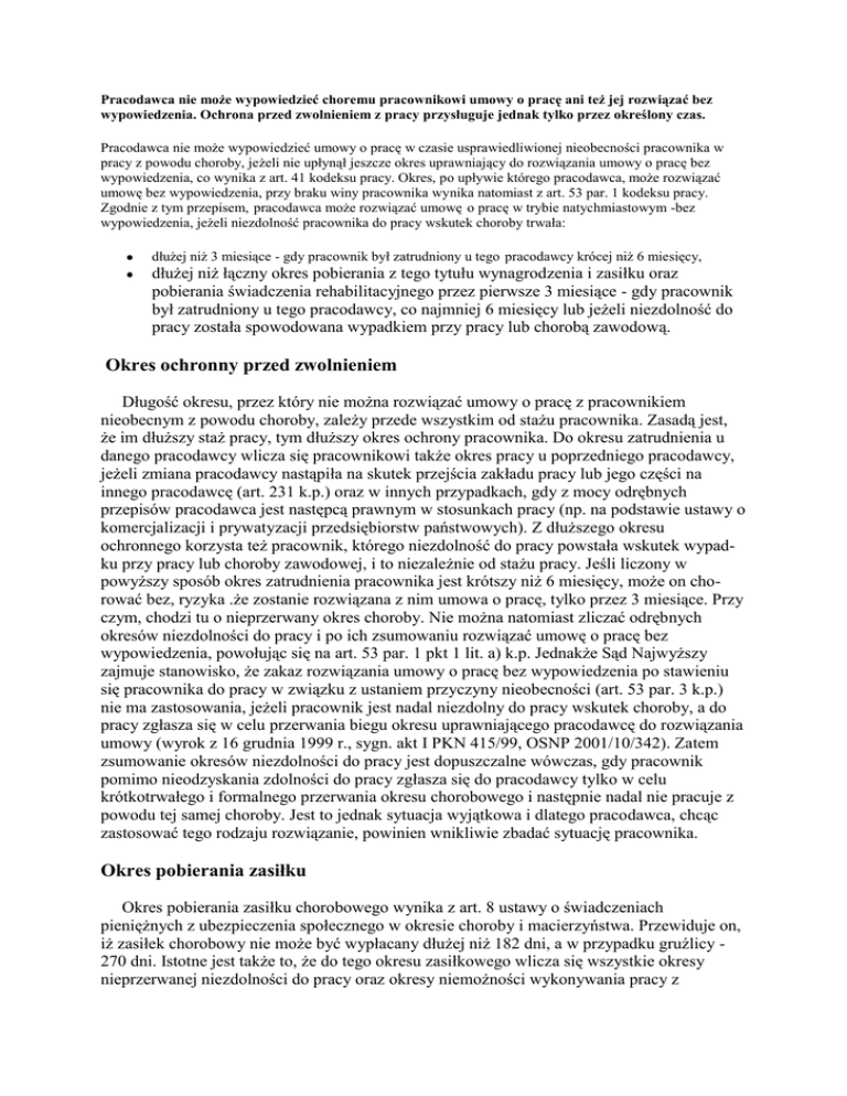 Pracodawca nie może wypowiedzieć choremu pracownikowi umowy o pracę ani też jej rozwiązać bez wypowiedzenia. Ochrona przed zwolnieniem z pracy przysługuje jednak tylko przez określony czas. Pracodawca nie może wypowiedzieć umowy o pracę w czasie usprawiedliwionej nieobecności pracownika w pracy z powodu choroby, jeżeli nie upłynął jeszcze okres uprawniający do rozwiązania umowy o pracę bez wypowiedzenia, co wynika z art. 41 kodeksu pracy. Okres, po upływie którego pracodawca, może rozwiązać umowę bez wypowiedzenia, przy braku winy pracownika wynika natomiast z art. 53 par. 1 kodeksu pracy. Zgodnie z tym przepisem, pracodawca może rozwiązać umowę o pracę w trybie natychmiastowym -bez wypowiedzenia, jeżeli niezdolność pracownika do pracy wskutek choroby trwała: dłużej niż 3 miesiące - gdy pracownik był zatrudniony u tego pracodawcy krócej niż 6 miesięcy, dłużej niż łączny okres pobierania z tego tytułu wynagrodzenia i zasiłku oraz pobierania świadczenia rehabilitacyjnego przez pierwsze 3 miesiące - gdy pracownik był zatrudniony u tego pracodawcy, co najmniej 6 miesięcy lub jeżeli niezdolność do pracy została spowodowana wypadkiem przy pracy lub chorobą zawodową. Okres ochronny przed zwolnieniem Długość okresu, przez który nie można rozwiązać umowy o pracę z pracownikiem nieobecnym z powodu choroby, zależy przede wszystkim od stażu pracownika. Zasadą jest, że im dłuższy staż pracy, tym dłuższy okres ochrony pracownika. Do okresu zatrudnienia u danego pracodawcy wlicza się pracownikowi także okres pracy u poprzedniego pracodawcy, jeżeli zmiana pracodawcy nastąpiła na skutek przejścia zakładu pracy lub jego części na innego pracodawcę (art. 231 k.p.) oraz w innych przypadkach, gdy z mocy odrębnych przepisów pracodawca jest następcą prawnym w stosunkach pracy (np. na podstawie ustawy o komercjalizacji i prywatyzacji przedsiębiorstw państwowych). Z dłuższego okresu ochronnego korzysta też pracownik, którego niezdolność do pracy powstała wskutek wypadku przy pracy lub choroby zawodowej, i to niezależnie od stażu pracy. Jeśli liczony w powyższy sposób okres zatrudnienia pracownika jest krótszy niż 6 miesięcy, może on chorować bez, ryzyka .że zostanie rozwiązana z nim umowa o pracę, tylko przez 3 miesiące. Przy czym, chodzi tu o nieprzerwany okres choroby. Nie można natomiast zliczać odrębnych okresów niezdolności do pracy i po ich zsumowaniu rozwiązać umowę o pracę bez wypowiedzenia, powołując się na art. 53 par. 1 pkt 1 lit. a) k.p. Jednakże Sąd Najwyższy zajmuje stanowisko, że zakaz rozwiązania umowy o pracę bez wypowiedzenia po stawieniu się pracownika do pracy w związku z ustaniem przyczyny nieobecności (art. 53 par. 3 k.p.) nie ma zastosowania, jeżeli pracownik jest nadal niezdolny do pracy wskutek choroby, a do pracy zgłasza się w celu przerwania biegu okresu uprawniającego pracodawcę do rozwiązania umowy (wyrok z 16 grudnia 1999 r., sygn. akt I PKN 415/99, OSNP 2001/10/342). Zatem zsumowanie okresów niezdolności do pracy jest dopuszczalne wówczas, gdy pracownik pomimo nieodzyskania zdolności do pracy zgłasza się do pracodawcy tylko w celu krótkotrwałego i formalnego przerwania okresu chorobowego i następnie nadal nie pracuje z powodu tej samej choroby. Jest to jednak sytuacja wyjątkowa i dlatego pracodawca, chcąc zastosować tego rodzaju rozwiązanie, powinien wnikliwie zbadać sytuację pracownika. Okres pobierania zasiłku Okres pobierania zasiłku chorobowego wynika z art. 8 ustawy o świadczeniach pieniężnych z ubezpieczenia społecznego w okresie choroby i macierzyństwa. Przewiduje on, iż zasiłek chorobowy nie może być wypłacany dłużej niż 182 dni, a w przypadku gruźlicy 270 dni. Istotne jest także to, że do tego okresu zasiłkowego wlicza się wszystkie okresy nieprzerwanej niezdolności do pracy oraz okresy niemożności wykonywania pracy z przyczyn określonych w art. 6 ust. 2 ww. ustawy (m.in. z powodu przebywania w: stacjonarnym zakładzie lecznictwa odwykowego w celu leczenia uzależnienia alkoholowego, stacjonarnym zakładzie opieki zdrowotnej w celu leczenia uzależnienia od środków odurzających lub substancji psychotropowych). Do okresu zasiłkowego wlicza się także okresy poprzedniej niezdolności do pracy, spowodowanej tą samą chorobą, jeżeli przerwa pomiędzy ustaniem poprzedniej a powstaniem ponownej niezdolności do pracy nie przekraczała 60 dni. Należy zapamiętać, że ze sformułowania zawartego w art. 53 par. 1 pkt 1 lit. b) k.p. „pracodawca może rozwiązać umowę o pracę bez wypowiedzenia, jeżeli niezdolność pracownika do pracy wskutek choroby trwa dłużej niż łączny okres pobierania z tego tytułu wynagrodzenia i zasiłku oraz pobierania świadczenia rehabilitacyjnego przez pierwsze 3 miesiące" nie można wysunąć wniosku, że pracownik niezdolny, do pracy z powoda choroby nie może być zwolniony przez okres wypłaty wynagrodzenia oraz dodany do tego dalszy czas pobierania zasiłku chorobowego. Okresów tych bowiem nie sumuje się, co wynika z faktu, że do okresu zasiłkowego wlicza się okresy pobierania wynagrodzenia w czasie choroby (art. 12 ust. 1 zd. 2 ustawy o świadczeniach pieniężnych z ubezpieczenia społecznego w razie choroby i macierzyństwa). Zaliczanie świadczenia rehabilitacyjnego Obowiązek uwzględniania okresu pobierania świadczenia rehabilitacyjnego przez pierwsze 3 miesiące został wprowadzony od 8 lutego 2005 r. Jest to rozwiązanie odmienne od poprzedniego, gdzie okres pobierania tego świadczenia nie był już wliczany do okresu ochronnego. Istotne jest jednak, że dolicza się tu tylko okres pobierania świadczenia rehabilitacyjnego przez pierwsze 3 miesiące. Natomiast nie wlicza się dalszego okresu pobierania tego świadczenia, które łącznie może przysługiwać przez 12 miesięcy. Podkreślić jednak trzeba, że konieczność doliczania okre