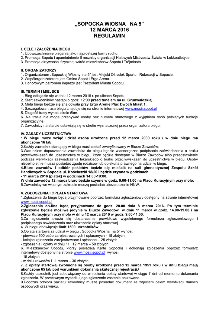 „SOPOCKA WIOSNA NA 5” 12 MARCA 2016 REGULAMIN I. CELE I ZAŁOŻENIA BIEGU 1. Upowszechnianie biegania jako najprostszej formy ruchu. 2. Promocja Sopotu i upamiętnienie II rocznicy organizacji Halowych Mistrzostw Świata w Lekkoatletyce 3. Promocja aktywności fizycznej wśród mieszkańców Sopotu i Trójmiasta. II. ORGANIZATORZY 1. Organizatorem „Sopockiej Wiosny na 5” jest Miejski Ośrodek Sportu i Rekreacji w Sopocie. 2. Współorganizatorem jest Gmina Sopot i Ergo Arena. 3. Honorowym patronem imprezy jest Prezydent Miasta Sopotu. III. TERMIN I MIEJSCE 1. Bieg odbędzie się w dniu 12 marca 2016 r. po ulicach Sopotu. 2. Start zawodników nastąpi o godz. 12:00 przed tunelem na ul. Grunwaldzkiej. 3. Meta biegu będzie się znajdowała przy Ergo Arenie Plac Dwóch Miast 1. 4. Szczegółowa trasa biegu znajduje się na stronie internetowej www.mosir.sopot.pl 5. Długość trasy wynosi około 5km. 6. Na trasie nie mogą przebywać osoby bez numeru startowego z wyjątkiem osób pełniących funkcje organizacyjne. 7. Zawodnicy na starcie ustawiają się w strefie wyznaczonej przez organizatora biegu. IV. ZASADY UCZESTNICTWA 1.W biegu może wziąć udział osoba urodzona przed 12 marca 2000 roku / w dniu biegu ma ukończone 16 lat/ 2.Każdy zawodnik startujący w biegu musi zostać zweryfikowany w Biurze Zawodów. 3.Warunkiem dopuszczenia zawodnika do biegu będzie własnoręczne podpisanie zaświadczenia o braku przeciwwskazań do uczestnictwa w biegu, które będzie dostępne w Biurze Zawodów albo przedstawienie podczas weryfikacji zaświadczenia lekarskiego o braku przeciwwskazań do uczestnictwa w biegu. Osoby niepełnoletnie muszą posiadać zgodę rodziców lub opiekuna prawnego na udział w biegu. 4.Biuro zawodów i odbiór pakietów będzie się mieścić na sali gimnastycznej Zespołu Szkół Handlowych w Sopocie ul. Kościuszki 18/20 i będzie czynne w godzinach. - 11 marca 2016 (piątek) w godzinach 14:00-19:00. W dniu zawodów 12 marca biuro będzie czynne w godz. 9.00-11.00 na Placu Kuracyjnym przy molo. 5.Zawodnicy we własnym zakresie muszą posiadać ubezpieczenie NNW. V. ZGŁOSZENIA I OPŁATA STARTOWA 1.Zgłoszenia do biegu będą przyjmowane poprzez formularz zgłoszeniowy dostępny na stronie internetowej www.mosir.sopot.pl 2.Zgłoszenia on-line będą przyjmowane do godz. 20.00 dnia 8 marca 2016. Po tym terminie zgłoszenie będzie możliwe jedynie w Biurze Zawodów w dniu 11 marca w godz. 14.00-19.00 i na Placu Kuracyjnym przy molo w dniu 12 marca 2016 w godz. 9.00-11.00. 3.Za zgłoszenie uważa się dostarczenie prawidłowo wypełnionego formularza zgłoszeniowego i podpisanego oświadczenia oraz uiszczenie opłaty startowej. 4. W biegu obowiązuje limit 1500 uczestników. 5.Opłata startowa za udział w biegu „ Sopocka Wiosna na 5” wynosi: - pierwsze 500 osób zarejestrowanych i opłaconych - 15 złotych - kolejne zgłoszenia zarejestrowane i opłacone – 25 złotych - zgłoszenia i opłaty w dniu 11 i 12 marca – 50 złotych. 6. Mieszkańców Sopotu, którzy posiadają Kartę Sopocką i dokonają zgłoszenia poprzez formularz internetowy dostępny na stronie www.mosir.sopot.pl wynosi: - 15 złotych - w dniu zawodów i 11 marca – 30 złotych 7. Z opłaty startowej zwolnione są osoby urodzone przed 12 marca 1951 roku / w dniu biegu mają ukończone 65 lat/ pod warunkiem dokonania skutecznej rejestracji./ 8.Każdy uczestnik jest zobowiązany do wniesienia opłaty startowej w ciągu 7 dni od momentu dokonania zgłoszenia. W przeciwnym wypadku jego zgłoszenie zostanie anulowane. 9.Podczas odbioru pakietu zawodnicy muszą posiadać dokument ze zdjęciem celem weryfikacji danych osobowych oraz wieku. 10. Opłata raz uiszczona nie podlega zwrotowi. Nie ma możliwości przeniesienia raz wniesionej opłaty na innego uczestnika. 11. W ramach opłaty startowej każdy uczestnik biegu głównego otrzymuje: - pakiet startowy - pamiątkowy odlewany medal. - inne………. VI. KLASYFIKACJA W biegu prowadzone będą następujące klasyfikacje: 1. W kategorii generalnej Kobiet i Mężczyzn 2. W kategoriach wiekowych Kobiet i Mężczyzn: K 16-19 M 16-19 rocznik 2000 - 1997 K 20-29 M 20-29 rocznik 1996 - 1987 K 30-39 M 30-39 rocznik 1986 – 1977 K 40-49 M 40-49 rocznik 1976 - 1967 K 50-59 M 50-59 rocznik 1966 – 1957 K 60-69 M 60-69 rocznik 1956 - 1947 K 70-79 M 70-79 rocznik 1946 - 1937 K 80 i starsze M 80 i starsi rocznik 1936 i starsi VII. NAGRODY 1.Wszyscy zawodnicy, którzy ukończą bieg otrzymają na mecie pamiątkowe medale. 2.Zdobywcy miejsc I-III w kategorii open i w poszczególnych kategoriach wiekowych otrzymają pamiątkowe statuetki i nagrody. VIII. POSTANOWIENIA KOŃCOWE 1. Wszystkich uczestników biegu obowiązuje niniejszy regulamin. 2.Organizator zastrzega sobie prawo do przeprowadzenia z każdym z uczestników wywiadu, robienia mu zdjęć i filmowania na potrzeby reklamowe, promocyjne, wykorzystania w Internecie lub w transmisjach radiowo-telewizyjnych oraz na inne potrzeby komercyjne. 3.Na miejsce biegu zabrania się wnoszenia środków odurzających, nielegalnych substancji, środków podnoszących wydajność fizyczną oraz środków alkoholowych jakiegokolwiek rodzaju. Uczestnikom zabrania się zażywania takich środków i substancji zarówno przed jak i podczas biegu pod warunkiem wykluczenia z niego. W wypadku stwierdzenia, że uczestnik narusza powyższy zakaz, organizator zastrzega sobie możliwość niedopuszczenia go do udziału w biegu lub wykluczenia go w jego trakcie. 4.Każdy uczestnik biegu jest zobowiązany do umieszczenia numeru startowego z przodu, na wysokości klatki piersiowej pod karą dyskwalifikacji 5.Organizator zapewnia opiekę medyczną na trasie i mecie biegu 6.Organizator zapewnia szatnie na Placu Kuracyjnym przy molo i przy Ergo Arenie Pl. Dwóch Miast 1 7.Organizator nie odpowiada za rzeczy zgubione w trakcie imprezy. 8.Wyniki będą opublikowane na stronie internetowej imprezy www.mosir.sopot.pl oraz przekazane do i