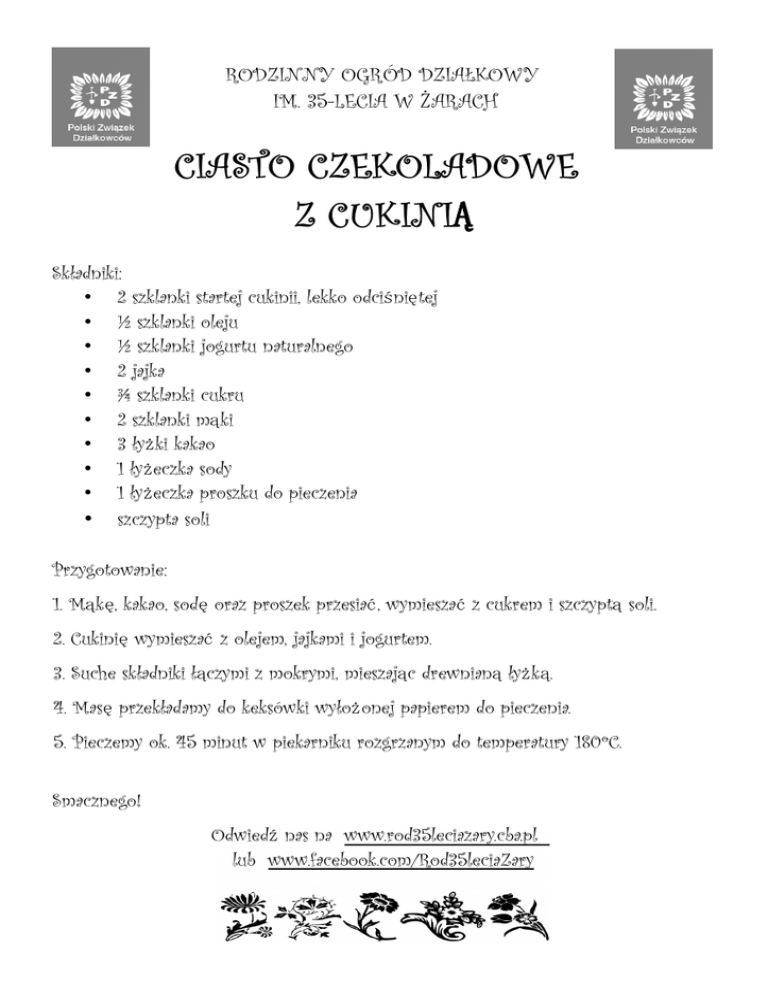RODZINNY OGRÓD DZIAŁKOWY IM. 35-LECIA W ŻARACH CIASTO CZEKOLADOWE Z CUKINIĄ Składniki: • 2 szklanki startej cukinii, lekko odciśniętej • ½ szklanki oleju • ½ szklanki jogurtu naturalnego • 2 jajka • ¾ szklanki cukru • 2 szklanki mąki • 3 łyżki kakao • 1 łyżeczka sody • 1 łyżeczka proszku do pieczenia • szczypta soli Przygotowanie: 1. Mąkę, kakao, sodę oraz proszek przesiać, wymieszać z cukrem i szczyptą soli. 2. Cukinię wymieszać z olejem, jajkami i jogurtem. 3. Suche składniki łączymi z mokrymi, mieszając drewnianą łyżką. 4. Masę przekładamy do keksówki wyłożonej papierem do pieczenia. 5. Pieczemy ok. 45 minut w piekarniku rozgrzanym do temperatury 180ºC. Smacznego! Odwiedź nas na www.rod35leciazary.cba.pl lub www.facebook.com/Rod35leciaZary