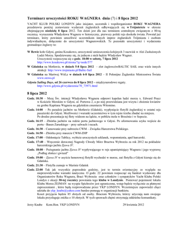 Terminarz uroczystości ROKU WAGNERA dnia (7) i 8 lipca 2012 YACHT KLUB POLSKI LONDYN jako inicjator, uczestnik i współorganizator ROKU WAGNERA przedstawia poniżej zestawienie wydarzeń żeglarskich odbywających się w Trójmieście w okresie obejmującym niedzielę 8 lipca 2012. Ten dzień jest dla nas terminem centralnym związanym z 80-tą rocznicą wyruszenia Władysława Wagnera w historyczny, pierwszy polski rejs dookoła świata. Powstał już terminarz, który powinien umożliwić uczestnikom innych imprez żeglarskich Trójmiasta i osobom indywidualnym, dołączenie do uroczystości Wagnerowskich. Te pozostałe uroczystości i wydarzenia gromadzące żeglarzy to: W Rewie koło Gdyni, gmina Kosakowo, uroczystość umieszczenia kolejnych 3 nazwisk w Alei Zasłużonych Ludzi Morza. Spodziewamy się, że jednym z nich będzie Władysław Wagner. Uroczystość rozpoczyna się o godz. 18:00 w sobotę, 7 lipca 2012 http://www.kosakowo.pl/strona/?q=node/577 W Gdańsku na Motławie, w dniach 5-8 lipca 2012 – zlot żaglowcówBALTIC SAIL oraz wiele innych atrakcji http://www.trojmiasto.pl/Baltic-Sail W Gdańsku na Martwej Wiśl,e w dniach 6-8 lipca 2012 – II Polonijne Żeglarskie Mistrzostwa Świata www.stewa.pl Gdynia Sailing Days, od 26 czerwca do 8 lipca 2012 – międzynarodowe regaty. http://www.gdynia.pl/wydarzenia/70_73971.html 8 lipca 2012 Godz. 10:30 – Mszę Św. intencji Władysława Wagnera odprawi kapelan ludzi morza x. Edward Pracz w Kościele Morskim w Gdyni, ul. Portowa 2, a po niej przewidziana jest wizyta i złożenie kwiatów na grobie Kapitana Wagnera na gdyńskim cmentarzu Witomino. Godz. 14:00 – Po paradzie jachtów na Motławie (Gdańsk), wypłynięcie flotylli żeglarskiej w ostatni rejs pasażerski do Gdyni. Możliwości i warunki uczestnictwa w tym rejsie trzeba zbadać na miejscu. Po drodze prezentacja tej floty widzom na lądzie, w pobliżu mola w Brzeźnie i w Sopocie. Godz. 16:15 – Zbiórka jachtów na redzie portu jachtowego w Gdyni. Po uformowaniu szyku wejście do portu - Basen Zaruskiego – przy salwach i racach. Godz. 16:30 – Cumowanie przy nabrzeżu CWM – Związku Harcerstwa Polskiego. Godz. 16:50 – Zbiórka przy maszcie CWM-ZHP Godz. 17:00 – Odsłonięcie Tablicy, wybicie uroczystych szklanek, wspomnienia, apel harcerski. Godz. 17:40 – Wręczenie dorocznej Nagrody Chwały Mórz Bractwa Wybrzeża za rok 2012 na pokładzie harcerskiego jachtu Zjawa IV. Godz. 18:00 – Pożegnanie jachtu Zjawa IV wypływającego w rejs upamiętniający Wagnera i jego wyprawę „Podług słońca i gwiazd” Godz. 19:00 – Zjawa IV w asyście honorowej flotylli wychodzi w morze, zaś flotylla z Gdyni kieruje się do Gdańska. Godz. 21:30 – Flotylla cumuje w Marinie Gdańsk Godz. 22:00 Tak jak wszystkie poprzednie godziny, jest to termin orientacyjny ze względu na nieprzewidywalne warunki nautyczne. O godz. 22 powinien rozpocząć się bankiet wydawany dla Organizatorów Roku Wagnera, Braci Wybrzeża oraz członków i sympatyków Yacht Klubu Polski Londyn z okazji 30-tej rocznicy powstania tego klubu w Londynie. Ponieważ pojemność lokalu Klubu Morza ZEJMAN na wyspie Spichrzów jest ograniczona, wstęp będzie wyłącznie za płatnymi zaproszeniami , które będą rozprowadzane przez YKP LONDYN. Wcześniejsze zapowiedzi chęci udziału do [email protected] bardzo pomogą w organizacji bankietu. Koszt przyjęcia będzie 85 złotych od osoby. Braciom Wybrzeża, którzy użyczają nam swojego lokalu przysluguje zniżka o 10 złotych. W tych sprawach chętni otrzymają oddzielne komunikaty. Jerzy Knabe Kom.Hon. YKP LONDYN 29 kwietnia 2012
