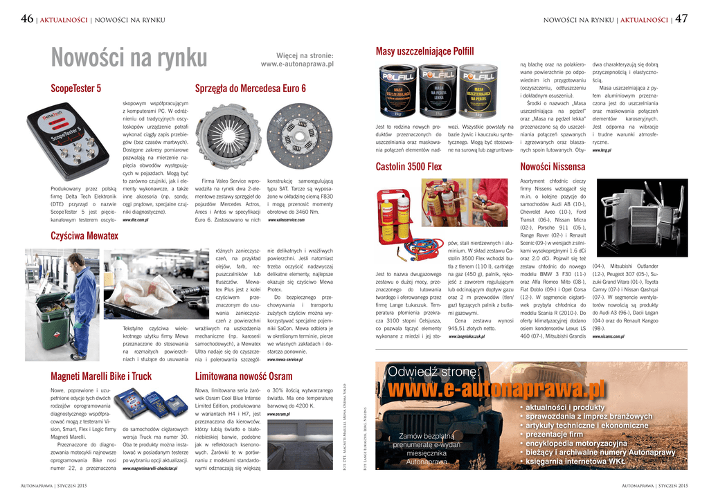 46 | AKTUALNOŚCI | NOWOŚCI NA RYNKU NOWOŚCI NA RYNKU | AKTUALNOŚCI | Nowości na rynku ScopeTester 5 Produkowany przez polską firmę Delta Tech Elektronik (DTE) przyrząd o nazwie ScopeTester 5 jest pięcio kanałowym testerem oscylo- Masy uszczelniające Polfill Więcej na stronie: www.e-autonaprawa.pl Sprzęgła do Mercedesa Euro 6 skopowym współpracującym z komputerami PC. W odróżnieniu od tradycyjnych oscyloskopów urządzenie potrafi wykonać ciągły zapis przebiegów (bez czasów martwych). Dostępne zakresy pomiarowe pozwalają na mierzenie napięcia obwodów występujących w pojazdach. Mogą być to zarówno czujniki, jak i elementy wykonawcze, a także inne akcesoria (np. sondy, cęgi prądowe, specjalne czujniki diagnostyczne). www.dte.com.pl Jest to rodzina nowych produktów przeznaczonych do uszczelniania oraz maskowania połączeń elementów nad- Firma Valeo Service wprowadziła na rynek dwa 2-elementowe zestawy sprzęgieł do pojazdów Mercedes Actros, Arocs i Antos w specyfikacji Euro 6. Zastosowano w nich Nowości Nissensa Jest to nazwa dwugazowego zestawu o dużej mocy, przeznaczonego do lutowania twardego i oferowanego przez firmę Lange Łukaszuk. Temperatura płomienia przekracza 3100 stopni Celsjusza, co pozwala łączyć elementy wykonane z miedzi i jej sto- Asortyment chłodnic cieczy firmy Nissens wzbogacił się m.in. o kolejne pozycje do samochodów Audi A8 (10-), Chevrolet Aveo (10-), Ford Transit (06-), Nissan Micra (02-), Porsche 911 (05-), Range Rover (02-) i Renault Scenic (09-) w wersjach z silnikami wysokoprężnymi 1.6 dCi oraz 2.0 dCi. Pojawił się też zestaw chłodnic do nowego modelu BMW 3 F30 (11-) oraz Alfa Romeo Mito (08-), Fiat Doblo (09-) i Opel Corsa (12-). W segmencie ciężarówek przybyła chłodnica do modelu Scania R (2010-). Do oferty klimatyzacyjnej dodano osiem kondensorów Lexus LS 460 (07-), Mitsubishi Grandis konstrukcję samoregulującą typu SAT. Tarcze są wyposażone w okładzinę cierną F830 i mogą przenosić momenty obrotowe do 3460 Nm. www.valeoservice.com nie delikatnych i wrażliwych powierzchni. Jeśli natomiast trzeba oczyścić nadzwyczaj delikatne elementy, najlepsze okazuje się czyściwo Mewa Protex. Do bezpiecznego przechowywania i transportu zużytych czyściw można wykorzystywać specjalne pojemniki SaCon. Mewa odbiera je w określonym terminie, pierze we własnych zakładach i dostarcza ponownie. Limitowana nowość Osram Nowe, poprawione i uzupełnione edycje tych dwóch rodzajów oprogramowania diagnostycznego współpracować mogą z testerami Vision, Smart, Flex i Logic firmy Magneti Marelli. Przeznaczone do diagnozowania motocykli najnowsze oprogramowania Bike nosi numer 22, a przeznaczona Nowa, limitowana seria żarówek Osram Cool Blue Intense Limited Edition, produkowana w wariantach H4 i H7, jest przeznaczona dla kierowców, którzy lubią światło o białoniebieskiej barwie, podobne jak w reflektorach ksenonowych. Żarówki te w porównaniu z modelami standardowymi odznaczają się większą Autonaprawa | Styczeń 2015 www.magnetimarelli-checkstar.pl www.langelukaszuk.pl www.lerg.pl (04-), Mitsubishi Outlander (12-), Peugeot 307 (05-), Suzuki Grand Vitara (01-), Toyota Camry (07-) i Nissan Qashqai (07-). W segmencie wentylatorów nowością są produkty do Audi A3 (96-), Dacii Logan (04-) oraz do Renault Kangoo (98-). www.nissens.com.pl o 30% ilością wytwarzanego światła. Ma ono temperaturę barwową do 4200 K. www.osram.pl Odwiedź stronę: www.e-autonaprawa.pl Fot. Lange Łukaszuk, Lerg, Nissens Magneti Marelli Bike i Truck do samochodów ciężarowych wersja Truck ma numer 30. Oba te produkty można instalować w posiadanym testerze po wybraniu opcji aktualizacji. pów, stali nierdzewnych i aluminium. W skład zestawu Castolin 3500 Flex wchodzi butla z tlenem (110 l), cartridge na gaz (450 g), palnik, rękojeść z zaworem regulującym lub odcinającym dopływ gazu oraz 2 m przewodów (tlen/ gaz) łączących palnik z butlami gazowymi. Cena zestawu wynosi 945,51 złotych netto. dwa charakteryzują się dobrą przyczepnością i elastycznością. Masa uszczelniająca z pyłem aluminiowym przeznaczona jest do uszczelniania oraz maskowania połączeń elementów karoseryjnych. Jest odporna na wibracje i trudne warunki atmosferyczne. www.mewa-service.pl Fot. DTE, Magneti Marelli, Mewa, Osram, Valeo Tekstylne czyściwa wielokrotnego użytku firmy Mewa przeznaczone do stosowania na rozmaitych powierzchniach i służące do usuwania wozi. Wszystkie powstały na bazie żywic i kauczuku syntetycznego. Mogą być stosowane na surową lub zagruntowa- ną blachę oraz na polakierowane powierzchnie po odpowiednim ich przygotowaniu (oczyszczeniu, odtłuszczeniu i dokładnym osuszeniu). Środki o nazwach „Masa uszczelniająca na pędzel” oraz „Masa na pędzel lekka” przeznaczone są do uszczelniania połączeń spawanych i zgrzewanych oraz blaszanych spoin lutowanych. Oby- Castolin 3500 Flex Czyściwa Mewatex różnych zanieczyszczeń, na przykład olejów, farb, rozpuszczalników lub tłuszczów. Mewatex Plus jest z kolei czyściwem przeznaczonym do usuwania zanieczyszczeń z powierzchni wrażliwych na uszkodzenia mechaniczne (np. karoserii samochodowych), a Mewatex Ultra nadaje się do czyszczenia i polerowania szczegól- 47 Zamów bezpłatną prenumeratę e-wydań miesięcznika Autonaprawa • aktualności i produkty • sprawozdania z imprez branżowych • artykuły techniczne i ekonomiczne • prezentacje firm • encyklopedia motoryzacyjna • bieżący i archiwalne numery Autonaprawy • księgarnia internetowa WKŁ Autonaprawa | Styczeń 2015