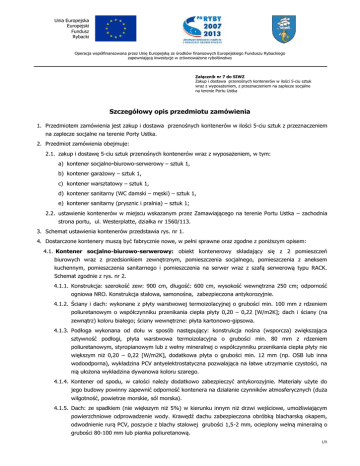 Unia Europejska Europejski Fundusz Rybacki Operacja współfinansowana przez Unię Europejską ze środków finansowych Europejskiego Funduszu Rybackiego zapewniającą inwestycje w zrównoważone rybołówstwo Załącznik nr 7 do SIWZ Zakup i dostawa przenośnych kontenerów w ilości 5-ciu sztuk wraz z wyposażeniem, z przeznaczeniem na zaplecze socjalne na terenie Portu Ustka Szczegółowy opis przedmiotu zamówienia 1. Przedmiotem zamówienia jest zakup i dostawa przenośnych kontenerów w ilości 5-ciu sztuk z przeznaczeniem na zaplecze socjalne na terenie Porty Ustka. 2. Przedmiot zamówienia obejmuje: 2.1. zakup i dostawę 5-ciu sztuk przenośnych kontenerów wraz z wyposażeniem, w tym: a) kontener socjalno-biurowo-serwerowy – sztuk 1, b) kontener garażowy – sztuk 1, c) kontener warsztatowy – sztuk 1, d) kontener sanitarny (WC damski – męski) – sztuk 1, e) kontener sanitarny (prysznic i pralnia) – sztuk 1; 2.2. ustawienie kontenerów w miejscu wskazanym przez Zamawiającego na terenie Portu Ustka – zachodnia strona portu, ul. Westerplatte, działka nr 1560/113. 3. Schemat ustawienia kontenerów przedstawia rys. nr 1. 4. Dostarczone kontenery muszą być fabrycznie nowe, w pełni sprawne oraz zgodne z poniższym opisem: 4.1. Kontener socjalno-biurowo-serwerowy: obiekt kontenerowy składający się z 2 pomieszczeń biurowych wraz z przedsionkiem zewnętrznym, pomieszczenia socjalnego, pomieszczenia z aneksem kuchennym, pomieszczenia sanitarnego i pomieszczenia na serwer wraz z szafą serwerową typu RACK. Schemat zgodnie z rys. nr 2. 4.1.1. Konstrukcja: szerokość zew: 900 cm, długość: 600 cm, wysokość wewnętrzna 250 cm; odporność ogniowa NRO. Konstrukcja stalowa, samonośna, zabezpieczona antykorozyjnie. 4.1.2. Ściany i dach: wykonane z płyty warstwowej termoizolacyjnej o grubości min. 100 mm z rdzeniem poliuretanowym o współczynniku przenikania ciepła płyty 0,20 – 0,22 [W/m2K]; dach i ściany (na zewnątrz) koloru białego; ściany wewnętrzne: płyta kartonowo-gipsowa. 4.1.3. Podłoga wykonana od dołu w sposób następujący: konstrukcja nośna (wsporcza) zwiększająca sztywność podłogi, płyta warstwowa termoizolacyjna o grubości min. 80 mm z rdzeniem poliuretanowym, styropianowym lub z wełny mineralnej o współczynniku przenikania ciepła płyty nie większym niż 0,20 – 0,22 [W/m2K], dodatkowa płyta o grubości min. 12 mm (np. OSB lub inna wodoodporna), wykładzina PCV antyelektrostatyczna pozwalająca na łatwe utrzymanie czystości, na nią ułożona wykładzina dywanowa koloru szarego. 4.1.4. Kontener od spodu, w całości należy dodatkowo zabezpieczyć antykorozyjnie. Materiały użyte do jego budowy powinny zapewnić odporność kontenera na działanie czynników atmosferycznych (duża wilgotność, powietrze morskie, sól morska). 4.1.5. Dach: ze spadkiem (nie większym niż 5%) w kierunku innym niż drzwi wejściowe, umożliwiającym powierzchniowe odprowadzenie wody. Krawędź dachu zabezpieczona obróbką blacharską okapem, odwodnienie rurą PCV, poszycie z blachy stalowej grubości 1,5-2 mm, ocieplony wełną mineralną o grubości 80-100 mm lub pianka poliuretanową. 1/8 4.1.6. Okna: okna biurowe PCV U 1200 x 1200 mm, sanitarne PCV U 600x600 mm zabezpieczone roletami zewnętrznymi. Okna trzyszybowe. 4.1.7. Drzwi: drzwi zewnętrzne: 90 x 200 cm - stalowe, jednoskrzydłowe ocieplone w kolorze dachu i ścian (na zewnątrz), dwa zamki patentowe z wymiennymi wkładkami bębenkowym; daszek osłonowy (przeciwdeszczowy) nad drzwiami; drzwi mają otwierać się na zewnątrz; drzwi wewnętrzne: jednoskrzydłowe, płycinowe 80 cm x 200 cm. 4.1.8. Klimatyzacja: klimatyzator w pomieszczeniach biurowych i serwerowni, o zmiennej regulowanej mocy sprężarki, wyposażony w układ automatycznej regulacji pozwalający na utrzymanie temperatury wewnątrz kontenera na poziomie 20°C+/+ 5°C, o wydajności chłodzenia min. 2,4 kW. 4.1.9. Ogrzewanie: grzejniki elektryczne o mocy min 2kW i 1kW sterowane odrębną̨ instalacją automatycznej regulacji temperatury z możliwością ustawienia temperatury w zakresie od 5 do 25°C. 4.1.10. Instalacja elektryczna i sieć LAN: instalacja oświetleniowa oraz gniazd wtykowych 220V z bolcem uziemiającym (pomieszczenie biurowe minimum 8 podwójnych gniazd, pomieszczenie socjalne minimum 2 podwójne gniazda, pomieszczenie sanitarne minimum 2 podwójne gniazda, pomieszczenie serwera minimum 3 podwójne gniazda) prowadzona natynkowo w korytkach PCV zgodnie z Polskimi Normami. Oświetlenie jarzeniowe, sieć LAN w każdym pomieszczeniu wraz z gniazdami (pomieszczenie biurowe minimum 6 gniazd, pomieszczenie serwera minimum 2 gniazda, pomieszczenie socjalne minimum 2 gniazda), skrzynki bezpieczników. 4.1.11. Instalacja wodno-kanalizacyjna: natynkowa, instalacja wodna wykonana z rur PP; instalacja kanalizacyjna wykonana z rur PCV. 4.1.12. Wentylacja: grawitacyjna w każdym pomieszczeniu, dodatkowo elektryczna w pomieszczeniu. 4.1.13. Wyposażenie sanitariatu: a) umywalka z elektrycznym podgrzewaczem wody – sztuk 1, b) lustro nietłukące, c) miska ustępowa komplet. 4.1.14. Wyposażenie aneksu kuchennego: a) zlewozmywak jednokomorowy z szafką – sztuk 1, b) elektryczny podgrzewacz wody – sztuk 1. 4.1.15. Wyposażenie pomieszczenia socjalnego: brak. 4.1.16. Wyposażenie pomieszczenia serwerowego: a) szafa typu Rack Serwer 42U o wymiarach 800 x 1000 x 1989 mm, nośność do 1000 kg, dwuskrzydłowe perforowane drzwi z przodu i z tyłu, perforacja 80%, panel wentylacyjny 4wentylatorowy z termostatem, cokół do szafy dystrybucyjnej 800x1000mm wysokość 100mm, listwa zasilająca 19” 8 x 230V z wyłącznikiem i filtrem przeciwzakłóceniowym; b) dodatkowa skrzynka bezpieczników; c) drzwi wewnętrzne zamykane na zamek patentowy. 4.1.17. Wyposażenie pomieszczeń biurowego wraz z przedsionkiem zewnętrznym: brak. 4.1.18. Dokumentacja techniczna, pomiarowa, schematy połączeń́ sanitarnych. 4.2. Kontener 