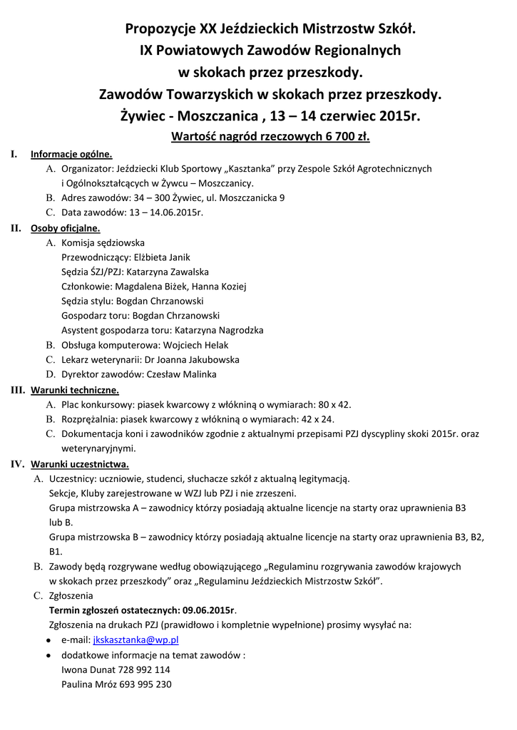 Propozycje XX Jeździeckich Mistrzostw Szkół. IX Powiatowych Zawodów Regionalnych w skokach przez przeszkody. Zawodów Towarzyskich w skokach przez przeszkody. Żywiec - Moszczanica , 13 – 14 czerwiec 2015r. Wartość nagród rzeczowych 6 700 zł. I. Informacje ogólne. A. Organizator: Jeździecki Klub Sportowy „Kasztanka” przy Zespole Szkół Agrotechnicznych i Ogólnokształcących w Żywcu – Moszczanicy. B. Adres zawodów: 34 – 300 Żywiec, ul. Moszczanicka 9 C. Data zawodów: 13 – 14.06.2015r. II. Osoby oficjalne. A. Komisja sędziowska Przewodniczący: Elżbieta Janik Sędzia ŚZJ/PZJ: Katarzyna Zawalska Członkowie: Magdalena Biżek, Hanna Koziej Sędzia stylu: Bogdan Chrzanowski Gospodarz toru: Bogdan Chrzanowski Asystent gospodarza toru: Katarzyna Nagrodzka B. Obsługa komputerowa: Wojciech Helak C. Lekarz weterynarii: Dr Joanna Jakubowska D. Dyrektor zawodów: Czesław Malinka III. Warunki techniczne. A. Plac konkursowy: piasek kwarcowy z włókniną o wymiarach: 80 x 42. B. Rozprężalnia: piasek kwarcowy z włókniną o wymiarach: 42 x 24. C. Dokumentacja koni i zawodników zgodnie z aktualnymi przepisami PZJ dyscypliny skoki 2015r. oraz weterynaryjnymi. IV. Warunki uczestnictwa. A. Uczestnicy: uczniowie, studenci, słuchacze szkół z aktualną legitymacją. Sekcje, Kluby zarejestrowane w WZJ lub PZJ i nie zrzeszeni. Grupa mistrzowska A – zawodnicy którzy posiadają aktualne licencje na starty oraz uprawnienia B3 lub B. Grupa mistrzowska B – zawodnicy którzy posiadają aktualne licencje na starty oraz uprawnienia B3, B2, B1. B. Zawody będą rozgrywane według obowiązującego „Regulaminu rozgrywania zawodów krajowych w skokach przez przeszkody” oraz „Regulaminu Jeździeckich Mistrzostw Szkół”. C. Zgłoszenia Termin zgłoszeń ostatecznych: 09.06.2015r. Zgłoszenia na drukach PZJ (prawidłowo i kompletnie wypełnione) prosimy wysyłać na: e-mail: [email protected] dodatkowe informacje na temat zawodów : Iwona Dunat 728 992 114 Paulina Mróz 693 995 230 D. Warunki finansowe. Opłata organizacyjna: 60 zł dzień, 100 zł całe zawody. Z opłaty organizacyjnej zwolnieni są uczestnicy konkursów mistrzowskich. Opłata na fundusz nagród ŚZJ: 5 zł od konia. Opłata za boksy: 200 zł za zawody opłatę należy uiścić do 2.06.2015r. na konto 36 8137 0009 0008 2208 2000 0010 z dopiskiem opłata za boks. Dowód wpłaty przesłać e-mailem wraz ze zgłoszeniem. Podłączenie przyczepy do prądu 50 zł całe zawody. Miejsce dla koni będzie przygotowane od 12.06.2015r. od godz. 1400, należy zabrać pojemnik na wodę i paszę. Organizator zapewnia ściółkę (słoma, trociny) na pierwsze ścielenie. Możliwość kupienia siana i słomy po 10 zł za kostkę. Ze względu technicznych parkur będzie otwarty do godziny 20 00 . Noclegi w internacie ZSAiO: pokoje 2 – osobowe 25 zł od osoby/doba pokoje 3 – osobowe 20 zł od osoby/doba Liczba miejsc jest ograniczona. Wraz ze zgłoszeniami należy przesyłać zamówienia na noclegi. Internat otwarty od piątku od godz.17 00 E. F. G. H. I. J. *HOTELE : Dwór Rychwałd, ul. Spacerowa 13, Rychwałd tel : 33 865 10 07 Hotel Dębina, ul. Kopernika 2, Żywiec tel : 33 861 48 88 Zajazd Maxim, al. Piłsudskiego 20, Żywiec tel: 33 860 55 62 Dostarczenie dokumentów do Komisji Sędziowskiej przed konkursami od godziny 800 . Nagrody: według tabeli umieszczonej pod programem zawodów. Organizator nie ponosi odpowiedzialności za wypadki i inne szkody mogące mieć miejsce podczas zawodów i transportu. Dokonanie zmiany w zapisach (po wywieszeniu list startowych) za zgodą sędziego głównego – 10 zł od każdego przepisanego lub dopisanego konia czy zawodnika. Konie powyżej szóstego roku życia mają prawo w konkursach do L1 do trzech startów w sobotę, dotyczy to również koni mistrzowskich. Organizator zastrzega sobie prawo do zmian programu z zachowaniem klas konkursów i ograniczenia startu w niedzielę do jednego przy zbyt dużej ilości zgłoszeń. W konkursach towarzyskich dla Amatorów i „Mój pierwszy raz” zawodnicy muszą posiadać zgodę lekarza na udział w zawodach konnych oraz w przypadku osób do 18 lat zgodę opiekunów prawnych. Konie powinny posiadać dokument identyfikacyjny (paszport) oraz aktualne szczepienia przeciw grypie. V. Zagadnienia weterynaryjne Szczepienia ochronne przeciwko grypie koni. Obowiązuje następujący schemat szczepień: A. szczepienia podstawowe : - pierwsze szczepienie – w dniu rozpoczęcia szczepień. - drugie szczepienie- nie wcześniej niż 21-go dnia i nie później niż 92 dnia od pierwszego szczepienia B. szczepienie przypominające: -co 6 miesięcy od ostatniego szczepienia (jest dopuszczalny 21 dniowy okres karencji). Żadne szczepienie przypominające nie może się odbyć później niż na 7 dni przed przybyciem na zawody. PROGRAM ZAWODÓW Sobota 13.06.2015r. Rozpoczęcie konkursów godz. 900 Konkursy Mistrzowskie: Konkurs nr 1A Klasy L Konkurs nr 2A Klasy P Konkurs nr 1B Klasy L Konkurs nr 2B Klasy P z oceną stylu jeźdźca – I półfinał – grupa mistrzowska A MSz zwykły – I półfinał – grupa mistrzowska B MSz z oceną stylu jeźdźca – II półfinał – grupa mistrzowska A MSz dokładności – II półfinał – grupa mistrzowska B MSz Rozpoczęcie konkursów godz. 1200 Konkursy otwarte: Konkurs nr 3 do 60 cm konkurs „Mój pierwszy raz” – towarzyski amatorzy Konkurs nr 4 Klasy LL dokładności – art. 238.1.1 – towarzyski amatorzy Konkurs nr 5 Klasy LL dokładności – art. 238.1.1 – zawodnicy Konkurs nr 6 Klasy L seria A egzaminacyjny – art. 6. seria B dokładności – art. 245.3 Konkurs nr 7 Klasy P konkurs eliminacji – art. 272.11 „Jubileusz 70-lecia Szkoły”. Konkurs nr 8 Klasy N zwykły – art. 238.2.1 Niedziela 14.06.2015r. Rozpoczęcie konkursów godz. 900 Konkursy otwarte: Konkurs nr 9 do 60 cm konkurs z trafieniem w normę czasu – towarzyski amatorzy Konkurs nr 10 Klasy LL Seria A dokładności