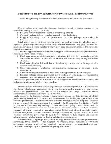 Podstawowe zasady konstrukcyjne większych lokomotywowni Wykład wygłoszony w centrum wiedzy o kolejnictwie dnia 10 marca 1870 roku Przy projektowaniu i budowie większych lokomotywowni i wyborze podstawowych warunków, należy wziąć pod rozwagę: 1) Będący do dyspozycji teren i warunki eksploatacji obiektu 2) Celowość wyboru jednego z podstawowych typów budynków 3) Przyjęcie wybranego typu w przeliczeniu na koszt jednego stanowiska dla lokomotywy Jeżeli okaże się, że istniejąca działka nadaje się pod wybrany typ obiektu, należy wybrać odpowiednią konstrukcję, wiążąc z nią całkowite koszty budowy, przy czym nie bez znaczenia związane z formą są zalety i wady, które przy założonych kosztach trzeba bardzo dokładnie rozpoznać. Zarys istniejących obecnie podstawowych typów konstrukcji większych parowozowni, które mają obecnie zastosowanie. 1) Zamknięty okrąg, względnie zamknięty wielobok, którego cała powierzchnia będzie całkowicie zadaszona z punktem w środku, na którym znajdzie się zadaszona obrotnica 2) Zamknięty pierścień lub wielokąt z niezadaszonym miejscem, na którego środku umieszczono obrotnicę 3) Część pierścienia o większym lub mniejszym promieniu z obrotnicą poza budynkiem 4) Czworoboczne pomieszczenie z niezależną rampą przesuwną na dłuższej osi. 5) Różnego rodzaju odcinki pierścienia lub prostokąta w kombinacji, które najczęściej powstają przy powiększaniu istniejących lokomotywowni. Rozwiązania przedstawione w punktach 4 i 5 ze względu na niecelowość stosowania, nie będą przedmiotem rozważań w tym wykładzie. Parowozownie w formie zamkniętego okręgu lub wielokąta (rys. 1 i 2). Największe dotychczas zbudowane parowozownie w ich formach podstawowych, z wewnętrzną średnicą nie przekraczającą 160`, nie da się rozbudować bez dużych nakładów, celem uzyskania większej ilości stanowisk dla lokomotyw. Liczba stanowisk dla lokomotyw, które w parowozowni winny powstać, nie może utrudniać podstawowej działalności i komunikacji wewnętrznej; ich liczba jest ograniczona i nie powinna przekraczać 19 a jedno stanowisko powinno być ciągle wolne dla wjazdu i wyjazdu a wiec co najwyżej, jednocześnie może być zajętych tylko 18 stanowisk. Jeżeli także w Anglii przy uprzednio wymienionej średnicy z 23 stanowiskami i jednym wyjazdem a więc 24 stanowiskami są rozbudowane, nie jest to godne zalecania, ponieważ w tym wypadku maszyny od strony czołowej są ustawione bardzo blisko obok siebie i przejście między dwiema maszynami z trudem umożliwia obsługę rewizyjną, szczególnie dlatego, że w tym obszarze utrudniony jest dostęp do cylindrów a ponadto w tym miejscu umieszczone żelazne podpory dachu, jeszcze bardziej zawężają miejsce obsługowe. Parowozownie o tego typu mają zaletę, że mają największe możliwości przestrzenne, zapewniają łatwą kontrolę i bez względu na pogodę, mogą korzystać z obrotnicy; czyszczenie maszyn a szczególnie płomienic, można zawsze bez przeszkód wykonać. Zabudowa terenu jest ograniczona do niezbędnego minimum. Jeżeli zalety omawianej formy podstawowej są bardzo istotne, nie mniej ważne są też wady. Jak wynika z przekroju rys. 2 ,wysokie wymagania stawiane są takiej parowozowni w zakresie wysokości przestrzeni wolnej, przez co ogrzewanie w okresie zimowym jest prawie niemożliwe, co jako niedogodność w naszym, północnym klimacie, musi być brane pod uwagę. ta parowozownie pomimo dużej ilości światła, które dostaje się przez kopułę, nie zapewnia jego odpowiedniej ilości, szczególnie na stanowisku głównym, gdzie dobre naświetlenie jest szczególnie ważne, ponieważ źródło światła jest za bardzo oddalone od maszyn. Z tego względu wielką niedogodnością a nawet niemożliwością jest powiększanie liczby stanowisk dla lokomotyw Omówione w punktach 2 i 3 typy podstawowe mają te same zalety i wady i rozważania nad nimi mogą być traktowane jednakowo. Parowozownie o okrągłej formie podstawowej. Te formy podstawowe, które bardzo rozpowszechniły się w ostatnich czasach powiązane są z większymi wadami aniżeli wcześniej omówione, zamkniętym kręgu, są mimo to preferowane, ponieważ ich powiększenie lub zwiększenie liczby stanowisk dla lokomotyw jest łatwe do osiągnięcia bez wyłączenia ich z eksploatacji poszczególnych elementów i stanowisk. Przegląd i łatwa kontrola, niestety nie jest zaletą dla tego typu form podstawowych. Przy promieniowych stanowiskach maszyn niemożliwy jest przegląd więcej niż 3 do 4 maszyn. Oświetlenie jest wprawdzie dostateczne dla tendra, ale nie dla maszyny, ponieważ światło na wewnętrzną stronę pierścienia pada tylko przez małe, umieszczone w bramach okna. Jeżeli trzeba pracować przy maszynie lub muszą być czyszczone płomienice, istnieje potrzeba każdorazowego otwieranie odpowiednich bram, by w pomieszczeniu uzyskać wystarczające oświetlenie, przez co w zimie ogrzewanie pomieszczenia jest bardzo utrudnione. Wielką przeszkodą w ogrzewaniu takiej przestrzeni jest duża ilość bram, których szczelne zamykanie przy ich wysokości jest nie do osiągnięcia w zimie, mimo umocowania na nich mat słomianych. Koszty, które w ciągu roku powstają w wyniku uszkodzeń bram są nie do pominięcia. Nie można tez pominąć powierzchni zajmowanej przez tory i obrotnicę. Aby ograniczyć powierzchnię użytkową, jak i powierzchnię zabudowy, pomiędzy poszczególnymi bramami zastosowano podpory żeliwne i łuki bramowe pomiędzy podporami. Jeżeli parowozownia zbudowana jest na dużym promieniu, zagadnienie to nie ma większego znaczenia, ale przy małym promieniu, muszą być podpory przesunięte do wewnątrz i tu pojawiają się trudności; zamiast zaokrąglonych łuków bramowych, trzeba zastosować nadproża z żelaza, które dla stabilności konstrukcji połączone są z podporami Przy zastosowaniu żelaznych podpór i ograniczony