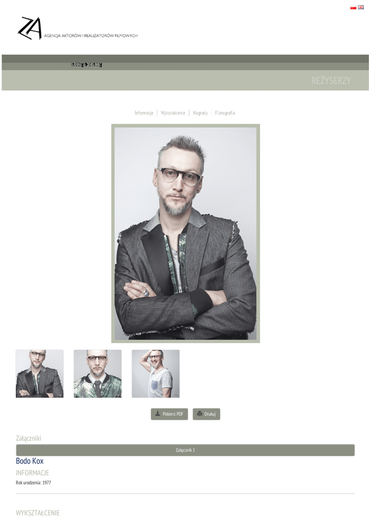 REŻYSERZY REŻYSERZY Pobierz PDF Załączniki Załącznik 1 Bodo Kox INFORMACJE Rok urodzenia: 1977 WYKSZTAŁCENIE Drukuj Filologia polska (specjalność: dziennikarstwo) na Wydziale Filologicznym Uniwersytetu Wrocławskiego NAGRODY 2015 Wyróżnienie w konkursie ScriptTeast za scenariusz ""Człowiek z magicznym pudełkiem"; nagroda wręczona podczas Festiwalu Filmowego w Cannes 2014 Orzeł (Polska Nagroda Filmowa) DZIEWCZYNA Z SZAFY Nagroda w kategorii: Odkrycie roku 2014 Rzym (Niezależny Festiwal Filmowy) DZIEWCZYNA Z SZAFY Nagroda dla najlepszego zagranicznego filmu pełnometrażowego 2014 Budapeszt (Międzynarodowy Festiwal Filmu i Muzyki "Mediawave")v Nagroda dla najlepszego filmu fabularnego 2007 Łódź (Festiwal Kina Niezależnego "OFF jak gorąco") NIE PANIKUJ Nagroda w kategorii: Najlepszy film niezależny 2005 Gdynia (do 1986 Gdańsk) (Festiwal Polskich Filmów Fabularnych; od roku 2012 Gdynia Film Festival) HOMO FATHER Nagroda Jury (w konkursie kina niezależnego) FILMOGRAFIA 2016 CZŁOWIEK Z MAGICZNYM PUDEŁKIEM, Film w produkcji, Scenariusz, Reżyseria 2015 AMAZONIA Spektakl telewizyjny Reżyseria 2013 2XL Serial fabularny Reżyseria 2013 OPERA Z MYDŁA Etiuda szkolna Scenariusz, Reżyseria 2012 DZIEWCZYNA Z SZAFY Film fabularny Scenariusz, Reżyseria 2011 KSIĘŻYCOWA RZEKA Etiuda szkolna Scenariusz, Reżyseria 2011 RURA Etiuda szkolna Scenariusz, Reżyseria 2007 NIE PANIKUJ Film fabularny Scenariusz, Reżyseria, Producent 2005 MARCO P. I ZŁODZIEJE ROWERÓW Film fabularny Scenariusz, Reżyseria, Producent 2005 SOBOWTÓR Film fabularny Scenariusz, Reżyseria, Kierownictwo produkcji, Montaż, Producent, Dźwięk Producent, Dźwięk © 2008-2017 „ZA” agencja aktorów i realizatorów filmowych. Wszelkie prawa zastrzeżone. Realizacja Agencja reklamowa 4 ALL