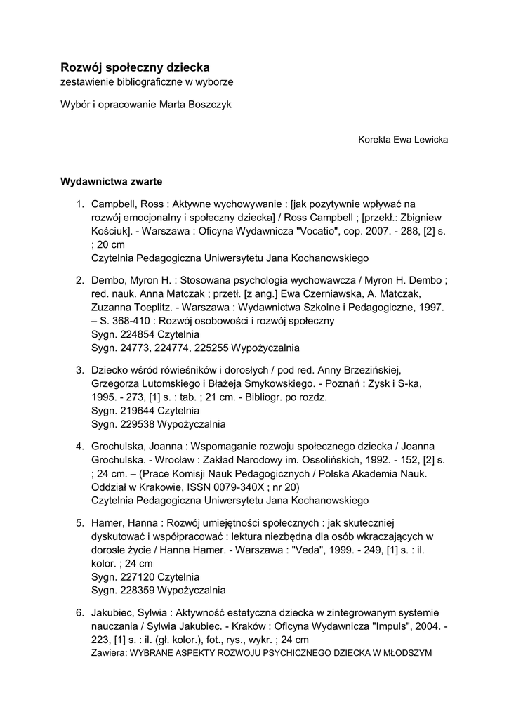Rozwój społeczny dziecka zestawienie bibliograficzne w wyborze Wybór i opracowanie Marta Boszczyk Korekta Ewa Lewicka Wydawnictwa zwarte 1. Campbell, Ross : Aktywne wychowywanie : [jak pozytywnie wpływać na rozwój emocjonalny i społeczny dziecka] / Ross Campbell ; [przekł.: Zbigniew Kościuk]. - Warszawa : Oficyna Wydawnicza "Vocatio", cop. 2007. - 288, [2] s. ; 20 cm Czytelnia Pedagogiczna Uniwersytetu Jana Kochanowskiego 2. Dembo, Myron H. : Stosowana psychologia wychowawcza / Myron H. Dembo ; red. nauk. Anna Matczak ; przetł. [z ang.] Ewa Czerniawska, A. Matczak, Zuzanna Toeplitz. - Warszawa : Wydawnictwa Szkolne i Pedagogiczne, 1997. – S. 368-410 : Rozwój osobowości i rozwój społeczny Sygn. 224854 Czytelnia Sygn. 24773, 224774, 225255 Wypożyczalnia 3. Dziecko wśród rówieśników i dorosłych / pod red. Anny Brzezińskiej, Grzegorza Lutomskiego i Błażeja Smykowskiego. - Poznań : Zysk i S-ka, 1995. - 273, [1] s. : tab. ; 21 cm. - Bibliogr. po rozdz. Sygn. 219644 Czytelnia Sygn. 229538 Wypożyczalnia 4. Grochulska, Joanna : Wspomaganie rozwoju społecznego dziecka / Joanna Grochulska. - Wrocław : Zakład Narodowy im. Ossolińskich, 1992. - 152, [2] s. ; 24 cm. – (Prace Komisji Nauk Pedagogicznych / Polska Akademia Nauk. Oddział w Krakowie, ISSN 0079-340X ; nr 20) Czytelnia Pedagogiczna Uniwersytetu Jana Kochanowskiego 5. Hamer, Hanna : Rozwój umiejętności społecznych : jak skuteczniej dyskutować i współpracować : lektura niezbędna dla osób wkraczających w dorosłe życie / Hanna Hamer. - Warszawa : "Veda", 1999. - 249, [1] s. : il. kolor. ; 24 cm Sygn. 227120 Czytelnia Sygn. 228359 Wypożyczalnia 6. Jakubiec, Sylwia : Aktywność estetyczna dziecka w zintegrowanym systemie nauczania / Sylwia Jakubiec. - Kraków : Oficyna Wydawnicza "Impuls", 2004. 223, [1] s. : il. (gł. kolor.), fot., rys., wykr. ; 24 cm Zawiera: WYBRANE ASPEKTY ROZWOJU PSYCHICZNEGO DZIECKA W MŁODSZYM WIEKU SZKOLNYM: Pojęcie rozwoju psychicznego (podstawowe czynniki rozwoju, aktywność jako główny wyznacznik rozwoju), Rozwój twórczy (znaczenie pojęcia twórczość, cechy myślenia twórczego, czynniki i metody rozwijania wyobraźni, istota twórczości dziecięcej), Aktywność twórcza dziecka (ekspresja jako przejaw aktywności twórczej, warunki sprzyjające rozwijaniu aktywności twórczej), Rozwój estetyczny (rozwijanie wrażliwości estetycznej, wzbogacanie zasobu pojęć estetycznych), Rozwój społeczny w zakresie funkcjonowania w zespole. Sygn. 238724 Czytelnia Sygn. 249010, 249091 Wypożyczalnia 7. Janowski, Andrzej : Prestiż ucznia wśród rówieśników / Andrzej Janowski, Roman Stachyra. - Warszawa : Wydawnictwa Szkolne i Pedagogiczne, 1985. - 189, [3] s. : rys. ; 23 cm. - Bibliogr. s. 188-[190] Sygn. 180073 Czytelnia Sygn . 180074, 180075, 180076, 180077, 180078 Wypożyczalnia 8. Jelonek, Adam W. : Koncepcje rozwoju społecznego / Adam W. Jelonek, Krzysztof Tyszka. - Warszawa : "Scholar", 2001. - 204 s. : il. ; 24 cm. Bibliogr. s. 189-200 Sygn. 232476 Czytelnia Sygn. 232942, 232943 Wypożyczalnia 9. Kopik, Aldona : Akceleracja rozwoju dzieci siedmioletnich rozpoczynających naukę szkolną : (na podstawie badań przekrojowych z lat 1972/1973 i 1992/1993) / Aldona Kopik. - Kielce : Wyższa Szkoła Pedagogiczna im. Jana Kochanowskiego, 1996. – S. 74-93 : Poziom rozwoju społecznego badanych dzieci ; S. 108-109 : Rozwój społeczny Sygn. 221231 Czytelnia Sygn. 222166, 235719 Wypożyczalnia 10. Kowalik, Stanisław : Rozwój społeczny // W: Psychologia rozwoju człowieka. T. 3, Rozwój funkcji psychicznych / red. nauk. Barbara Harwas-Napierała i Janusz Trempała. - Warszawa : Wydawnictwo Naukowe PWN, 2002. - S. 71105 Sygn. 235253 Czytelnia Sygn. 235254, 235255, 235256, 235257 Wypożyczalnia 11. Matczak, Anna : Zarys psychologii rozwoju : podręcznik dla nauczycieli / Anna Matczak. - Warszawa : Wydawnictwo Akademickie "Żak", cop. 2003. – S. 154183 : Rozwój społeczny Sygn. 235974 Czytelnia Sygn. 235975, 235976, 235977, 235978 Wypożyczalnia 12. Przetacznikowa, Maria : Rozwój uczuciowy i społeczny // W: Psychologia rozwojowa dzieci i młodzieży / aut. Zofia Babska [et al.] ; red. Maria Żebrowska. - Wyd. 6 zm. - Warszawa : Państwowe Wydawnictwo Naukowe, 1975. – S. 487-498 Sygn. 116285 Czytelnia Sygn. 116286, 116287, 116288 Wypożyczalnia 13. Psychologia dziecka / Ross Vasta, Marshall M. Haith, Scott A. Miller ; red. nauk. Anna Matczak ; przetł. [z ang.] Małgorzata Babiuch [et al.]. - Warszawa : Wydawnictwa Szkolne i Pedagogiczne, 1995. – S. 441-477 : Rozwój społeczny i osobowości Sygn. 219993 Czytelnia Sygn. 220032, 227112, 227113, 227637, 229677 Wypożyczalnia 14. Rathus, Spencer A. : Psychologia współczesna / Spencer A. Rathus ; przekł. Bogdan Wojciszke. - Gdańsk : Gdańskie Wydawnictwo Psychologiczne, 2004. – S. 166-175 : Rozwój społeczny Sygn. 237868 Czytelnia Sygn. 239070 Wypożyczalnia 15. Seul, Sylwia : Kontekst społeczny w późnym dzieciństwie a rola ucznia / Sylwia Seul. - Kraków : Oficyna Wydawnicza "Impuls", 2009. - 244 s. : il. ; 23 cm. - Bibliogr. s. 217-231 Czytelnia Pedagogiczna Uniwersytetu Jana Kochanowskiego 16. Skipor-Rybacka, Irena : Czy przedszkole przygotowuje dzieci do życia szkolnego ? : (dojrzałość społeczna dzieci siedmioletnich do podjęcia roli ucznia i jej wychowawcze uwarunkowania) / Irena Skipor-Rybacka. - Poznań : Wydawnictwo Naukowe Uniwersytetu im. Adama Mickiewicza, 1991. - 114, [1] s. ; 24 cm. - Bibliogr. s. 104-112 Zawiera: Psychologiczna i pedagogiczna problematyka dojrzałości szkolnej (Przegląd badań nad dojrzałością szkolną, Prognostyczność badań dojrzałości szkolnej) ; Istota dojrzałości społecznej (Dojrzałość a rozwój społeczny dzieci 7-letnich, Analiza przesłanek stanowiących o zakresie pojęcia dojrzałości społecznej do podjęcia roli ucznia) ; Ogólna charakterystyka czynników determinujących dojrzałość społeczną dzieci siedmioletnich ; Metodologiczna