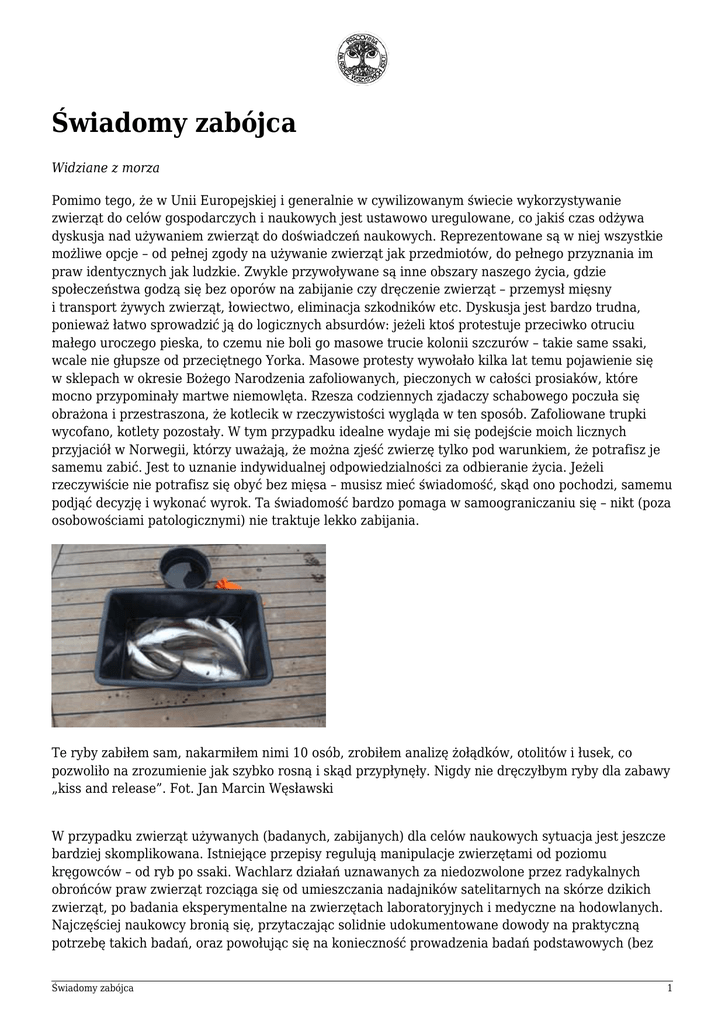 Świadomy zabójca Widziane z morza Pomimo tego, że w Unii Europejskiej i generalnie w cywilizowanym świecie wykorzystywanie zwierząt do celów gospodarczych i naukowych jest ustawowo uregulowane, co jakiś czas odżywa dyskusja nad używaniem zwierząt do doświadczeń naukowych. Reprezentowane są w niej wszystkie możliwe opcje – od pełnej zgody na używanie zwierząt jak przedmiotów, do pełnego przyznania im praw identycznych jak ludzkie. Zwykle przywoływane są inne obszary naszego życia, gdzie społeczeństwa godzą się bez oporów na zabijanie czy dręczenie zwierząt – przemysł mięsny i transport żywych zwierząt, łowiectwo, eliminacja szkodników etc. Dyskusja jest bardzo trudna, ponieważ łatwo sprowadzić ją do logicznych absurdów: jeżeli ktoś protestuje przeciwko otruciu małego uroczego pieska, to czemu nie boli go masowe trucie kolonii szczurów – takie same ssaki, wcale nie głupsze od przeciętnego Yorka. Masowe protesty wywołało kilka lat temu pojawienie się w sklepach w okresie Bożego Narodzenia zafoliowanych, pieczonych w całości prosiaków, które mocno przypominały martwe niemowlęta. Rzesza codziennych zjadaczy schabowego poczuła się obrażona i przestraszona, że kotlecik w rzeczywistości wygląda w ten sposób. Zafoliowane trupki wycofano, kotlety pozostały. W tym przypadku idealne wydaje mi się podejście moich licznych przyjaciół w Norwegii, którzy uważają, że można zjeść zwierzę tylko pod warunkiem, że potrafisz je samemu zabić. Jest to uznanie indywidualnej odpowiedzialności za odbieranie życia. Jeżeli rzeczywiście nie potrafisz się obyć bez mięsa – musisz mieć świadomość, skąd ono pochodzi, samemu podjąć decyzję i wykonać wyrok. Ta świadomość bardzo pomaga w samoograniczaniu się – nikt (poza osobowościami patologicznymi) nie traktuje lekko zabijania. Te ryby zabiłem sam, nakarmiłem nimi 10 osób, zrobiłem analizę żołądków, otolitów i łusek, co pozwoliło na zrozumienie jak szybko rosną i skąd przypłynęły. Nigdy nie dręczyłbym ryby dla zabawy „kiss and release”. Fot. Jan Marcin Węsławski W przypadku zwierząt używanych (badanych, zabijanych) dla celów naukowych sytuacja jest jeszcze bardziej skomplikowana. Istniejące przepisy regulują manipulacje zwierzętami od poziomu kręgowców – od ryb po ssaki. Wachlarz działań uznawanych za niedozwolone przez radykalnych obrońców praw zwierząt rozciąga się od umieszczania nadajników satelitarnych na skórze dzikich zwierząt, po badania eksperymentalne na zwierzętach laboratoryjnych i medyczne na hodowlanych. Najczęściej naukowcy bronią się, przytaczając solidnie udokumentowane dowody na praktyczną potrzebę takich badań, oraz powołując się na konieczność prowadzenia badań podstawowych (bez Świadomy zabójca 1 bezpośredniego praktycznego zastosowania) dla zrozumienia biologicznych procesów wspólnych dla nas i zwierząt. Nie neguję potrzeby badań eksperymentalnych i uznaję wagę wielu doświadczeń ze zwierzętami. W wielu przypadkach porównywanie cierpienia zwierząt do uczuć ludzkich jest nadużywane. Ponadto, nie uważam, że zwierzęta mają „prawa” podobne do ludzkich. Przyznanie praw oznaczałoby, wedle logiki, dzielenie się odpowiedzialnością – i powrót do średniowiecznych procesów zwierząt. Natomiast jestem przekonany, że człowiek nie ma prawa zabijać bez potrzeby. W obronie doświadczeń naukowych ze zwierzętami zapominamy o bardzo ważnym aspekcie – o konieczności naszej świadomej i dojrzałej relacji z innymi istnieniami. O konieczności nieustannej etycznej refleksji i o tym, że wprawdzie „tradycyjne” zabijanie grindwali przez mieszkańców Wysp Owczych nie szkodzi gatunkowi, ale zmiany w mózgu i osobowości człowieka, który ręcznie, w okrutny sposób i regularnie zabija wielkie, rozumne zwierzę, to bardzo poważne wyzwanie społeczne. Nie boję się o grindwale, boję się zawodowych rzeźników, rzezaków i „tradycyjnych łowców” z Danii, którzy znieczulili się na krew i cierpienie. Doświadczenie, które może uratować ludzkie życie – testowanie nowego leku czy sposobu operacji – jest często okrutne, ale uznaję jego konieczność. Nie chciałbym jednak, żeby naukowiec, który je wykonuje, robił to bezrefleksyjnie. Nie chodzi o to, żeby płakać przy każdej żabie przeciętej w laboratorium, ale aby wiedzieć, że to działanie okrutne, bolesne i niszczące nas samych – dla naszego własnego dobra trzeba je ograniczyć do naprawdę najważniejszych przypadków. Prof. Jan Marcin Węsławski Świadomy zabójca 2