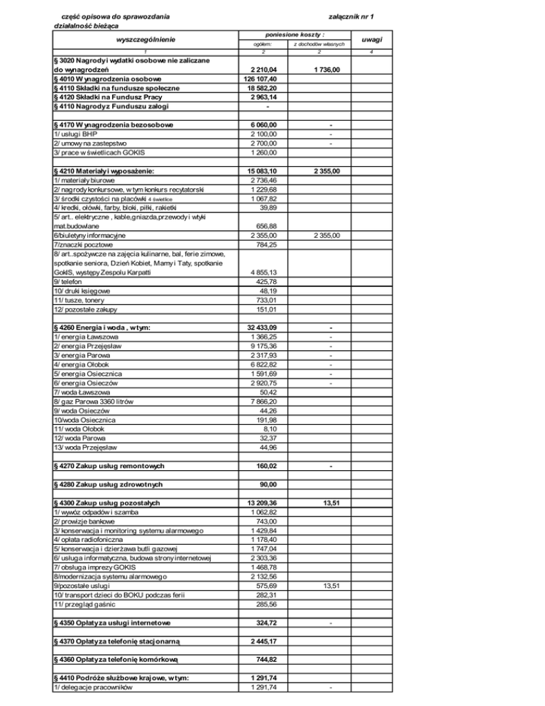 cz opisowa do sprawozdania dzia alno bie ca wyszczególnienie 1 § 3020 Nagrody i wydatki osobowe nie zaliczane do wynagrodze § 4010 W ynagrodzenia osobowe § 4110 Sk adki na fundusze spo eczne § 4120 Sk adki na Fundusz Pracy § 4110 Nagrody z Funduszu za ogi § 4170 W ynagrodzenia bezosobowe 1/ us ugi BHP 2/ umowy na zastepstwo 3/ prace w wietlicach GOKIS za cznik nr 1 poniesione koszty : ogó em: 2 2 210,04 126 107,40 18 582,20 2 963,14 6 060,00 2 100,00 2 700,00 1 260,00 z dochodów w asnych 2 1 736,00 - § 4210 Materia y i wyposa enie: 1/ materia y biurowe 2/ nagrody konkursowe, w tym konkurs recytatorski 3/ rodki czysto ci na placówki 4 wietlice 4/ kredki, o ówki, farby, bloki, pi ki, rakietki 5/ art.. elektryczne , kable,gniazda,przewody i wtyki mat.budowlane 6/biuletyny informacyjne 7/znaczki pocztowe 8/ art..spo ywcze na zaj cia kulinarne, bal, ferie zimowe, spotkanie seniora, Dzie Kobiet, Mamy i Taty, spotkanie GokIS, wyst py Zespolu Karpatti 9/ telefon 10/ druki ksi gowe 11/ tusze, tonery 12/ pozosta e zakupy 15 083,10 2 736,46 1 229,68 1 067,82 39,89 § 4260 Energia i woda , w tym: 1/ energia awszowa 2/ energia Przej aw 3/ energia Parowa 4/ energia O obok 5/ energia Osiecznica 6/ energia Osieczów 7/ woda awszowa 8/ gaz Parowa 3360 litrów 9/ woda Osieczów 10/woda Osiecznica 11/ woda O obok 12/ woda Parowa 13/ woda Przej aw 32 433,09 1 366,25 9 175,36 2 317,93 6 822,82 1 591,69 2 920,75 50,42 7 866,20 44,26 191,98 8,10 32,37 44,96 - § 4270 Zakup us ug remontowych 160,02 - § 4280 Zakup us ug zdrowotnych 90,00 § 4300 Zakup us ug pozosta ych 1/ wywóz odpadów i szamba 2/ prowizje bankowe 3/ konserwacja i monitoring systemu alarmowego 4/ op ata radiofoniczna 5/ konserwacja i dzier awa butli gazowej 6/ us uga informatyczna, budowa strony internetowej 7/ obs uga imprezy GOKIS 8/modernizacja systemu alarmowego 9/pozosta e uslugi 10/ transport dzieci do BOKU podczas ferii 11/ przegl d ga nic § 4350 Op aty za us ugi internetowe 656,88 2 355,00 784,25 2 355,00 4 855,13 425,78 48,19 733,01 151,01 13 209,36 1 062,82 743,00 1 429,84 1 178,40 1 747,04 2 303,36 1 468,78 2 132,56 575,69 282,31 285,56 324,72 § 4370 Op aty za telefoni stacjonarn 2 445,17 § 4360 Op aty za telefoni komórkow 744,82 § 4410 Podró e s bowe krajowe, w tym: 1/ delegacje pracowników 2 355,00 1 291,74 1 291,74 13,51 13,51 - - uwagi 4 § 4430 Ró ne op aty i sk adki, w tym: 1/ sk adki ZAiKS - rycza towe( 116,-miesi cznie) 2/ ubezpieczenie mienia 3/ pozosta e op aty 2 815,00 696,00 1 916,00 203,00 - § 4440 Odpisy na Zak adowy Fundusz wiadcze Socjalny 7 312,79 - § 4530 Podatek od towarów i us ug 0,90 § 4480 Podatek od nieruchomo ci 13 213,50 § 4700 Szkolenia pracowników 6 360,00 § 4740 Zakup materia ów papierniczych 1 131,53 § 4750 Zakup akcesoriów komputerowych 335,50 Suma poniesionych kosztów: 252 874,02 Warto - 4 104,51 zrealizowanych zamówie na w/w materia y i us ugi nie przekroczy a 14 000,00 EUR - ustawa Prawo zamówie publicznych nie ma zastosowania sporz dzi a: M.Kaziów Osiecznica 16.07.2009 Zatwierdzi :………………………… za cznik nr 2 Poniesione koszty na organizacj imprez dodatkowych poniesione koszty WYSZCZEGÓLNIENIE ogó em I. Majówka * nagrody na konkursy §4210 * art..spo ywcze i przemys owe §4210 * zabezpieczenie festynu, zawody sprawno ciowe §4300 *koszenie, wa owanie, transport §4300 *ZAIKS §4430 *obs uga muzyczna i techniczna §4170 4 924,53 253,50 488,45 1 117,12 1 163,46 500,00 1 402,00 II/ Imprezy na DZIE DZIECKA 2 497,96 Uwagi z dochodów w asnych 4 924,53 1 600,00 imprezy organizowano w poszczególnych wietlicach *art..spo ywcze §4210 *obs uga muzyczna i techniczna §4170 *transport §4300 IV/ Dni Gminy Osiecznica * wyst p tancerzy ognia §4170 *nagrody §4210 * art..spo ywcze * folia, materia y do konkursów ,art..przem * obs uga muzyczna §4210 §4210 §4170 OGÓ EM KOSZTY IMPREZ DODATKOW YCH: w tym : 297,96 600,00 1 600,00 1 600,00 3 021,24 - 389,92 431,32 2 200,00 10 443,73 § 4210 § 4170 § 4430 § 4300 6 524,53 1 861,15 4 202,00 500,00 3 880,58 Warto zrealizowanych zamówie na w/w materia y i us ugi nie przekroczy a 14 000,00 Eur. -ustawa Prawo zamówie publicznych nie ma zastosowania. Osiecznica , 16.07.2009 r. sporz dzi a: M.Kaziów Zatwierdzi : ....................................