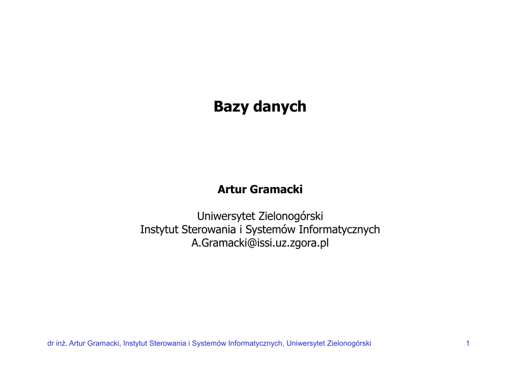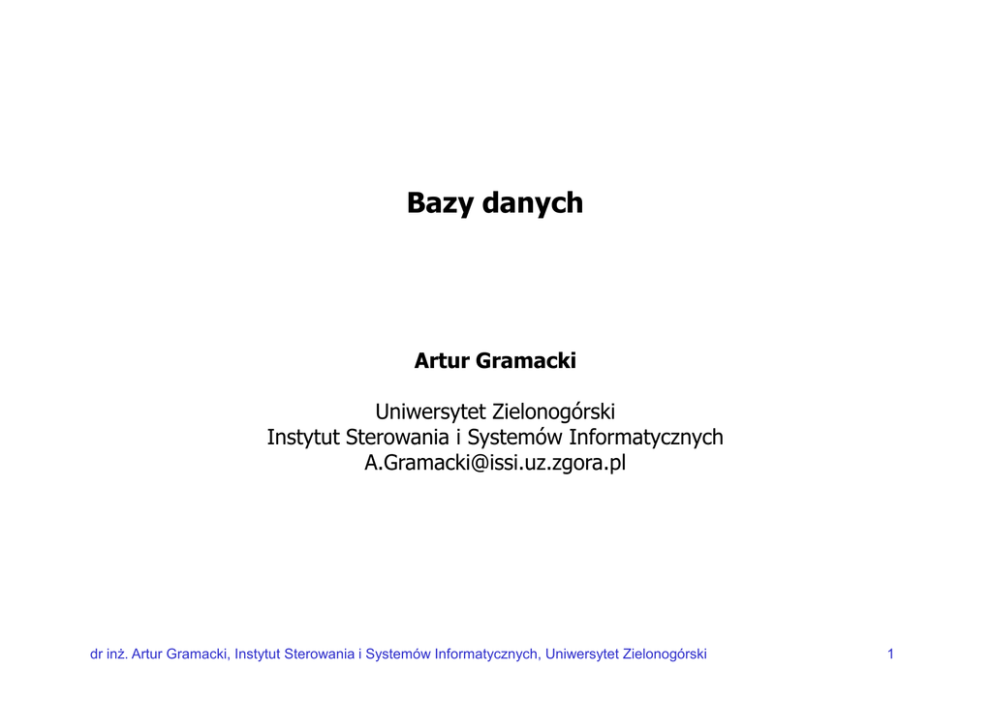 Bazy danych Artur Gramacki Uniwersytet Zielonogórski Instytut Sterowania i Systemów Informatycznych [email protected] dr inż. Artur Gramacki, Instytut Sterowania i Systemów Informatycznych, Uniwersytet Zielonogórski 1 Plan wykładów • Cel kursu • Czym są i do czego służą bazy danych • System zarządzania bazą danych (SZBD) • Projektowanie systemów informatycznych • Modelowanie pojęciowe: model związków encji • Pojęcie relacji oraz podstawowe operacje na relacjach • Związki między relacjami (1:1, 1:N, N:M), klucze główne i klucze obce, inne tzw. ograniczenia (ang. constraints) bazodanowe • Normalizacja relacji • Transakcje bazodanowe • Optymalizacja działania bazy danych dr inż. Artur Gramacki, Instytut Sterowania i Systemów Informatycznych, Uniwersytet Zielonogórski 2 Plan laboratoriów • Plan może ulegać zmianom, różne elementy mogą być realizowane w różnym „nasileniu” • http://www.uz.zgora.pl/~agramack/ dr inż. Artur Gramacki, Instytut Sterowania i Systemów Informatycznych, Uniwersytet Zielonogórski 3 Cel kursu dr inż. Artur Gramacki, Instytut Sterowania i Systemów Informatycznych, Uniwersytet Zielonogórski 4 Cel kursu • Podać niezbędne wiadomości teoretyczne na temat relacyjnych baz danych • Nauczyć projektować poprawne struktury relacyjne • Nauczyć podstaw pracy oraz podstaw administrowania wybranym systemem bazodanowym (np. Oracle, MySQL) • Nauczyć efektywnej pracy z językiem SQL • Nauczyć tworzenia aplikacji bazodanowych, w szczególności interenetowych (języki PHP, JAVA, wzorce projektowe, MVC - Model-View-Controller, inne) dr inż. Artur Gramacki, Instytut Sterowania i Systemów Informatycznych, Uniwersytet Zielonogórski 5 Literatura Teoria relacyjnych baz danych • C. J. Date: Wprowadzenie do systemów baz danych, Wydawnictwa Naukowo-Techniczne, 2000 • C. J. Date: SQL: omówienie standardu języka, Wydawnictwa Naukowo-Techniczne, 2000 MySQL • Luke Welling, Laura Thomson: MySQL. Podstawy, Wydawnictwo HELION, 2005 • Richard Stones, Neil Matthew: Bazy danych i MySQL. Od podstaw, Helion 2003 pozycja łatwiejsza pozycja trudniejsza • Paul Dubios: MySQL. Podręcznik administratora, Wydawnictwo HELION, 2005 • MySQL AB: MySQL 5.0 Reference Manual, (jest to najbardziej aktualne opracowanie na temat bazy MySQL stworzone i na bieżąco aktualizowane przez jej twórców. Książka dostępna w wersji elektronicznej pod adresem http://dev.mysql.com/doc/) • Lech Banachowski (tłum.): SQL. Język relacyjnych baz danych, WNT Warszawa, 1995 dr inż. Artur Gramacki, Instytut Sterowania i Systemów Informatycznych, Uniwersytet Zielonogórski 6 Czym są i do czego służą bazy danych dr inż. Artur Gramacki, Instytut Sterowania i Systemów Informatycznych, Uniwersytet Zielonogórski 7 Czym są i do czego służą bazy danych • Potrzeba gromadzenia i PRZETWARZANIA coraz większych ilości danych • Informacje gromadzone w bazach danych są bardzo cenne • Informacje gromadzone w bazach danych pomagają zarządzać przedsiębiorstwem (firmą, biznesem) • Informacje gromadzone w bazach danych pomagają promować firmę • Informacje zgromadzone i nie wykorzystywane są bezwartościowe • Wolny i zawodny dostęp do danych jest często gorszy niż brak jakiejkolwiek bazy danych • Oracle, DB2, SQL Server, Sybase, MySQL, PostgreSQL, Access, Delphi oraz sporo innych mniej popularnych, czy wręcz niszowych dr inż. Artur Gramacki, Instytut Sterowania i Systemów Informatycznych, Uniwersytet Zielonogórski 8 System zarządzania bazami danych (SZBD) dr inż. Artur Gramacki, Instytut Sterowania i Systemów Informatycznych, Uniwersytet Zielonogórski 9 Definicje, podstawowe informacje • system zarządzania bazą danych SZBD (ang. DBMS -Database Management System) - oprogramowanie umożliwiające tworzenie oraz eksploatację bazy danych oraz jej użytkowników (np. ORACLE, MySQL) • baza danych - spójny zbiór danych posiadających określone znaczenie (inaczej jest to informatyczne odwzorowanie fragmentu świata rzeczywistego • baza danych = dane + schemat bazy danych (najczęściej relacyjny) • system bazy danych = baza danych + system zarządzania bazą danych • podstawowe funkcje SZBD to: • łatwe odpytywanie bazy danych • optymalizacja zapytań • zapewnienie integralności danych system bazy danych system zarządzania bazą danych • zapewnienie wielodostępu do danych • odporność na awarie • ochrona i poufność danych baza danych dane schemat dr inż. Artur Gramacki, Instytut Sterowania i Systemów Informatycznych, Uniwersytet Zielonogórski 10 Własności systemu bazy danych • niezależność aplikacji i danych Dane mogą być wprowadzane do bazy bez konieczności modyfikacji korzystających z nich programów czy systemów użytkowych, a z drugiej strony aplikacje mogą być modyfikowane niezależnie od stanu baz danych • abstrakcyjna reprezentacja danych Programy i systemy użytkowe (aplikacje) są tworzone przy użyciu tzw. deklaratywnych języków programowania (w odróżnieniu od języków imperatywnych). Twórca aplikacji nie musi np. interesować się kolejnością danych w bazie, ani sposobem ich reprezentacji i wyszukiwania. Precyzuje jedynie warunki selekcji informacji. Inaczej mówiąc: decyduje „co zrobić”, a nie „jak zrobić” • różnorodność sposobów widzenia danych Te same dane zawarte w bazie mogą być „widziane” w różny sposób przez różnych użytkowników. Efekt ten uzyskuje się przez stosowanie różnych „filtrów” (perspektyw) nakładanych na te same dane • fizyczna i logiczna niezależność danych Fizyczna niezależność danych polega na tym, że rozszerzenie systemu komputerowego, na którym pracuje SZBD o nowy sprzęt nie narusza danych w bazie. Logiczna niezależność danych polega na tym, że - po pierwsze wprowadzanie nowych danych do bazy nie deaktualizuje starych, po drugie - dane, które nie są wzajemnie pow