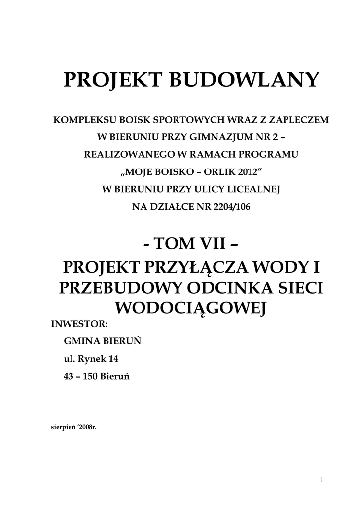 PROJEKT BUDOWLANY KOMPLEKSU BOISK SPORTOWYCH WRAZ Z ZAPLECZEM W BIERUNIU PRZY GIMNAZJUM NR 2 – REALIZOWANEGO W RAMACH PROGRAMU „MOJE BOISKO – ORLIK 2012” W BIERUNIU PRZY ULICY LICEALNEJ NA DZIAŁCE NR 2204/106 - TOM VII – PROJEKT PRZYŁĄCZA WODY I PRZEBUDOWY ODCINKA SIECI WODOCIĄGOWEJ INWESTOR: GMINA BIERUŃ ul. Rynek 14 43 – 150 Bieruń sierpień ‘2008r. 1 Spis treści: 1. Zakres opracowania 2. Podstawa opracowania 3. Bilans zapotrzebowania wody 4. Przyłącze wody 5. Węzeł wodomierzowy 6. Odprowadzenie ścieków sanitarnych 7. Przebudowa sieci wodociągowej 8. Uwagi końcowe 9. Plan BIOS 10. Zestawienie podstawowych materiałów Spis rysunków: W-01. Orientacja W-02. Projekt zagospodarowania działki W-03. Rzut przyziemia – przyłącze wody W-04. Profil przyłącza wody W-05. Schemat węzła wodomierzowego W-06. Szczegół ułoŜenia w gruncie rur PE W-07. Profil przebudowy wodociągu φ 200 mm W-08. Schemat montaŜowy przebudowy wodociągu Załączniki: 1. Oświadczenie projektanta 2. Kopie uprawnień projektowych 3. Zaświadczenie o wpisie na listę członków Śląskiej Okregowej Izby InŜynierów Budownictwa 4. Aktualizacja mapy geodezyjnej oraz uzgodnienie lokalizacji kompleksu boisk sportowych wraz z zapleczem w Bieruniu przy ul. Licealnej oraz wydanie warunków przyłączenia – pismo nr TS/BK/B/66/67/12758/4221/08 z dnia 21.07.2008 r. - wydane przez RPWiK Tychy S.A. 43-100 Tychy, ul. Sadowa 4 5. Uzgodnienie lokalizacji projektowanego kompleksu boisk sportowych wraz z budynkiem zaplecza w Bieruniu przy ul. Licealnej, dz. 2204/106 – pismo nr K-10/1740/432-471/08 z dnia 15.07.2008 r. - wydane przez: Górnośląski Operator Systemu Dystrybucyjnego Sp. z o.o. Oddział Zakład Gazowniczy w Zabrzu ul. Szczęść BoŜe 11, 41-800 Zabrze 6. Pismo Dyrektora Okręgowego Urzędu Górniczego w Katowicach – nr KAT/5141/1283/08/Kw z dnia 18.07.2008 r. 7. Aktualizacja mapy wraz z uzgodnieniem lokalizacji boisk sportowych z zapleczem przy ul. Licealnej w Bieruniu – pismo nr STTSRECU/AP.215-1095/08 z dnia 08.07.2008 r. wydane przez: Telekomunikacja Polska Pion Technicznej Obsługi Klienta Region Południowy Technicznej Obsługi Klienta ul. Ordona13, 40-163 Katowice 8. Naniesienie uzbrojenia terenu i uzgodnienie lokalizacji kompleksu boisk sportowych wraz z zapleczem przy ul. Licealnej działka nr 2204/106 w Bieruniu – pismo nr MDT/DML/3587/2008 z dnia 10.07.2008 r. - wydane przez: VATTENFALL DISTRIBUTION POLAND S.A. 44-100 Gliwice, ul. Portowa 14a 9. Mapa do celów projektowych – sekcja 531.423.194,203 KERG 711/112/2008 10. Orientacja, mapa zasadnicza i wypis z rejestru gruntów z dnia 11.06.2008 r. 11. Wypis z rejestru gruntów z dnia 05.08.2008 r. 2 OPIS TECHNICZNY 1. Zakres opracowania Przedmiotem opracowania jest projekt techniczny przyłącza wody i przebudowy odcinka sieci wodociągowej stalowej φ 200 mm w rejonie projektowanej budowy kompleksu boisk sportowych z zapleczem, przy ul. Licealnej w Bieruniu – działka nr 2204/106. 2. Podstawa opracowania − Mapa sytuacyjna w skali 1: 500, − Aktualizacja mapy geodezyjnej oraz uzgodnienie lokalizacji kompleksu boisk sportowych wraz z zapleczem w Bieruniu przy ul. Licealnej oraz wydanie warunków przyłączenia – pismo nr TS/BK/B/66/67/12758/4221/08 z dnia 21.07.2008 r. - wydane przez RPWiK Tychy S.A. 43-100 Tychy, ul. Sadowa 4 − Aktualnie obowiązujące normy i przepisy dotyczące projektowania i wykonywania przyłączy i sieci wodociągowej. 3. Bilans zapotrzebowania wody dla budynku zaplecza Cele bytowo-sanitarne: Zapotrzebowanie wody, w oparciu o zainstalowane urządzenia i przybory sanitarne dla budynku oraz zgodnie z planowanym sposobem korzystania z instalacji, przedstawia się następująco: max zuŜycie wody wg liczby osób korzystających w ciągu 1 godz.: 2 natryski po 10 osób * 30 l/osobę 5 umywalek po 10 osób * 10 l/osobę 3 wc po 10 osób * 7 l/osobę daje łącznie 1,31 m3/h Dobór wodomierza dla celów socjalno-bytowych: Umowny przepływ obliczeniowy dla wodomierza wynosi qw = 2q = 2*1,31 m3/h = 2,62 m3/h przyjęto max przepływ wodomierza qmax = 5 m3/h dla doboru wodomierza q < qmax/2 i DN < d Dobrano wodomierz o średnicy φ 20 mm z przepływem nominalnym 2,5 m3/h i max 5 m3/h. 4. Przyłącze wody. Zgodnie z warunkami technicznymi nr TS/BK/B/66/67/12758/4221/08 z dnia 21.07.2008 r. wydanymi przez RPWiK Tychy S.A. 43-100 Tychy, ul. Sadowa 4, źródłem zasilania w wodę budynku zaplecza będzie wodociąg stalowy φ 200 mm. Dobór średnicy przyłącza wody: Z uwagi na moŜliwość występowania drgań gruntu, dobrano średnicę przyłącza wody z rur trójwarstwowych PE HD SDR 11 PN 10 50*4,6 mm dla przepływu przy max poborze wody z instalacji wewnętrznej, w = 1m/s. Włączenie do wodociągu źródłowego wykonać poprzez zabudowę opaski dla rur stalowych z odejściem kołnierzowym. Na przyłączu wody zabudować zasuwę kołnierzową np. HAWLE typu E2 Nr kat. 4700 φ 50 mm z miękkim uszczelnieniem, obudową teleskopową i Ŝeliwną skrzynką uliczną. Zasuwę osadzić na betoniku, zapobiegającym przemieszczaniu. Skrzynkę uliczną zasuwy zabezpieczyć poprzez obrukowanie. Lokalizację zasuwy oznakować tabliczką umieszczoną na elemencie stałym (ogrodzeniu, ścianie budynku lub słupku). Przyłącze wody wykonać w miarę moŜliwości bez łączenia odcinków rur, a ewentualne połączenia wykonywać metodą zgrzewania lub stosując kształtki elektrooporowe. Trasa przyłącza wody została pokazana na projekcie zagospodarowania działki. 3 Projektowane przyłącze naleŜy prowadzić w gotowym, odwodnionym wykopie. Przyjęta kategoria rur (trójwarstwowe) pozwala na układanie bez konieczności stosowania obsypki piaskowej. Na całej długości przyłącza wodociągowego, ok. 40 cm powyŜej rury ułoŜyć taśmę informacyjną w kolorze niebieskim z wkładką metaliczną. Dla umoŜliwienia dodatkowego oznakowania trasy przyłącza proponuje się, oprócz taśmy z wkładką metal