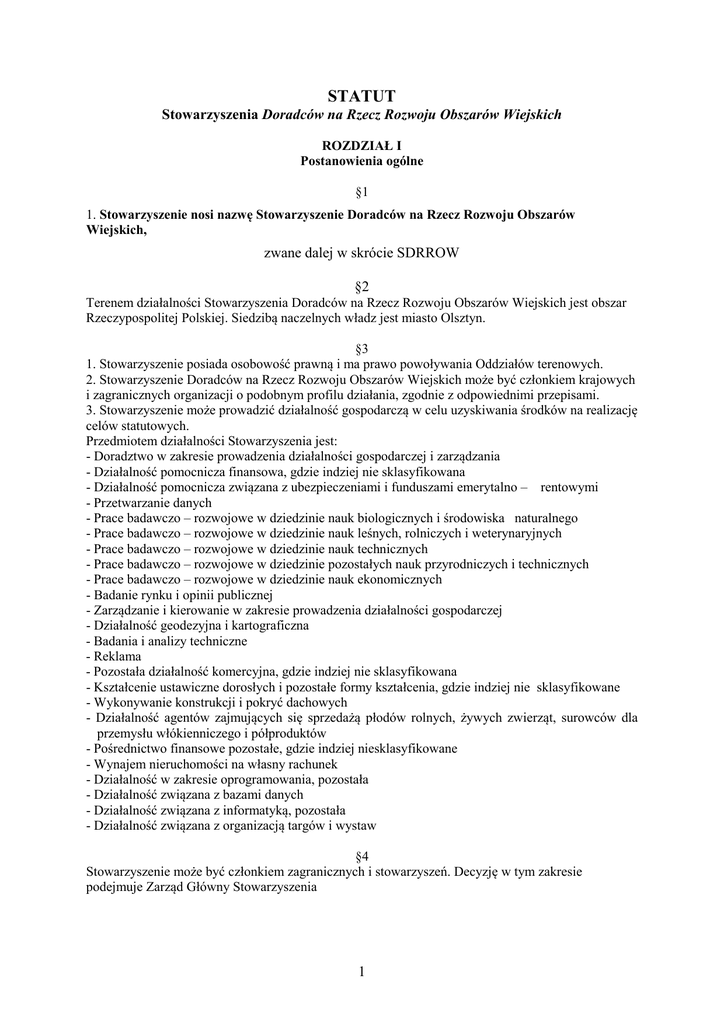 STATUT Stowarzyszenia Doradców na Rzecz Rozwoju Obszarów Wiejskich ROZDZIAŁ I Postanowienia ogólne §1 1. Stowarzyszenie nosi nazwę Stowarzyszenie Doradców na Rzecz Rozwoju Obszarów Wiejskich, zwane dalej w skrócie SDRROW §2 Terenem działalności Stowarzyszenia Doradców na Rzecz Rozwoju Obszarów Wiejskich jest obszar Rzeczypospolitej Polskiej. Siedzibą naczelnych władz jest miasto Olsztyn. §3 1. Stowarzyszenie posiada osobowość prawną i ma prawo powoływania Oddziałów terenowych. 2. Stowarzyszenie Doradców na Rzecz Rozwoju Obszarów Wiejskich może być członkiem krajowych i zagranicznych organizacji o podobnym profilu działania, zgodnie z odpowiednimi przepisami. 3. Stowarzyszenie może prowadzić działalność gospodarczą w celu uzyskiwania środków na realizację celów statutowych. Przedmiotem działalności Stowarzyszenia jest: - Doradztwo w zakresie prowadzenia działalności gospodarczej i zarządzania - Działalność pomocnicza finansowa, gdzie indziej nie sklasyfikowana - Działalność pomocnicza związana z ubezpieczeniami i funduszami emerytalno – rentowymi - Przetwarzanie danych - Prace badawczo – rozwojowe w dziedzinie nauk biologicznych i środowiska naturalnego - Prace badawczo – rozwojowe w dziedzinie nauk leśnych, rolniczych i weterynaryjnych - Prace badawczo – rozwojowe w dziedzinie nauk technicznych - Prace badawczo – rozwojowe w dziedzinie pozostałych nauk przyrodniczych i technicznych - Prace badawczo – rozwojowe w dziedzinie nauk ekonomicznych - Badanie rynku i opinii publicznej - Zarządzanie i kierowanie w zakresie prowadzenia działalności gospodarczej - Działalność geodezyjna i kartograficzna - Badania i analizy techniczne - Reklama - Pozostała działalność komercyjna, gdzie indziej nie sklasyfikowana - Kształcenie ustawiczne dorosłych i pozostałe formy kształcenia, gdzie indziej nie sklasyfikowane - Wykonywanie konstrukcji i pokryć dachowych - Działalność agentów zajmujących się sprzedażą płodów rolnych, żywych zwierząt, surowców dla przemysłu włókienniczego i półproduktów - Pośrednictwo finansowe pozostałe, gdzie indziej niesklasyfikowane - Wynajem nieruchomości na własny rachunek - Działalność w zakresie oprogramowania, pozostała - Działalność związana z bazami danych - Działalność związana z informatyką, pozostała - Działalność związana z organizacją targów i wystaw §4 Stowarzyszenie może być członkiem zagranicznych i stowarzyszeń. Decyzję w tym zakresie podejmuje Zarząd Główny Stowarzyszenia 1 ROZDZIAŁ II Cele i środki działania Stowarzyszenia §5 Celem i zadaniem Stowarzyszenia jest wspieranie rozwoju obszarów wiejskich w Polsce, w tym: − podnoszenie kwalifikacji zawodowych członków stowarzyszenia, − rozwijanie pakietu usług doradczych, zapewnienie ich wielofunkcyjności i kompleksowości zwłaszcza w zakresie dostosowania produkcji do standardów jakościowych UE, − stałe podnoszenie jakości świadczonych przez członków stowarzyszenia usług, − zapewnienie efektywności w wykorzystaniu zasobów ludzkich i rzeczowych, optymalizacja kosztów działania, − uelastycznienie struktur organizacyjnych i oferty programowej oraz ciągłe dostosowywanie jej do zmian zachodzących w kraju, poszczególnych regionach, czy na szczeblu lokalnym, − promocja doradztwa jako ekonomicznie i społecznie efektywnego instrumentu wspierania procesu wielofunkcyjnego rozwoju obszarów wiejskich, − − − integrowanie środowiska rolniczego i jego otoczenia wokół zagadnień związanych z pozyskiwaniem środków z funduszy UE, rozwijanie działalności na rzecz podnoszenia poziomu zawodowego i etycznego członków stowarzyszenia, tworzenie zasad etyki zawodowej i ich propagowanie w środowisku doradców- wprowadzanie wzorców i standardów doradztwa gospodarczego. §6 Cele te Stowarzyszenie osiąga przez: − wymianę informacji między członkami Stowarzyszenia, organizację szkoleń, seminariów, warsztatów naukowych i zawodowych, − organizowanie kongresów, zjazdów, konferencji, seminariów i narad, − organizowanie praktyk zagranicznych zbiorowych i indywidualnych oraz kursów i innych form szkolenia i doskonalenia zawodowego, − prowadzenie działalności edukacyjnej i promocyjnej przez środki masowego przekazu, wydawnictwa, opracowywanie i upowszechnianie informacji, − współdziałanie z właściwymi merytorycznie instytucjami i organizacjami działającymi w obszarze rolnictwa na rzecz procesów integracji z rolnictwem Unii Europejskiej, zajmowanie stanowiska do projektów ustaw i aktów wykonawczych, dotyczących rolnictwa i gospodarki żywnościowej oraz ochrony środowiska, − uczestnictwo w popularyzowaniu wiedzy dotyczącej zasad członkostwa w Unii Europejskiej, ze szczególnym uwzględnieniem problemów rolnictwa i obszarów wiejskich, − współdziałanie w zakresie popularyzowania zasad zrównoważonego rozwoju obszarów wiejskich, − współpraca ze szkołami i uczelniami rolniczymi, − organizowanie imprez turystycznych, kulturalnych i towarzyskich dla członków Stowarzyszenia. 2 ROZDZIAŁ III Członkowie, ich prawa i obowiązki §7 1. Członkowie dzielą się na: -zwyczajnych. -honorowych. -wspierających. Członkami zwyczajnymi mogą być: − absolwenci wyższych uczelni i średnich szkół rolniczych oraz absolwenci innych uczelni i szkół, pracujący w rolnictwie i jego otoczeniu, − studenci wyższych uczelni i uczniowie szkół, o ile osiągnęli wiek 16 lat. lekarze i technicy weterynarii? 2. Członków zwyczajnych przyjmuje Zarząd Oddziału Stowarzyszenia na podstawie pisemnej deklaracji zainteresowanego. 3. Potwierdzeniem przynależności do Stowarzyszenia jest ważna legitymacja członkowska z dowodem bieżącego opłacania składki. §8 1. Członkiem honorowym może być osoba fizyczna: szczególnie zasłużona dla rozwoju obszarów wiejskich, lub w dziedzinie polskiego rolnictwa. 2. Członkami honorowymi