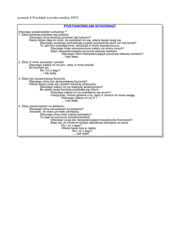 rysunek 4 Przykład wycinka analizy DNT. POSTANOWIŁAM SCHUDNĄĆ Dlaczego postanowiłam schudnąć ? 1. Żeby bardziej podobać się ludziom. Dlaczego chcę bardziej podobać się ludziom? Kiedy ludzie dają mi znać, że podobam im się, wtedy lepiej czuję się. Dlaczego oczekuję (potrzebuję) czyjejś pozytywnej opinii na mój temat? To, jak inni oceniają mnie, decyduje o moim samopoczuciu. Dlaczego moje samopoczucie zależy od oceny innych? Mam niewystarczające poczucie własnej wartości. Dlaczego mam niewystarczające poczucie własnej wartości? ... i tak dalej 2. Żeby X mnie zauważył i polubił. Dlaczego zależy mi na tym, żeby X mnie polubił. Bo kocham go. No i co z tego? ... i tak dalej 3. Żeby być sprawniejszą fizycznie. Dlaczego chcę być sprawniejszą fizycznie? Wtedy lepiej czuję się i jestem bardziej atrakcyjna. Dlaczego zależy mi na większej atrakcyjności? Bo wtedy będę bardziej podobała się innym. Dlaczego zależy mi na podobaniu się innym? Faktycznie, chodzi głównie o to, żeby X zwrócił na mnie uwagę. Dlaczego zależy mi na X ? ... i tak dalej 4. Żeby zaoszczędzić na jedzeniu. Dlaczego chcę oszczędzać na jedzeniu? Uważam, że mam za mało pieniędzy. Dlaczego chcę mieć więcej pieniędzy? To daje mi poczucie bezpieczeństwa. Dlaczego czuję się niewystarczająco bezpiecznie finansowo? Boję się, że może mi kiedyś zabraknąć pieniędzy na życie. No i co z tego? Wtedy będę żyła w nędzy. No i co z tego? ... i tak dalej