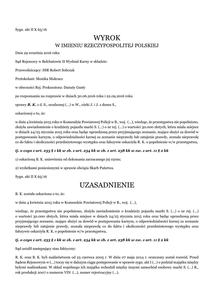 Sygn. akt II K 65/16 WYROK W IMIENIU RZECZYPOSPOLITEJ POLSKIEJ Dnia 29 września 2016 roku Sąd Rejonowy w Bełchatowie II Wydział Karny w składzie: Przewodniczący: SSR Robert Sobczak Protokolant: Monika Mokracz w obecności Rej. Prokuratora: Danuty Gusty po rozpoznaniu na rozprawie w dniach 30.06.2016 roku i 22.09.2016 roku sprawy B. K. z d. S., urodzonej (...) w W., córki J. i J. z domu S., oskarżonej o to, że: w dniu 4 kwietnia 2015 roku w Komendzie Powiatowej Policji w B., woj. (...), wiedząc, że przestępstwa nie popełniono, złożyła zawiadomienie o kradzieży pojazdu marki S. (...) o nr rej. (...) o wartości 30.000 złotych, która miała miejsce w dniach 24/25 stycznia 2015 roku oraz będąc uprzedzoną przez przyjmującego zeznanie, mające służyć za dowód w postępowaniu karnym, o odpowiedzialności karnej za zeznanie nieprawdy lub zatajenie prawdy, zeznała nieprawdę co do faktu i okoliczności przedmiotowego występku oraz fałszywie oskarżyła R. K. o popełnienie w/w przestępstwa, tj. o czyn z art. 233 § 1 kk w zb. z art. 234 kk w zb. z art. 238 kk w zw. z art. 11 § 2 kk 1) oskarżoną B. K. uniewinnia od dokonania zarzucanego jej czynu; 2) wydatkami poniesionymi w sprawie obciąża Skarb Państwa. Sygn. akt II K 65/16 UZASADNIENIE B. K. została oskarżona o to, że: w dniu 4 kwietnia 2015 roku w Komendzie Powiatowej Policji w B., woj. (...), wiedząc, że przestępstwa nie popełniono, złożyła zawiadomienie o kradzieży pojazdu marki S. (...) o nr rej. (...) o wartości 30.000 złotych, która miała miejsce w dniach 24/25 stycznia 2015 roku oraz będąc uprzedzoną przez przyjmującego zeznanie, mające służyć za dowód w postępowaniu karnym, o odpowiedzialności karnej za zeznanie nieprawdy lub zatajenie prawdy, zeznała nieprawdę co do faktu i okoliczności przedmiotowego występku oraz fałszywie oskarżyła R. K. o popełnienie w/w przestępstwa, tj. o czyn z art. 233 § 1 kk w zb. z art. 234 kk w zb. z art. 238 kk w zw. z art. 11 § 2 kk Sąd ustalił następujący stan faktyczny: R. K. oraz B. K. byli małżeństwem od 25 czerwca 2005 r. W dniu 07 maja 2014 r. orzeczony został rozwód. Przed Sądem Rejonowym w (...) toczy się w dalszym ciągu postępowanie w sprawie sygn. akt I (...) o podział majątku między byłymi małżonkami. W skład wspólnego ich majątku wchodził między innymi samochód osobowy marki S. (...) R., rok produkcji 2007 o numerze VIN (...), numer rejestracyjny (...). / dowód: wyjaśnienia oskarżonej B. K. k-53-55, częściowo zeznania świadka R. K. k-55-59, protokół rozprawy ze sprawy I Ns (...) k-50-51/. B. K. razem z R. K. byli współwłaścicielami mieszkania w miejscowości J. przy ul (...) oraz dwóch miejsc garażowych, które znajdują się w tym bloku. W dniu 25 stycznia 2015 r. około godziny 10:00 B. K. poszła do garażu i zauważyła, że nie ma tam samochodu marki S. (...). Drzwi i brama od garażu były zamknięte na klucz. Nie było żadnych śladów włamania. Kiedy zobaczyła, że nie ma samochodu od razu pomyślała, że został zabrany przez jej męża, ponieważ posiadał on klucze od auta oraz pilot do bramy wjazdowej na osiedle oraz do garażu. On miał także dokumenty od pojazdu i komplet dwóch kluczy. Tego samego dnia napisała wiadomość e-mail do byłego męża z zapytaniem, gdzie znajduje się samochód, ale nie otrzymała odpowiedzi. Poinformowała o tym fakcie swojego brata, który jest funkcjonariuszem Policji w KPP w B. i on poradził jej, żeby złożyła zawiadomienie o popełnieniu przestępstwa. Oskarżona zwlekała ze złożeniem zawiadomienia, ponieważ czekała na wyjaśnienie sprawy ze strony męża oraz nie chciała składać zawiadomienia w jednostce Policji w P., bo tam toczą się różne postępowania miedzy nią a jej byłym mężem. Następnie oskarżona w marcu 2015 roku zauważyła samochód S. (...) w miejscowości P. na posesji, której aktualnie przebywał R. K.. Poznała, że był to ich samochód, gdyż była w nim za szybą maskotka należąca do jej dzieci. Auto miało zmienione numery rejestracyjne na (...). /dowód: wyjaśnienia oskarżonej B. K. k. 53-55, zeznania świadka Z. S. k. 60-61/ W dniu 14 stycznia 2015 r. R. K. sprzedał samochód osobowy marki S. (...) R., rok produkcji 2007 o numerze VIN (...), numer rejestracyjny (...) swojej sympatii M. D. (1) za kwotę 12.000 złotych oświadczając w §2 zawartej umowy pisemnej, iż wymieniony pojazd stanowi jego wyłączną własność, jest wolny od wad prawnych oraz praw osób trzecich, oraz nie toczy się żadne postępowanie, którego przedmiotem jest ten pojazd i nie stanowi on przedmiotu zabezpieczenia. / dowód: częściowo: zeznania świadka R. K. k. 55-59 w zw. z k-46 zbioru C i k-105-106 zbioru C, zeznania świadka M. D. (1) k -62-63 w zw. z k-82v od słów,, jestem obecnie’’ do k-83 do słów ,, powinnam mieć to pismo’’ zbioru C, kserokopia „umowy kupna-sprzedaży” k. 7 zbiór A/ B. K. zdecydowała się złożyć zawiadomienie o podejrzeniu popełnienia przestępstwa w dniu 04 kwietnia 2015 r. w Komendzie Powiatowej Policji w B., kiedy była wówczas z wizytą w B. u rodziny na Święta Wielkanocne. /wyjaśnienia oskarżonej B. K. k. 53-55, zeznania świadka Z. S. k. 60-61/ W protokole przyjęcia ustnego zawiadomienia o przestępstwie podała, iż podejrzewa, że to jej były mąż wyprowadził samochód z garażu. Zaznaczyła, że w lutym 2015 r. R. K. poinformował komornika o sprzedaży samochodu marki S. (...) i potwierdził to na rozprawie w dniu 20 marca 2015 r. przed Sądem Rejonowym w P.. Potwierdziła, że w marcu zobaczyła to auto na posesji przy ul. (...) w P., gdzie aktualnie przebywa R. K. oraz to, że auto obecnie jest przerejestrowane i ma numer (...). Ponadto oskarżona zeznała do protokołu, iż nie wyrażała zgody na sprzedaż tego pojazdu i nie dostała żadnych pieniędzy z jego sprzedaży. Była przed przesłuchaniem uprzedzona przez funkcjonariusz