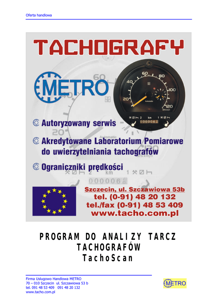 Oferta handlowa PROGRAM DO ANALIZY TARCZ TACHOGRAFÓW TachoScan Firma Uslugowo Handlowa METRO 70 – 010 Szczecin ul. Szczawiowa 53 b tel. 091 48 53 409 091 48 20 132 www.tacho.com.pl Oferta handlowa OFERTA NA PROGRAM TachoScan Jest to program sluzacy do skanowania i analizy tarczek tachografów. W sklad calego systemu wchodzi skaner do skanowania tarczek oraz program analizujacy odczytane dane. Ma on pomóc pracownikom przedsiebiorstw w precyzyjnej i szybkiej analizie zapisów tachografów. Uwzglednia on równiez potrzeby pracodawcy zwiazane z wejsciem Ustawy o czasie pracy kierowców (kontrolowanie i ewidencjonowanie). WLASCIWOSCI PROGRAMU TachoScan: ?? czas skanowania i analizy jednej wykresówki trwa okolo 5 sekund, ?? umozliwia analize ok. 100 tarczek na godzine, ?? umozliwia skanowanie do 6 wykresówek w jednym przebiegu skanera, ?? akceptuje wszystkie platformy systemowe: Windows 98/Me/2000/XP, ?? rozdzielczosc odczytu czasu wynosi 1 minuta, ?? generowanie raportów np.: czasu pracy kierowcy, zgodnosci czasów pracy z przepisami, ilosci przejechanych kilometrów itp., ?? ewidencja szczególowych danych tarczy, ?? jest to program w calosci polski, ?? uzytkownik posiada mozliwosc recznej weryfikacji zanalizowanych danych, ?? umozliwia obsluge wielu firm, ?? mozliwosc pracy programu w sieci, ?? gwarancja zapewnia przez najblizszy rok serwis dostarczonego oprogramowania, który obejmuje: - rozwiazywanie ewentualnych problemów z oprogramowaniem, - dostarczanie aktualizacji programu w przypadku zmian w przepisach, - modernizacje na zyczenie Klienta. W SKLAD ZESTWU WCHODZI: 1) Plyta instalacyjna Programu TachoScan wraz z kluczem sprzetowym, 2) Skaner CANON LIDE20, 3) Instrukcje do Programu, 4) Warunki gwarancji na Program, Skaner oraz warunki serwisu gwarancyjnego i pogwarancyjnego. CENNIK: Program TachoScan = 5000 zl netto Program TachoScan Mini = 3500 zl netto (w przygotowaniu) Program TachoScan Portiernia = 3500 zl netto Program TachoScan Raporty = 1000 zl netto Firma Uslugowo Handlowa METRO 70 – 010 Szczecin ul. Szczawiowa 53 b tel. 091 48 53 409 091 48 20 132 www.tacho.com.pl Oferta handlowa Skaner CANON LIDE20 = 331 zl netto DODATKOWE MODULY: Modul Tarczki z wycieciem = 1500 zl netto (testy) Modul Paliwowy = 1000 zl netto Modul Karta Pracy Kierowcy = 1000 zl netto Inne moduly na zyczenie Klienta. OPIS W/W PROGRAMÓW I MODULÓW: Program TachoScan – Jest to pelna wersja Programu. Opis powyzej. Program TachoScan Mini – Jest to pelna wersja Programu TachoScan, ale przeznaczona dla przedsiebiorstw do 10 samochodów (ograniczenie ilosci wprowadzonych samochodów) . Program TachoScan Portiernia – Jest to program przeznaczony na portiernie. Glównym zadaniem portiera jest zeskanowanie tarczek i zapisanie ich do bazy. Dalsza analiza nastepuje na drugim stanowisku (np. w dziale transportu) przez osobe upowazniona do tych czynnosci. Program ma wylaczone generowanie raportów oraz zablokowana ingerencje uzytkownika w zaanalizowane tarcze. Dzieki takiemu rozwiazaniu uzyskamy analize czasu pracy kierowców na biezaco. Warunkiem jest posiadanie sieci komputerowej pomiedzy tymi stanowiskami. Program TachoScan Raporty - Jest to program posiadajacy tylko raporty z danymi pochodzacymi z zanalizowanych tarcz tachografów. Przeznaczony jest dla osób, które na biezaco potrzebuja miec wglad do informacji o czasie pracy swoich Kierowców bez potrzeby modyfikacji danych. Warunkiem jest posiadanie sieci komputerowej pomiedzy stanowiskami. Modul Tarczki z wycieciem – modul, który sluzy do analizy tarczek typu MP 023. Modul Paliwowy – modul sluzacy do analizy zuzycia paliwa. Modul Karta Pracy Kierowcy – modul umozliwiajacy wprowadzanie danych pochodzacych z karty pracy kierowcy wraz z okreslaniem zuzycia paliwa oraz tras. SKANER: Producent zaleca stosowanie skanera typu CANON LIDE 20 do wsólpracy z Programem TachoScan. WYMAGANIA SPRZETOWE: 1) komputer z procesorem nie mniejszym niz 500 MHz, 2) gniazdo USB, 3) min. 128 MB RAM-u. Wersja DEMO programu do pobrania z naszej strony internetowej www.tacho.com.pl Firma Uslugowo Handlowa METRO 70 – 010 Szczecin ul. Szczawiowa 53 b tel. 091 48 53 409 091 48 20 132 www.tacho.com.pl Oferta handlowa LISTA REFERENCYJNA: Program TachoScan jest na rynku polskim od 1 wrzesnia 2002r., a wdrozony jest m.in. w takich przedsiebiorstwach jak: 1. ZTE 2. ACTING Sp. z o. o. 3. AHOLD Polska Sp. z o.o. 4. CMC Sp. z o.o. 5. Zaklady Tluszczowe BIELMAR 6. DUHABEX Sp. J. 7. PKS Zyrardów 8. PPKS Nowy Sacz 9. PKS Cieszyn 10. PKS Stargard 11. PKS Wisla 12. ROMTO Sp. z o.o. 13. MULTI 14. LOZINSKI Sp. J. 15. DELTA TRANS LOGISTIK Sp. z o.o. 16. AUTOZAT Sp. z o.o. 17. RENERDAU 18. STALBUD 19. USLUGI TARNSPORT-HANDEL Kalinowski J. 20. HARTWIG Katowice 21. HARTWIG Warszawa 22. KUZNIA TRANS 23. TRANS STRZELEC Sp. z o.o. 24. WSP SPOLEM 25. KOLOCZEK 26. MC TRANS 27. H.Z. TRANSPORT Poland 28. ZPM KANIA 29. PPC GRYF SZCZECIN 30. SZWAGROPOL 31. BRUHN TRANSPORT 32. BRUHN TRANSPORT 33. ATF HEAVY TRANSPORT 34. LOGPOL 35. LOGPOL 36. BRANDT Sp. z o.o. 37. ENERGOPOL PLUS 38. CJ INTERNATIONAL 39. BISTRANS 40. WIKTOROWICZ Sp.J. 41. USLUGI TRANSPORTOWE L. KROSTA 42. GKT 43. MIGREN 44. MAN-TRANS 45. BOMATUR 46. DROGBUS 47. HEDAR 48. KORAL 49. RAFTRANS 50. ZYLNE 51. LABATRO 52. ANMARO Firma Uslugowo Handlowa METRO 70 – 010 Szczecin ul. Szczawiowa 53 b tel. 091 48 53 409 091 48 20 132 www.tacho.com.pl - RADOM - KATOWICE - KRAKÓW - KETY - BIELSKO-BIALA - CZRZANÓW - ZYRARDÓW - NOWY SACZ - CIESZYN - STARGARD - WISLA - Andrychów - Andrychów - BOBREK - CHORZÓW - TARNÓW - WALBRZYCH - WALBRZYCH - WALBRZYCH - KATOWICE - WARSZAWA - KATOWICE - JANUSZOWICE - KIELCE - BELSZNICA - KSAWERÓW - CZESTOCHOWA - PSZCZYNA - SZCZECIN - STADNIKI - WARSZAWA - OPOLE - LOMIANKI - WARSZAWA - LESZCZYNY - WARSZAWA - WARSZAWA - WARSZAWA - SZCZECIN - STRZEGOM - STRZEGOM - LODYGOWICE