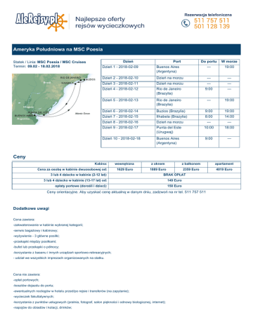Ameryka Południowa na MSC Poesia Statek / Linia: MSC Poesia / MSC Cruises Termin: 09.02 - 18.02.2018 Do portu W morze Dzień 1 - 2018-02-09 Dzień Buenos Aires (Argentyna) Port --- 19:00 Dzień 2 - 2018-02-10 Dzień na morzu --- --- Dzień 3 - 2018-02-11 Dzień na morzu --- --- Dzień 4 - 2018-02-12 Rio de Janeiro (Brazylia) 9:00 --- Dzień 5 - 2018-02-13 Rio de Janeiro (Brazylia) --- 19:00 Dzień 6 - 2018-02-14 Buzios (Brazylia) 9:00 19:00 Dzień 7 - 2018-02-15 Ilhabela (Brazylia) 8:00 14:00 Dzień 8 - 2018-02-16 Dzień na morzu --- --- Dzień 9 - 2018-02-17 Punta del Este (Urugwaj) 10:00 18:00 Dzień 10 - 2018-02-18 Buenos Aires (Argentyna) 9:00 --- Ceny Kabina: Cena za osobę w kabinie dwuosobowej od: wewnętrzna z oknem z balkonem apartament 1629 Euro 1889 Euro 2359 Euro 4019 Euro 3 lub 4 dziecko w kabinie (2-12 lat): BRAK OPŁAT 3 lub 4 dziecko w kabinie (13-17 lat) od: 149 Euro opłaty portowe (dorośli i dzieci): 150 Euro Ceny orientacyjne. Aby uzyskać cenę aktualną w danym dniu, zadzwoń na nr tel. 511 757 511 Dodatkowe uwagi Cena zawiera: -zakwaterowanie w kabinie wybranej kategorii; -serwis bagażowy i kabinowy; -wyżywienie - 3 główne posiłki; -przekąski między posiłkami; -bufet lub przekąski o północy; -korzystanie z basenu i innych urządzeń sportowo-rekreacyjnych; - udział we wszystkich imprezach organizowanych na statku. Cena nie zawiera: -opłat portowych; -kosztów dojazdu do portu; -ewentualnych noclegów w hotelu przed/po rejsie i transferów (na zapytanie); -wycieczek fakultatywnych; -korzystania z punktów usługowych (pralnia, fotograf, salon piękności i odnowy biologicznej, internet); -napojów do obiadów i kolacji, drinków; -napiwków obowiązkowych dla obsługi statku (ok. 10Euro/dzień/osoba powyżej 12; 5Euro/dzień/dziecko 2-12 lat), - ubezpieczenia KL, NW i bagażu. Kabiny: MSC Cruises oferuje następujące rodzaje kabin: kabiny wewnętrzne - Bella, Fantastica kabiny z oknem - Bella, Fantastica kabiny z balkonem - Bella, Fantastica Podstawowe różnice: Kategoria Bella - kabiny usytuowane na niższych pokładach. Kabiny z oknem i z balkonem mogą mieć ograniczoną widoczność. Możliwość zamówienia do kabiny śniadania za dopłatą. Kategoria Fantastica - kabiny usytuowane na wyższych pokładach. Śniadanie serwowane do kabiny w cenie rejsu, 50% zniżki na zajęcia fitness, joga lub treningi na siłowni z indywidualnym trenerem, możliwość wyboru tury kolacji. ALL INCLUSIVE (opcja): Istnieje możliwość wykupienia pakietów ALL INCLUSIVE (dwa rodzaje do wyboru) w cenie od 43,00 EURO na dzień dla osób dorosłych i od 21,00 EURO na dzień dla dzieci. MSC Poesia MSC Poesia Tonaż: 89.600 ton, Rok budowy: 2008 Długość: 293,8 m Szerokość: 32,2 m Szybkość: 23 węzły Pokłady pasażerskie: 13 Załoga: 987 Pasażerowie: 2.550 (do 3.000) Basen: 2 (4 jacuzzi i basen dla dzieci) Waluta: EURO Do dyspozycji:4 restauracje, bary, sushi bar, wine bar, kasyno, pokój cygar, pokój gier, dyskoteka, sala widowiskowa, kino, salon odnowy biologicznej, sauna, fitness center, boisko (kort tenisowy), symulator do gry w golfa, trasa do joggingu, pokój zabaw dla dzieci, punkt medyczny, biblioteka, kawiarenka internetowa, sala gier video, salon piękności, butiki, sklep wolnocłowy, centrum konferencyjne. Kabiny. 1.275 kabin wyposażonych w łazienkę (prysznic, wc, suszarka), klimatyzację (indywidualnie sterowaną), radio pokładowe, telefon do użytku wewnętrznego, sejf, mini bar, TV. 809 kabin posiada balkony. Większość kabin ma 2 pojedyncze łóżka, które na zmówienie można połączyć w 1 podwójne. 18 kabin typu suite (25m²) łóżko małżeńskie, które na zamówienie można rozłączyć na 2 pojedyncze. MSC Poesia to mgnienie nowoczesnej, wiodącej technologii, eleganckiego otoczenia, ekscytujących lokali rozrywkowych czy też rozkoszy dla podniebienia. MSC Poesia jest jak morze, kołysze delikatnymi falami i kipi emocjami. Tak jak poezja sprawia nam przyjemność, tak MSC Poesia wprowadzi cię w nowy wymiat przyjemności płynącej z wakacji na cudownym i innowacyjnym statku. Od balkonólw z widokiem na ocean i pełne gwiazd niebo przy akompaniamencie arii Verdi, wymieszanych z dźwiękami samby z imprezy nad basenem popłynie strumień emocji. MSC Poesia niewoli wszystkich swoim pięknem. Podróżuj na pokładzie MSC Poesia i doświadcz emocji płynących z morskiego rejsu.
