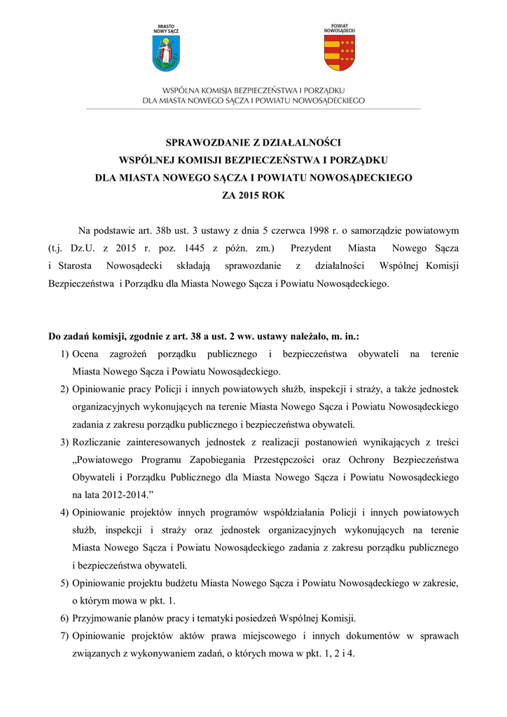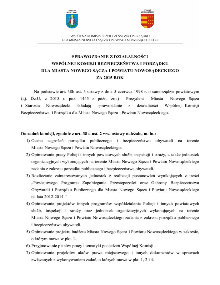 SPRAWOZDANIE Z DZIAŁALNOŚCI WSPÓLNEJ KOMISJI BEZPIECZEŃSTWA I PORZĄDKU DLA MIASTA NOWEGO SĄCZA I POWIATU NOWOSĄDECKIEGO ZA 2015 ROK Na podstawie art. 38b ust. 3 ustawy z dnia 5 czerwca 1998 r. o samorządzie powiatowym (t.j. Dz.U. z 2015 r. poz. 1445 z późn. zm.) i Starosta Nowosądecki składają sprawozdanie Prezydent z Miasta działalności Nowego Sącza Wspólnej Komisji Bezpieczeństwa i Porządku dla Miasta Nowego Sącza i Powiatu Nowosądeckiego. Do zadań komisji, zgodnie z art. 38 a ust. 2 ww. ustawy należało, m. in.: 1) Ocena zagrożeń porządku publicznego i bezpieczeństwa obywateli na terenie Miasta Nowego Sącza i Powiatu Nowosądeckiego. 2) Opiniowanie pracy Policji i innych powiatowych służb, inspekcji i straży, a także jednostek organizacyjnych wykonujących na terenie Miasta Nowego Sącza i Powiatu Nowosądeckiego zadania z zakresu porządku publicznego i bezpieczeństwa obywateli. 3) Rozliczanie zainteresowanych jednostek z realizacji postanowień wynikających z treści „Powiatowego Programu Zapobiegania Przestępczości oraz Ochrony Bezpieczeństwa Obywateli i Porządku Publicznego dla Miasta Nowego Sącza i Powiatu Nowosądeckiego na lata 2012-2014.” 4) Opiniowanie projektów innych programów współdziałania Policji i innych powiatowych służb, inspekcji i straży oraz jednostek organizacyjnych wykonujących na terenie Miasta Nowego Sącza i Powiatu Nowosądeckiego zadania z zakresu porządku publicznego i bezpieczeństwa obywateli. 5) Opiniowanie projektu budżetu Miasta Nowego Sącza i Powiatu Nowosądeckiego w zakresie, o którym mowa w pkt. 1. 6) Przyjmowanie planów pracy i tematyki posiedzeń Wspólnej Komisji. 7) Opiniowanie projektów aktów prawa miejscowego i innych dokumentów w sprawach związanych z wykonywaniem zadań, o których mowa w pkt. 1, 2 i 4. 2 8) Opiniowanie zleconych przez Starostę Nowosądeckiego lub Prezydenta Miasta Nowego Sącza innych niż wymienione w pkt. 2 i pkt. 4 - 6 zagadnień dotyczących porządku publicznego i bezpieczeństwa obywateli. W 2015 roku skład Wspólnej Komisji Bezpieczeństwa i Porządku dla Miasta Nowego Sącza i Powiatu Nowosądeckiego przedstawiał się następująco: WSPÓŁPRZEWODNICZĄCY KOMISJI: - Ryszard NOWAK – Prezydent Miasta Nowego Sącza, - Marek PŁAWIAK – Starosta Nowosądecki. CZŁONKOWIE WSPÓLNEJ KOMISJI: Radni delegowani przez Radę Miasta Nowego Sącza: - Przemysław GAWŁOWSKI – Radny Rady Miasta Nowego Sącza, - Józef GRYŹLAK – Radny Rady Miasta Nowego Sącza. Radni delegowani przez Radę Powiatu Nowosądeckiego oraz Zarząd: - Marian RYBA – Radny Rady Powiatu Nowosądeckiego, - Ryszard PORADOWSKI – Radny Rady Powiatu Nowosądeckiego. Osoby powołane przez Prezydenta Miasta Nowego Sącza oraz przez Starostę Nowosądeckiego: - insp. Marek RUDNIK – Komendant Miejski Policji w Nowym Sączu – brał udział w trzech posiedzeniach Komisji tj. w dniach 16.01., 7.05., 1.10. 2015 roku, - mł. insp. Jarosław TOKARCZYK – Komendant Miejski Policji w Nowym Sączu powołany na stanowisko Komendanta w październiku 2015 r., brał udział w posiedzeniu Komisji w dniu 17.12.2015 roku., - st. bryg. Janusz BASIAGA – Komendant Miejski Państwowej Straży Pożarnej w Nowym Sączu, - Marian MARSZAŁEK – Naczelnik Wydziału Operacyjno-Szkoleniowego Państwowej Straży Pożarnej w Nowym Sączu, - Adam CZERWIŃSKI – Dyrektor Powiatowego Zarządu Dróg w Nowym Sączu, - Franciszek KANTOR – Członek Zarządu Powiatu Nowosądeckiego, - Adam KAUFMAN – Komendant Straży Miejskiej w Nowym Sączu, 3 - Ryszard WĄSOWICZ – Kierownik Powiatowego Centrum Zarządzania Kryzysowego, - Marek NIEĆ – Dyrektor Wydziału Zarządzania Kryzysowego i Ochrony Ludności Urzędu Miasta Nowego Sącza, - Witold RUTKOWSKI – Inspektor w Wydziale Zarządzania Kryzysowego i Ochrony Ludności Urzędu Miasta Nowego Sącza, - Krzysztof SETLAK – Sekretarz Gminy Łabowa. Przedstawiciel Policji delegowany przez Komendanta Miejskiego Policji w Nowym Sączu: - Podinspektor Krzysztof CHOCHLIŃSKI – Naczelnik Wydziału Prewencji Komendy Miejskiej Policji w Nowym Sączu. Wspólna Komisja Bezpieczeństwa i Porządku dla Miasta Nowego Sącza i Powiatu Nowosądeckiego w 2015 roku odbyła 4 posiedzenia. Przedmiotem I posiedzenia Wspólnej Komisji Bezpieczeństwa i Porządku dla Miasta Nowego Sącza i Powiatu Nowosądeckiego w dniu 16 stycznia 2015 roku było w szczególności: 1) Przedstawienie zaktualizowanego składu osobowego Zespołu Bezpieczeństwa w Ruchu Drogowym działającego w ramach Wspólnej Komisji Bezpieczeństwa i Porządku dla Miasta Nowego Sącza i Powiatu Nowosądeckiego 2) Komisja dokonała rozliczenia wszystkich jednostek z realizacji postanowień wynikających z treści „Powiatowego Programu Zapobiegania Przestępczości oraz Ochrony Bezpieczeństwa Obywateli i Porządku Publicznego dla Miasta Nowego Sącza i Powiatu Nowosądeckiego na lata 2012-2014”. 3) Przedstawienie i zaopiniowanie składu osobowego Zespołu wyłonionego z członków Wspólnej Komisji Bezpieczeństwa i Porządku dla Miasta Nowego Sącza i Powiatu Nowosądeckiego do opracowania Powiatowego Programu Zapobiegania Przestępczości oraz Ochrony Bezpieczeństwa Obywateli i Porządku Publicznego dla Miasta Nowego Sącza i Powiatu Nowosądeckiego. 4) Przedstawienie głównych zadań do realizacji w 2015 roku przez Komendę Miejską Policji w Nowym Sączu. 5) Przedstawienie głównych zadań do realizacji w 2015 roku przez Komendę Miejską Państwowej Straży Pożarnej w Nowym Sączu oraz zapoznanie z przyjętymi kierunkami działania Krajowego Systemu Ratowniczo-Gaśniczego na szczeblu kraju i województwa. 6) Przyjęcie sprawozdania z pracy Wspólnej Komisji Bezpieczeństwa i Porządku dla Miasta Nowego Sącza i Powiatu Nowosądeckiego za 2014 rok. 4 7) Przyjęcie Planu Pracy oraz tematyki posiedzeń Wspólnej Komisji Bezpieczeństwa na 2015 rok. Przedmiotem II posiedzenia Wspólnej Komisji Bezpieczeństwa 
