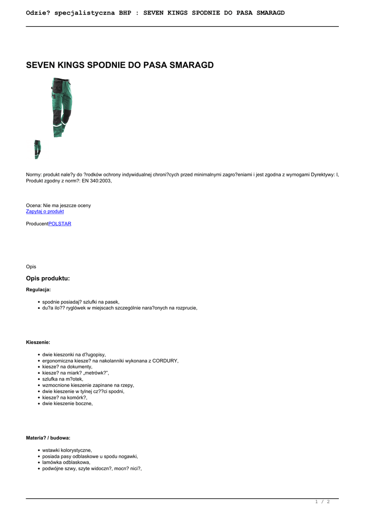 Odzie? specjalistyczna BHP : SEVEN KINGS SPODNIE DO PASA SMARAGD SEVEN KINGS SPODNIE DO PASA SMARAGD Normy: produkt nale?y do ?rodków ochrony indywidualnej chroni?cych przed minimalnymi zagro?eniami i jest zgodna z wymogami Dyrektywy: I, Produkt zgodny z norm?: EN 340:2003, Ocena: Nie ma jeszcze oceny Zapytaj o produkt ProducentPOLSTAR Opis Opis produktu: Regulacja: spodnie posiadaj? szlufki na pasek, du?a ilo?? ryglówek w miejscach szczególnie nara?onych na rozprucie, Kieszenie: dwie kieszonki na d?ugopisy, ergonomiczna kiesze? na nakolanniki wykonana z CORDURY, kiesze? na dokumenty, kiesze? na miark? „metrówk?”, szlufka na m?otek, wzmocnione kieszenie zapinane na rzepy, dwie kieszenie w tylnej cz??ci spodni, kiesze? na komórk?, dwie kieszenie boczne, Materia? / budowa: wstawki kolorystyczne, posiada pasy odblaskowe u spodu nogawki, lamówka odblaskowa, podwójne szwy, szyte widoczn?, mocn? nici?, 1 / 2 Odzie? specjalistyczna BHP : SEVEN KINGS SPODNIE DO PASA SMARAGD wykonane z wysokiej jako?ci materia?u, który zapewnia po wielokrotnym praniu stabilno?? kolorów i rozmiarów, 2 / 2 Powered by TCPDF (www.tcpdf.org)