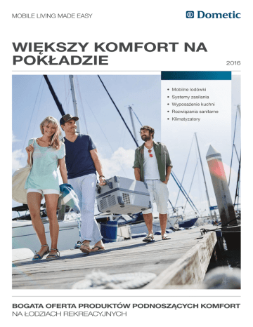 MOBILE LIVING MADE EASY WIĘKSZY KOMFORT NA POKŁADZIE 2016 • Mobilne lodówki • Systemy zasilania • Wyposażenie kuchni • Rozwiązania sanitarne • Klimatyzatory BOGATA OFERTA PRODUKTÓW PODNOSZĄCYCH KOMFORT NA ŁODZIACH REKREACYJNYCH 2 Dane ŻYCIE NA POKŁADZIE JEST PROSTSZE Dometic dostarcza właścicielom łodzi inteligentne i niezawodne produkty o wyjątkowym wzornictwie. Dometic zapewnia systemy i wyposażenie dla łodzi rekreacyjnych wszystkich typów i wielkości, od weekendowych jednostek rekreacyjnych do wielkich jachtów. Dometic zapewnia również fachową wiedzę i niezawodność w przypadku produktów zaprojektowanych dla przemysłu morskiego przeznaczonych do wykorzystania zarówno na morzu, jak i na lądzie. Jesteśmy dumni z naszej dostępnej na całym świecie sieci serwisowej oraz naszych techników, w pełni przeszkolonych w zakresie dostarczania produktów o najwyższej jakości. Właścicielom łodzi firma Dometic oferuje produkty w zakresie systemów klimatyzacji (klimatyzatory), systemów sanitarnych (toalety, systemy sanitarne i niezbędne materiały eksploatacyjne) oraz żywności i napojów (lodówki, kuchenki, zlewy i piekarniki). www.dometic.pl/marine • Lodówki przenośne • Lodówki wolnostojące i do zabudowy •A gregaty chłodnicze SYSTEMY ZASILANIA Produkty Dometic i WAECO regularnie otrzymują nagrody w kategoriach wzornictwa i najbardziej konkurencyjnych marek. Jesteśmy z tego dumni. Jednocześnie motywuje nas to do ciągłego rozwijania się i ulepszania tego, co dotychczas osiągnęliśmy. •Ł adowarki • Konwertery z ładowarką • Inwertery sinusoidalne • I nwertery • Akcesoria podtrzymujące napięcie akumulatorów • System zarządzania akumulatorem • Konwertery napięcia • Inwerter sinusoidalny z automatyczną ładowarką •G enerator WYPOSAŻENIE KUCHNI DOMETIC SERVICE DOMETIC GROUP W SIECI www.dometic.pl/marine [email protected] W niniejszym katalogu prezentujemy dużą część asortymentu naszych produktów przeznaczonych dla jachtów i łodzi. Pełną ofertę znajdziesz na naszej stronie internetowej, zawierającej szczegółowe opisy, wszystkie dane techniczne i przydatne wskazówki. Nasze zaangażowanie w tworzenie wysokiej jakości innowacyjnych produktów jest znane w całej branży. Tak samo jak fakt, że nasze produkty wytwarzamy w 20 fabrykach na całym świecie. Wszyscy wiodący producenci łodzi wyposażają swoje produkty w komfortowe wyposażenie marki Dometic. 26 – 31 • Kuchenki spirytusowe / Piekarniki • Kuchenki z piekarnikiem • Piekarniki / Kuchenki gazowe • Kuchenki do zabudowy • Zestawy kuchenki ze zlewozmywakiem do zabudowy lewy •Z •G rill • Okapy kuchenne • Ekspresy do kawy / Czajnik elektryczny • Sejf • Odkurzacze • Środki czyszczące ROZWIĄZANIA SANITARNE KOMFORT PROSTO Z FABRYKI – OEM BY DOMETIC GROUP Systemy zasilania NAGRADZANE PRODUKTY 20 – 25 32 – 39 • Toalety z rozdrabniaczem • Zbiorniki sanitarne do jachtów i łodzi • Akcesoria i części zamienne do zbiorników sanitarnych • Ciśnieniowe pompy wody • Toalety przenośne • Środki sanitarne i papier toaletowy KLIMATYZATORY • Klimatyzator dachowy do łodzi profesjonalnych • Akcesoria do systemów klimatyzacji •K ompletne systemy klimatyzacji www.dometic.pl/marine Wyposażenie kuchni Gdy pilnie potrzebujesz porady lub części zamiennych – Dometic zawsze jest nieopodal. Nasi partnerzy serwisowi są dostępni dla klientów w ponad 100 krajach na całym świecie, zwykle w pobliżu wybrzeży. 4 – 19 Rozwiązania sanitarne MOBILNE LODÓWKI 40 – 41 Klimatyzatory SIEĆ SERWISOWA 3 Mobilne lodówki Pełną informację i dane techniczne znajdziesz na stronie internetowej www.dometic.pl/marine 4 Mobilne lodówki TRZY SYSTEMY CHŁODZENIA DO ZASTOSOWAŃ MOBILNYCH Nie ma jednego systemu chłodzenia, który spełniałby wszystkie zadania. To, czy do Twoich potrzeb najlepiej będzie pasować przenośna lodówka termoelektryczna, kompresorowa czy pasywna, zależy od tego, jak i gdzie zamierzasz jej używać. Lodówki kompresorowe mogą być używane do chłodzenia i głębokiego mrożenia. Lodówki termoelektryczne są odpowiednie do chłodzenia a także do utrzymywania ciepła żywności. Zaletą lodówki pasywnej jest to, że wykonuje ona swoją pracę bez zewnętrznego źródła zasilania. Lodówki sprężarkowe Chłodzenie i głębokie mrożenie NOWOŚĆ! Serie CF z 12/24 V DC + 100 – 240 V AC Lodówki kompresorowe zapewniają doskonałą wydajność chłodzenia z minimalnym poborem energii, nawet przy ekstremalnych temperaturach otoczenia. Mogą być wykorzystane do standardowego chłodzenia oraz głębokiego mrożenia. Gotowość do podłączenia do 12/24 V DC i 100 – 240 V AC, dzięki minimalnemu zużyciu energii odpowiedniemu do pracy solarnej. Przenośne lodówki termoelektryczne Tryb chłodzenia i podgrzewania Lodówki termoelektryczne zapewniają aktywne chłodzenie, maksymalnie do 30°C poniżej temperatury otoczenia (w zależności od modelu). Mogą zarówno chłodzić, jak i utrzymywać ciepło. Są lekkie i łatwe do transportowania. Większość modeli w tym katalogu może działać z zasilaniem 12/24 V DC a także 230 V AC. Lodówki pasywne WAECO Cool-Ice Nasze lodówki pasywne, dzięki skutecznej izolacji, wyposażone we wkłady chłodzące lub kostki lodu, utrzymują świeżość artykułów spożywczych, dziczyzny, ryb, oraz przynęty nawet przez kilka dni, niezależnie od warunków pogodowych i bez zewnętrznego źródła zasilania. Są dopuszczone do kontaktu z żywnością, lekkie, wygodne w transporcie i łatwe do zamocowania na pokładzie. Producent zastrzega sobie prawo do modyfikowania konstrukcji przedstawionych tu produktów, wprowadzania w nich udoskonaleń technicznych i zmieniania sposobów dostawy. 5 WAECO COOLFREEZE CFX INNOWACYJNE LODÓWKI KOMPRESOROWE! Klasa energetyczna A+ oraz A++ i możliwość głębokiego mrożenia do -22°C dostępne do użytku mobi
