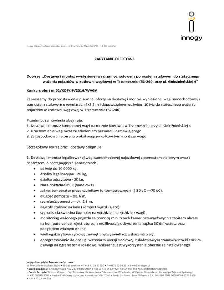 innogy Energetyka Trzemeszno Sp. z o.o. • ul. Powstańców Śląskich 28/30 • 53-333 Wrocław ZAPYTANIE OFERTOWE Dotyczy: „Dostawa i montaż wyniesionej wagi samochodowej z pomostem stalowym do statycznego ważenia pojazdów w kotłowni węglowej w Trzemesznie (62-240) przy ul. Gnieźnieńskiej 4” Konkurs ofert nr 02/KOF/JP/2016/WAGA Zapraszamy do przedstawienia pisemnej oferty na dostawę i montaż wyniesionej wagi samochodowej z pomostem stalowym o wymiarach 6x2,5 m i dopuszczalnym udźwigu 10 Mg do statycznego ważenia pojazdów w kotłowni węglowej w Trzemesznie (62-240). Przedmiot zamówienia obejmuje: 1. Dostawę i montaż kompletnej wagi na terenie kotłowni w Trzemesznie przy ul. Gnieźnieńskiej 4 2. Uruchomienie wagi wraz ze szkoleniem personelu Zamawiającego. 3. Zagospodarowanie terenu wokół wagi po całkowitym montażu wagi. Szczegółowy zakres prac i dostawy obejmuje: 1. Dostawę i montaż legalizowanej wagi samochodowej najazdowej z pomostem stalowym wraz z osprzętem, o następujących parametrach: udźwig do 10 0000 kg, działka legalizacyjna - 20 kg, działka odczytowa - 20 kg, klasa dokładności III (handlowa), zakres temperatur pracy czujników tensometrycznych - (-30 oC ÷+70 oC), długość pomostu – ok. 6 m, szerokość pomostu – ok. 2,5 m, najazdy stalowe na koła (komplet wjazd i zjazd) sygnalizacja świetlna (komplet na wjeździe i na zjeździe z wagi), monitoring ważonego pojazdu za pomocą min. trzech kamer przemysłowych z zapisem obrazu na komputerze lub rejestratorze, z możliwością odtworzenia zapisu 30 dni wstecz oraz podglądem zdalnym online, wielkogabarytowy cyfrowy zewnętrzny wyświetlacz wskazania wagi, oprogramowanie do obsługi ważenia w wersji sieciowej z dodatkowym stanowiskiem klienckim. Z uwagi na ograniczenia lokalowe, wskazane jest wykorzystanie obecnie zainstalowanego innogy Energetyka Trzemeszno Sp. z o.o. ul. Powstańców Śląskich 28/30 • 53-333 Wrocław • T +48 71 33 50 330 • F +48 71 33 50 331 • I www.innogyet.pl • Biuro lokalne: ul. Gnieźnieńska 4 • 62-240 Trzemeszno • T +48 61 415 64 02 • M + 48 509 699 844 • E [email protected] • Prezes Zarządu: Tadeusz Winiarz • Sąd Rejonowy dla Wrocławia-Fabrycznej we Wrocławiu, VI Wydział Gospodarczy Krajowego Rejestru Sądowego Nr KRS 0000083082 • Kapitał Zakładowy (opłacony w całości) 4.586.700 zł • Konto bankowe: Bank Millenium S.A. 54 1160 2202 0000 0001 6979 8138 • NIP: 557-15-10-903 sprzętu komputerowego. Parametry obecnie zainstalowanego sprzętu komputerowego przekażemy na żądanie Oferenta. 2.a) uruchomienie wagi wraz z kalibracją 2.b) legalizacja wagi, w tym transport wzorców masy niezbędnych do legalizacji, 2.c) przekazanie dokumentacji technicznej wagi 2.d) szkolenie personelu. 3. Zagospodarowanie terenu wokół wagi po całkowitym montażu wagi: usunięcie wszelkiego rodzaju odpadów powstałych przy pracach wykonywanych przez Wykonawcę. Warunkiem przyjęcia oferty jest przeprowadzenie wizji lokalnej terenu montażu wagi przez Oferenta. Okres gwarancji: min. 24 m-cy. Zamawiający na własny koszt i ryzyko przygotuje podłoża pod wagę oraz doprowadzi energię elektryczną w pobliże usytuowania wagi, na podstawie wytycznych Wykonawcy. Realizację całego zdania w zakresie: dostawa, montaż, uruchomienie, legalizacja wagi na terenie kotłowni szkoleniem pracowników Zamawiającego należy zakończyć do 30 dni kalendarzowych od podpisania umowy. Warunki ogólne: 1.Wizja lokalna jest obowiązkowa. Przeprowadzenie wizji lokalnej w terminie uzgodnionym ze Zleceniodawcą. 2.Zamawiający ma prawo zrezygnowania z wykonania zamówienia bez podania przyczyn. 3.Termin płatności za realizacje prac przelewem w terminie 30 dni od daty otrzymania faktury. Podstawą do wystawienia faktury jest obustronnie podpisany protokół odbioru. 4.Wszystkie prace winny być wykonywane zgodnie ze stosownymi w tym zakresie przepisami, w szczególności: BHP, p/poż. 5.Podstawą realizacji przedmiotu zamówienia jest: Niniejsze zapytanie; Wymagania z zakresu ochrony środowiska (załącznik nr 3 do niniejszego zapytania); Wymagania BHP (załącznik nr 4 do niniejszego zapytania); Kodeks Etyczny Grupy innogy (załącznik nr 5 do niniejszego zapytania). 6.W postępowaniu mogą wziąć udział Wykonawcy, którzy: a)posiadają uprawnienie do wykonywania określonej działalności lub czynności, b)posiadają niezbędną wiedzę i doświadczenie związane z przedmiotem przetargu, tj. udokumentują zrealizowanie w latach 2011÷2016 dostawę, montaż i uruchomienie 3 wag o parametrach podobnych jak waga objęta zamówieniem. c)dysponują potencjałem technicznym i osobami zdolnymi do wykonania zamówienia, d)znajdują się w sytuacji ekonomicznej i finansowej zapewniającej wykonanie zamówienia. 7.Zmawiający dopuszcza zastosowanie wyłącznie czujników tensometrycznych pochodzących od renomowanych europejskich lub amerykańskich (USA) producentów. Zaoferowanie przez Wykonawcę czujników pochodzących od innych producentów niż powyżej wymienionych, będzie skutkowało odrzuceniem oferty. Kryterium wyboru oferenta: Zamawiający do oceny ofert przyjął następujące kryteria z przypisanymi im wagami: cena netto 75%; okres gwarancji na wykonane prace 15%; czas realizacji 10%. Cena netto Wykonawca może uzyskać maksymalnie 75 pkt., waga kryterium – 75% Cena netto zostanie skalkulowany wg poniższego schematu: Najniższa cena netto spośród złożonych ofert C = ------------------------------------------------------------------------------------------- x 100 pkt. x 75% Cena netto badanej oferty Okres gwarancji na wykonane prace: Wykonawca może uzyskać maksymalnie 15 pkt., waga kryterium – 15% Okres gwarancji będzie oceniany według poniższego schematu: za 24 m-cy = 0 pkt, za każde kolejne 12 m-cy po 5 pkt. Czas realizacji: Wykonawca może uzyskać maksymalnie 10 pkt., waga kryterium – 10% Czas realizacji zadania oceniany według p