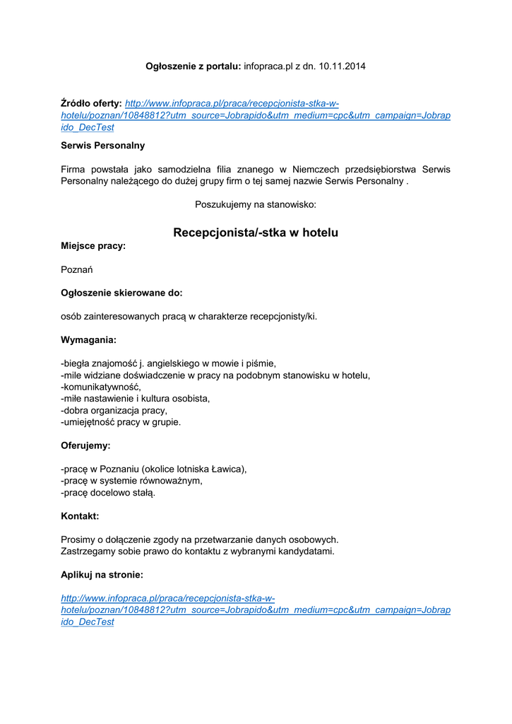 Ogłoszenie z portalu: infopraca.pl z dn. 10.11.2014 Źródło oferty: http://www.infopraca.pl/praca/recepcjonista-stka-whotelu/poznan/10848812?utm_source=Jobrapido&utm_medium=cpc&utm_campaign=Jobrap ido_DecTest Serwis Personalny Firma powstała jako samodzielna filia znanego w Niemczech przedsiębiorstwa Serwis Personalny należącego do dużej grupy firm o tej samej nazwie Serwis Personalny . Poszukujemy na stanowisko: Recepcjonista/-stka w hotelu Miejsce pracy: Poznań Ogłoszenie skierowane do: osób zainteresowanych pracą w charakterze recepcjonisty/ki. Wymagania: -biegła znajomość j. angielskiego w mowie i piśmie, -mile widziane doświadczenie w pracy na podobnym stanowisku w hotelu, -komunikatywność, -miłe nastawienie i kultura osobista, -dobra organizacja pracy, -umiejętność pracy w grupie. Oferujemy: -pracę w Poznaniu (okolice lotniska Ławica), -pracę w systemie równoważnym, -pracę docelowo stałą. Kontakt: Prosimy o dołączenie zgody na przetwarzanie danych osobowych. Zastrzegamy sobie prawo do kontaktu z wybranymi kandydatami. Aplikuj na stronie: http://www.infopraca.pl/praca/recepcjonista-stka-whotelu/poznan/10848812?utm_source=Jobrapido&utm_medium=cpc&utm_campaign=Jobrap ido_DecTest