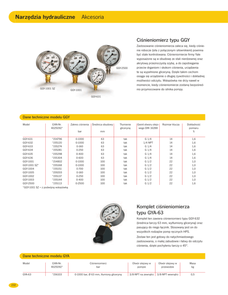 Akcesoria Narzędzia hydrauliczne Ciśnieniomierz typu GGY Zastosowanie ciśnieniomierza zaleca się, kiedy ciśnienie robocze (siła z połączonym siłownikiem) powinna być stale kontrolowana. Ciśnieniomierze firmy Yale wyposażone są w obudowę ze stali nierdzewnej oraz akrylową przezroczystą szybę, a do zapobiegania przeciw drganiom i skokom ciśnienia, urządzenia te są wypełnione gliceryną. Dzięki takim cechom osiąga się urządzenie o długiej żywotności i dokładnej możliwości odczytu. Wskazówka nie drży nawet w momencie, kiedy ciśnieniomierze zostaną bezpośrednio przymocowane do silnika pompy. GGY-2500 GGY-1001 SZ GGY-1001 GGY-631 Dane techniczne modelu GGY Model EAN-Nr. 4025092* GGY-631 *154796 GGY-632 *155120 GGY-633 *155274 GGY-634 *155281 GGY-635 *155298 GGY-636 *155304 GGY-1001 *154802 GGY-1001 SZ* *155168 GGY-1004 *155151 GGY-1005 *159203 GGY-1002 *155137 GGY-1003 *155144 GGY-2500 *155113 * GGY-1001 SZ = z podwójną wskazówką Zakres ciśnienia Średnica obudowy bar mm 0-1000 0-1000 0-160 0-250 0-400 0-600 0-1000 0-1000 0-700 0-160 0-250 0-400 0-2500 63 63 63 63 63 63 100 100 100 100 100 100 100 Tłumienie gliceryną Gwint otworu olejowego DIN 16288 Rozmiar klucza Dokładność pomiaru % tak tak tak tak tak tak tak tak tak tak tak tak tak G 1/4 1/4 NPT G 1/4 G 1/4 G 1/4 G 1/4 G 1/2 G 1/2 G 1/2 G 1/2 G 1/2 G 1/2 G 1/2 14 14 14 14 14 14 22 22 22 22 22 22 22 1,6 1,6 1,6 1,6 1,6 1,6 1,0 1,0 1,0 1,0 1,0 1,0 1,6 Komplet ciśnieniomierza typu GYA-63 Komplet ten zawiera ciśnieniomierz typu GGY-632 (średnica tarczy 63 mm, wytłumiony gliceryną) oraz pasujący do niego łącznik. Stosowany jest on do wszystkich rodzajów pomp ręcznych HPS. Zestaw ten jest gotowy do natychmiastowego zastosowania, o małej zabudowie i łatwy do odczytu ciśnienia, dzięki pochyleniu tarczy o 45°. Dane techniczne modelu GYA 232 Model EAN-Nr. 4025092* Ciśnieniomierz bar Otwór olejowy w pompie Otwór olejowy w przewodzie Masa kg GYA-63 *156103 0-1000 bar, Ø 63 mm, tłumiony gliceryną 3/8-NPT na zewnątrz 3/8-NPT wewnątrz 0,5 Narzędzia hydrauliczne Akcesoria Łącznik ciśnieniomierza typu GA Łącznik ten pasuje do wszystkich pomp typu HPS i ułatwia odczyt poprzez lekkie nachylenie podłączenia z ciśnieniomierzem. Dane techniczne modelu GA Model EAN-Nr. 4025092* Podłączenie ciśnieniomierza Otwór olejowy w pompie Otwór olejowy w przewpdzie hydraulicznym GA-700 GA-701 *155557 *155588 G 1/4 G 1/2 3/8-NPT zewnątrz 3/8-NPT zewnątrz 3/8-NPT wewnątrz 3/8-NPT wewnątrz Zestaw łączników ciśnieniomierza typu GA Zestaw tego typu łączników stosuje się w połączeniu z pompami ręcznymi dwustronnego działania typu HPH, do zamontowania między 4/2-drożnym zaworem a pompą. Właściwości • Zaleta: pokazuje zarówno siłę pchającą jak i ciągnącą podłączonego siłownika hydraulicznego. • Łatwość odczytu, poprzez lekkie nachylenie. • Cyrkulacja obniżonego ciśnienia poprzez złączke teleskopową. Dane techniczne modelu GA Model EAN-Nr. 4025092* Podłączenie ciśnieniomierza Otwór olejowy w pompie Złączka teleskopowa GA-703 GA-704 *155564 *156172 G 1/2 G-1/4 2 x 3/8-NPT zewnątrz 2 x 3/8-NPT zewnątrz 2 x 1/4-NPT zewnątrz 2 x 1/4-NPT zewnątrz Łącznik ciśnieniomierza typu GA-2000 Łącznik ten pasuje do wszystkich pomp ręcznych o ciśnieniu roboczym 2000 bar typu TWAZ, stosowany do ciśnieniomierza typu GGY-2500. Dane techniczne modelu GA Model GA-2000 EAN-Nr. 4025092* *155915 Maks.ciśnienie Podłączenie robocze ciśnieniomierza bar 2.000 G 1/2 Otwór olejowy w pompie Otwór olejowy w przewodzie hydraulicznym M22 x 1,5 zewnętrzny M22 x 1,5 wewnętrzny (z łącznikiem FY - 201) 233