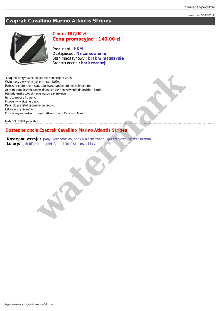 Informacje o produkcie Utworzono 02-03-2017 Czaprak Cavallino Marino Atlantis Stripes Cena : 187,00 zł Cena promocyjna : 140,00 zł Producent : HKM Dostępność : Na zamówienie Stan magazynowy : brak w magazynie Średnia ocena : brak recenzji Materiał: 100% poliester. er m ar k Czaprak firmy Cavallino Marino z kolekcji Atlantis. Wykonany z wysokiej jakości materiałów. Podszyty materiałem siateczkowym, bardzo dobrze wchłania pot. Anatomiczny kształt zapewnia najlepsze dopasowanie do grzbietu konia. Posiada grube wypełnienie watowo-piankowe Bardzo mocny i trwały. Pikowany w skośne pasy. Paski do przystuł zapinane na rzepy. Łatwy w czyszczeniu. Ozdobiony nadrukiem z kryształkami z logo Cavallino Marino. Dostępne opcje Czaprak Cavallino Marino Atlantis Stripes w at Dostępne wersje: pony ujeżdżeniowa, pony wszechstronna, ujeżdżeniowa, wszechstronna. kolory: gołębi/granat, gołębi/granat/kość słoniowa, biały. Wygenerowano w programie www.oscGold.com