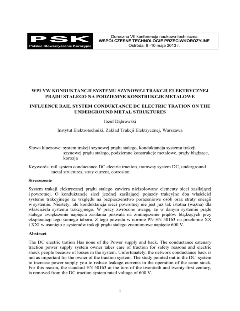 Doroczna VII konferencja naukowo-techniczna WSPÓŁCZESNE TECHNOLOGIE PRZECIWKOROZYJNE Ostróda, 8 -10 maja 2013 r. WPŁYW KONDUKTANCJI SYSTEMU SZYNOWEJ TRAKCJI ELEKTRYCZNEJ PRĄDU STAŁEGO NA PODZIEMNE KONSTRUKCJE METALOWE INFLUENCE RAIL SYSTEM CONDUKTANCE DC ELECTRIC TRATION ON THE UNDERGROUND METAL STRUKTURES Józef Dąbrowski Instytut Elektrotechniki, Zakład Trakcji Elektrycznej, Warszawa Słowa kluczowe: system trakcji szynowej prądu stałego, konduktancja systemu trakcji szynowej prądu stałego, podziemne konstrukcje metalowe, prądy błądzące, korozja Keywords: rail system conductance DC electric traction, tramway system DC, underground metal structures, stray current, corrosion Streszczenie System trakcji elektrycznej prądu stałego zawiera nieizolowane elementy sieci zasilającej i powrotnej. O konduktancje sieci jezdnej zasilającej pojazdy trakcyjne dba właściciel systemu trakcyjnego ze względu na bezpieczeństwo porażeniowe osób oraz straty energii w systemie. Niestety, ale konduktancja sieci powrotnej nie jest już tak istotna (ważna) dla właściciela systemu trakcyjnego. W pracy zwrócono uwagę, że w danym systemie prądu stałego zwiększenie napięcia zasilania pozwala na zmniejszenie prądów błądzących przy eksploatacji tego samego taboru. Z tego powodu w normie PN-EN 50163 na przełomie XX i XXI w usunięto z systemów trakcji prądu stałego znamionowe napięcie 600 V. Abstract The DC electric tration Has none of the Power supply and back. The conductance catenary traction power supply system owner takes care of traction for safety reasons and electric shock people because of losses in the system. Unfortunately, the network conductance back is not as important for the owner of the traction system. The study pointed out in the DC system to increase power supply you to reduce leakage currents in the operation of the same stock. For this reason, the standard EN 50163 at the turn of the twentieth and twenty-first century, is removed from the DC traction system rated voltage of 600 V. -1- Wstęp Według współczesnej terminologii kompatybilności elektromagnetycznej jednym z trzech oddziaływań na środowisko systemu (urządzenia lub aparatu) elektro- energoelektroniczno mechanicznego jest oddziaływanie konduktancyjne (galwaniczne). Zgodnie z definicja tego oddziaływania występuje ono w obwodach elektrycznych mających wspólny odcinek na którym występuje nakładanie się prądów i powstawanie spadków napięć oddziaływujących na sprzężone obwody. W trakcji elektrycznej typowym przykładem są obwody torowe w których prądy trakcyjne i prądy systemu zabezpieczania ruchu nakładają się w szynach jezdnych. Znane zjawisko prądów błądzących upływających z szyn jezdnych także należy traktować jako efekt sprzężenia konduktancyjnego szyn z ziemią i podziemną metalową infrastrukturą [1]. System trakcji prądu stałego Przez system szynowej trakcji elektrycznej rozumie się zestaw urządzeń rozłożony w przestrzeni, w którego skład wchodzą: podstacje trakcyjne, sieć trakcyjna zasilająca, tabor oraz sieć powrotna wraz z szynami [2, 3]. Podstacja trakcyjna służy do przetworzenia energii elektrycznej z rozdzielczej sieci 15 kV elektroenergetycznego systemu prądu przemiennego na energię prądu stałego z reguły o obniżonym napięciu [4] znamionowo do 600, 750 lub 3000 V [6]. Zapewnia to odpowiednio dobrany zespół transformatora i prostowników diodowych. Na podstacji znajduje się rozdzielnia prądu stałego umożliwiająca bezpieczne zasilanie poszczególnych odcinków trakcyjnej sieci zasilającej. Owo zasilanie realizowane jest za pomocą wyłączników zainstalowanych w specjalnych odpływowych (wyłącznikowych) polach rozdzielni. W trakcji miejskiej pola te zwane są zasilaczami, a energia prądu stałego z tego pola dostarczana jest kablami do poszczególnych odcinków sieci trakcyjnej. W trakcji kolejowej zasilaczem jest zwany kabel energetyczny łączący wyłącznikowe pole podstacji z odcinkiem przewodu jezdnego sieci trakcyjnej. Podstacja trakcyjna tramwajowa zasila jednostronnie od kilku do kilkunastu poszczególnych odcinków sieci. Każdy z takich odcinków sieci zasilającej wydzielony jest izolatorem sekcyjnym. Odcinki te tworzą obszar zasilania danej podstacji. Takimi samymi izolatorami sekcyjnymi jak poszczególne odcinki wydzielone w sieci są wydzielone obszary zasilania sąsiadujących ze sobą podstacji trakcyjnych. W przypadku metra i kolei ze względu na szlakowy charakter tych linii zdecydowanie częściej występują odcinki dwustronnie zasilane. Oznacza to, że odcinek sieci trakcyjnej zasilany jest jednocześnie z dwóch podstacji. Na kolei występują kabiny sekcyjne, które umożliwiają podział na odcinki jednostronnie zasilane, co ułatwia przeglądy i naprawy sieci trakcyjnej. Rejony zelektryfikowanych stacji kolejowych zasilane są z kolejowych podstacji trakcyjnych w identyczny sposób jak sieć tramwajowa. Powyższe wynika z faktu, że w obrębie stacji kolejowej występują równolegle ułożone tory szlakowe i postojowe oraz bocznice kolejowe (tory odstawcze). W każdym systemie trakcyjnym (kolejowym i tramwajowym oraz metra) szynowa sieć powrotna z założenia stanowi układ metalicznie połączonych elementów. Wstawienie dławików torowych w systemach kolejowych i metra wydziela jedynie obszary zasilania układów sterowania ruchem kolejowym, które są zasilane prądem przemiennym. Prąd trakcyjny wraca na podstację kablami powrotnymi. Z każdego obszaru zasilania kable powrotne zbiegają się w szafie kabli powrotnych, która w trakcji miejskiej najczęściej bywa elementem składowym rozdzielni prądu stałego, zaś w systemach kolejowych i metra stanowi oddzielną szafę. Odcinki sieci trakcyjne zasilającej zarówno systemu kolejowego jak i trakcji miejskiej – tramwajowej – są rozwieszone nad torowiskiem [7]. W przypadku metra odcinki te znajdują się w pobliżu 