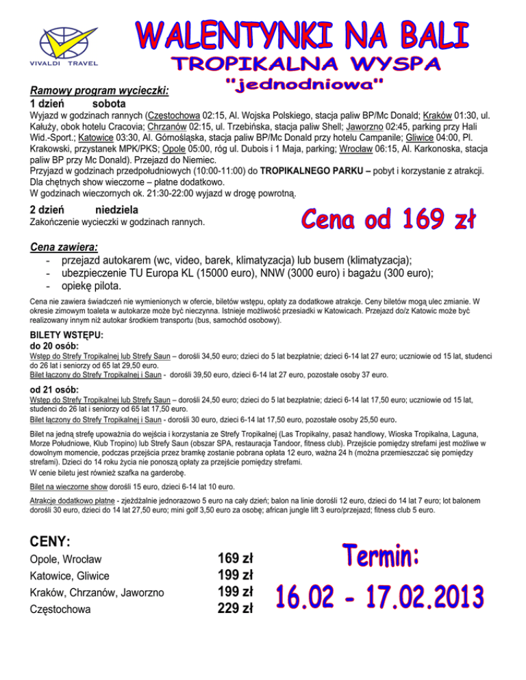 Ramowy program wycieczki: 1 dzień sobota Wyjazd w godzinach rannych (Częstochowa 02:15, Al. Wojska Polskiego, stacja paliw BP/Mc Donald; Kraków 01:30, ul. Kałuży, obok hotelu Cracovia; Chrzanów 02:15, ul. Trzebińska, stacja paliw Shell; Jaworzno 02:45, parking przy Hali Wid.-Sport.; Katowice 03:30, Al. Górnośląska, stacja paliw BP/Mc Donald przy hotelu Campanile; Gliwice 04:00, Pl. Krakowski, przystanek MPK/PKS; Opole 05:00, róg ul. Dubois i 1 Maja, parking; Wrocław 06:15, Al. Karkonoska, stacja paliw BP przy Mc Donald). Przejazd do Niemiec. Przyjazd w godzinach przedpołudniowych (10:00-11:00) do TROPIKALNEGO PARKU – pobyt i korzystanie z atrakcji. Dla chętnych show wieczorne – płatne dodatkowo. W godzinach wieczornych ok. 21:30-22:00 wyjazd w drogę powrotną. 2 dzień niedziela Zakończenie wycieczki w godzinach rannych. Cena zawiera: - przejazd autokarem (wc, video, barek, klimatyzacja) lub busem (klimatyzacja); - ubezpieczenie TU Europa KL (15000 euro), NNW (3000 euro) i bagażu (300 euro); - opiekę pilota. Cena nie zawiera świadczeń nie wymienionych w ofercie, biletów wstępu, opłaty za dodatkowe atrakcje. Ceny biletów mogą ulec zmianie. W okresie zimowym toaleta w autokarze może być nieczynna. Istnieje możliwość przesiadki w Katowicach. Przejazd do/z Katowic może być realizowany innym niż autokar środkiem transportu (bus, samochód osobowy). BILETY WSTĘPU: do 20 osób: Wstęp do Strefy Tropikalnej lub Strefy Saun – dorośli 34,50 euro; dzieci do 5 lat bezpłatnie; dzieci 6-14 lat 27 euro; uczniowie od 15 lat, studenci do 26 lat i seniorzy od 65 lat 29,50 euro. Bilet łączony do Strefy Tropikalnej i Saun - dorośli 39,50 euro, dzieci 6-14 lat 27 euro, pozostałe osoby 37 euro. od 21 osób: Wstęp do Strefy Tropikalnej lub Strefy Saun – dorośli 24,50 euro; dzieci do 5 lat bezpłatnie; dzieci 6-14 lat 17,50 euro; uczniowie od 15 lat, studenci do 26 lat i seniorzy od 65 lat 17,50 euro. Bilet łączony do Strefy Tropikalnej i Saun - dorośli 30 euro, dzieci 6-14 lat 17,50 euro, pozostałe osoby 25,50 euro. Bilet na jedną strefę upoważnia do wejścia i korzystania ze Strefy Tropikalnej (Las Tropikalny, pasaż handlowy, Wioska Tropikalna, Laguna, Morze Południowe, Klub Tropino) lub Strefy Saun (obszar SPA, restauracja Tandoor, fitness club). Przejście pomiędzy strefami jest możliwe w dowolnym momencie, podczas przejścia przez bramkę zostanie pobrana opłata 12 euro, ważna 24 h (można przemieszczać się pomiędzy strefami). Dzieci do 14 roku życia nie ponoszą opłaty za przejście pomiędzy strefami. W cenie biletu jest również szafka na garderobę. Bilet na wieczorne show dorośli 15 euro, dzieci 6-14 lat 10 euro. Atrakcje dodatkowo płatne - zjeżdżalnie jednorazowo 5 euro na cały dzień; balon na linie dorośli 12 euro, dzieci do 14 lat 7 euro; lot balonem dorośli 30 euro, dzieci do 14 lat 27,50 euro; mini golf 3,50 euro za osobę; african jungle lift 3 euro/przejazd; fitness club 5 euro. CENY: Opole, Wrocław Katowice, Gliwice Kraków, Chrzanów, Jaworzno Częstochowa 169 zł 199 zł 199 zł 229 zł TROPIKALNA WYSPA (Tropical Islands) - największy tropikalny park rozrywki i wypoczynku w Europie. Fascynująca kraina tropików pod dachem z prawdziwą plażą nad wodą, lasem tropikalnym oraz oryginalnymi budowlami z krajów ze strefy międzyzwrotnikowej. To cały dzień zabawy, radości i relaksu dla całej rodziny, dzień urlopu na tropikalnej wyspie. Mnóstwo atrakcji, dla młodszych i starszych, zapewnia rozrywkę prawie 24 godziny na dobę. Temperatura w ciągu dnia w Tropical Islands to 25°C w cieniu, woda w Morzu Południowym ma 28°C, w lagunie Bali 31°C. Tropikalna Wyspa dzieli się na dwie części: Strefę Tropików, w której znajdują się poniższe atrakcje oraz Strefę Saun. ATRAKCJE PARKU: Las tropikalny; Wioska Tropikalna - oryginalne budynki z Bali, Borneo, Tajlandii i Samoa zapraszają do zwiedzania. Tutaj usytuowana jest większość restauracji oraz pasaż handlowy. Dodatkowo wioska tropikalna jest miejscem odbywania się dziennych show na scenie Wayang; Klub Tropino - atrakcje dla najmłodszych, mnóstwo powierzchni do wspinania się, skakania i innych zabaw (tor kartingowy, obiekt do wspinaczki, rowery wodne, trampolina); zjeżdżalnie wodne - znajdujące się na 25 metrowej wieży są sensacją dla wszystkich klas wiekowych. Cztery różne zjeżdżalnie oferują różne możliwości, od łagodnego zjazdu rodzinnego po super-zjeżdżalnie z prędkością do 70 km/h; African Jungle Lift – fantastyczna zabawa dla amatorów mocnych wrażeń; balon - powietrznym balonem mogą jednocześnie wznieść się na wysokość 55 m 2 osoby, skąd można podziwiać widoki: Lasu Tropikalnego, Morza Południowego, Laguny Bali i Wioski Tropikalnej; druga opcja, to 20-minutowy lot nad tropikami; Morze Południowe – kąpiele dla całej rodziny. Morze południowe oferuje ogromną powierzchnię do pływania i na wszelkie inne wodne szaleństwa. Dla najmłodszych znajduje się tutaj specjalny brodzik. Na plaży pod palmami można zabawić się w "budowniczego zamków z piasku". Przy każdej pogodzie i prawie o każdej porze "prawdziwe" słońce gwarantuje naturalną opaleniznę; Laguna Bali - prawdziwą radość kąpieli zapewnia Laguna Bali. Tutaj czeka na 1200 m² pełnych romantycznej atmosfery. Sztuczna rzeka, podziemne zjeżdżalnie wodne i jacuzzi gwarantują świetną zabawę i relaks. Piasek, drzewa i palmy okalają brzeg, balijskie chaty, groty i typowa małpia skała przeniosą Państwa na Bali, na Wyspę Bogów. Tam gdzie Laguna graniczy z lasem tropikalnym, dzięki grotom i wodospadom można się tu poczuć jak w prawdziwej dżungli. Wieczorami i nocą basen Laguny zamienia się w romantycznie oświetloną krainę, przepełnioną magiczną grą kolorów; Fitness Club; mini golf - gra w mini golfa w skalnej krainie. Na sztucznej trawie o intensywnej zieleni, znajduje się 18 dołków z trasami o różnym stopn