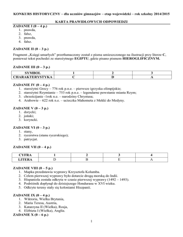 KONKURS HISTORYCZNY – dla uczniów gimnazjów – etap wojewódzki – rok szkolny 2014/2015 KARTA PRAWIDŁOWYCH ODPOWIEDZI ZADANIE I (0 – 4 p.) 1. prawda, 2. fałsz, 3. prawda, 4. fałsz. ZADANIE II (0 – 3 p.) Fragment „Księgi umarłych” przetłumaczony został z pisma umieszczonego na ilustracji przy literze C, ponieważ tekst pochodzi ze starożytnego EGIPTU, gdzie pisano pismem HIEROGLIFICZNYM. ZADANIE III (0 – 3 p.) SYMBOL CHARAKTERYSTYKA 1 C 2 D 3 A ZADANIE IV (0 – 4 p.) 1. starożytni Grecy – 776 rok p.n.e. – pierwsze igrzyska olimpijskie; 2. starożytni Rzymianie – 753 rok p.n.e. – legendarne powstanie miasta Rzym; 3. chrześcijanie -1rok n.e. – narodziny Chrystusa; 4. Arabowie – 622 rok n.e. – ucieczka Mahometa z Mekki do Medyny. ZADANIE V (0 – 3 p.) 1. dorycki; 2. joński; 3. koryncki. ZADANIE VI (0 – 3 p.) 1. stany, 2. rycerstwa (stanu rycerskiego); 3. patrycjat. ZADANIE VII (0 – 4 p.) CYFRA LITERA 1 D 2 B 3 E ZADANIE VIII (0 – 5 p.) 1. Mapka przedstawia wyprawy Krzysztofa Kolumba. 2. Celem pierwszej wyprawy było dotarcie drogą morską do Indii. 3. Hispaniola została odkryta w czasie pierwszej wyprawy (1492 – 1493). 4. Podróżnik dopłynął do dzisiejszego Hondurasu w XVI wieku. 5. Odkryte tereny stały się koloniami Hiszpanii. ZADANIE IX (0 – 4 p.) 1. Wiktoria, Wielka Brytania, 2. Maria Teresa, Austria, 3. Katarzyna II (Wielka), Rosja, 4. Elżbieta I (Wielka), Anglia. ZADANIE X (0 – 6 p.) 1 4 A 1 J 2 U S T W Ł O D Z I M I E Y N I A N 3 T E O D O Z J U S Z 4 A L E K S A N D E R 5 K A R O L P I O T R 6 R Z ZADANIE XI (0 – 10 p.) ZADANIE 1 2 3 4 5 6 7 8 9 10 ODPOWIEDŹ A A D B C A B D C A ZADANIE XII (0 – 3 p.) NUMER INFORMACJI 1 2 3 NAZWA REWOLUCJI październikowa francuska lutowa ZADANIE XIII (0 – 3 p.) 1. Podpisanie „Deklaracji niepodległości”; 2. Bostońskie picie herbaty (wrzucenie angielskiej herbaty do morza w Bostonie); 3. Uchwalenie konstytucji USA. ZADANIE XIV (0 – 4 p.) 1. prawda, 2. prawda, 3. fałsz, 4. fałsz. ZADANIE XV (0 – 4 p.) WYNALAZKI XIX WIEKU – cyfry : 1, 3, 4, 6 ZADANIE XVI (0 – 3 p.) 1. Franciszka Ferdynanda, 2. Sarajewie, 3. 28 czerwca 1914. ZADANIE XVII (0 – 4 p.) 1. sierpień 1914, 2. kwiecień 1917, 3. marzec 1918, 4. listopad 1918. ZADANIE XVIII (0 – 10 p.) 1. Kazimierz Jagiellończyk, 2. Bolesław Chrobry, 3. Władysław IV, 4. Władysław Łokietek, 5. Stefan Batory, 6. Kazimierz Wielki, 7. Jan III Sobieski, 8. Stanisław August Poniatowski, 9. Zygmunt I Stary, 10. Zygmunt III Waza. 2 ZADANIE XIX (0 – 7 p.) WŁADCA MAŁŻONKA Mieszko I Mieszko II Bolesław Krzywousty Kazimierz Wielki Władysław Jagiełło Zygmunt I Stary Zygmunt II August Dobrawa Rycheza Salomea Aldona Anna Jadwiga Bona Sforza Barbara Radziwiłówna ZADANIE XX (0 – 8 p.) 1 2 G D A Ń I A W A R M 3 T O R U Ń C H O J N I C E Ś W I E C 5 6 K R A K Ó W 7 M A L B O R M U D Ź Ż S K I N O K ZADANIE XXI (0 – 8 p.) A. Źródło 1 - KREWO Źródło 2 – LUBLIN B. Źródło 1 – wiek XIV, Źródło 2 – wiek XVI. C. UNIA – dobrowolny związek dwóch lub więcej państw, oparty na warunkach korzystnych dla każdej ze stron. D. uczeń wymienia DWA państwa spośród: Czechy, Węgry, Szwecja, Saksonia. ZADANIE XXII (0 – 4 p.) BITWY Z ROSJĄ ZE SZWECJĄ Z TURCJĄ Z KOZAKAMI LITERA OZNACZAJĄCA DRUGĄ W KOLEJNOŚCI C A C B ZADANIE XXIII (0 – 9 p.) 1. Jan Zamoyski, 2. Wyznawcy judaizmu (Żydzi), prawosławni, katolicy, Ormianie (chrześcijanie). 3. Synagoga – kościół (świątynia) wyznawców judaizmu, dom modlitwy Żydów. Cerkiew – kościół (świątynia) wyznawców prawosławia. 4. Budowla znajduje się na Rynku Wielkim. 5. Styl renesansowo – barokowy (ewentualnie: renesansowy; barokowy) 3 ZADANIE XXIV (0 – 5 p.) 1. szlachtę, mieszczan, chłopów, 2. sejm, 3. wstrzymywać, 4. sejm, 5. dziedziczna. ZADANIE XXV (0 – 10 p.) PISARZE HETMANI MALARZE GENERAŁOWIE DZIAŁACZE POLITYCZNI Eliza Orzeszkowa Julian Ursyn Niemcewicz Stanisław Koniecpolski Stefan Czarniecki Artur Grottger Józef Chełmoński Józef Chłopicki Jan Skrzynecki Roman Dmowski Róża Luksemburg ZADANIE XXVI (0 – 9 p.) 1. 2. 3. 4. 5. 6. 7. 8. 9. Kraj Nadwiślański, Szkoły Głównej, germanizacji, Kulturkampf, Komisję Kolonizacyjną, Hakaty, autonomię, Sejm Krajowy, Akademia Umiejętności. 4 5