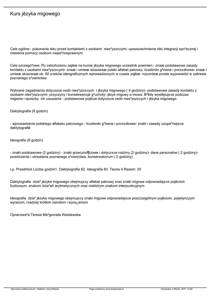 Kurs jêzyka migowego Cele ogólne:- pokonanie leku przed kontaktami z osobami nies³ysz±cymi- upowszechnienie idei integracji spo³ecznej i niesienia pomocy osobom niepe³nosprawnym Cele szczegó³owe: Po zakoñczeniu zajêæ na kursie jêzyka migowego uczestnik powinien:- znaæ podstawowe zasady kontaktu z osobami nies³ysz±cymi- znaæ i umieæ stosowaæ polski alfabet palcowy, liczebniki g³ówne i porz±dkowe- znaæ i umieæ stosowaæ ok. 60 znaków ideograficznych wprowadzonych w czasie zajêæ- rozumieæ proste wypowiedzi w zakresie poznanego s³ownictwa Wybrane zagadnienia dotycz±ce osób nies³ysz±cych i jêzyka migowego ( 4 godziny)- podstawowe zasady kontaktu z osobami nies³ysz±cymi- przyczyny i konsekwencje g³uchoty- jêzyk migowy a mowa. B³êdy wystêpuj±ce podczas migania i sposoby ich usuwania - podstawowe pojêcia dotycz±ce osób nies³ysz±cych i jêzyka migowego Daktylografia (8 godzin) - wprowadzenie polskiego alfabetu palcowego - liczebniki g³ówne i porz±dkowe- znaki i zasady uzupe³niaj±ce daktylografiê Ideografia (8 godzin) - znaki podstawowe (2 godziny) - znaki grzeczno¶ciowe i dotycz±ce rodziny (2 godziny)- dane personalne ( 2 godziny)powtórzenie i utrwalanie poznanego s³ownictwa, konserwatorium ( 2 godziny) Lp. Przedmiot Liczba godzin1. Daktylografia 82. Ideografia 83. Teoria 4 Razem: 20 Daktylografia dzia³ jêzyka migowego obejmuj±cy alfabet palcowy oraz znaki migowe odpowiadaj±ce pojêciom liczbowym, znakom dzia³añ arytmetycznych oraz niektórym znakom interpunkcyjnym Ideografia dzia³ jêzyka migowego obejmuj±cy znaki migowe odpowiadaj±ce poszczególnym pojêciom, pojedynczym wyrazom, rzadziej krótkim zwrotom i wyra¿eniom Opracowa³a:Teresa Ma³gorzata Wasilewska http://www.malbork.pl/um/ - Malbork, Urz±d Miasta Page created by www.kraszewski.pl Generated: 2 March, 2017, 12:48
